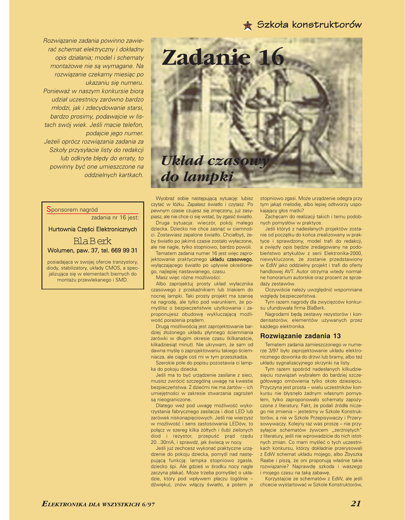 Szkoła konstruktorów Rozwiązanie zadania powinno zawie− rać schemat elektryczny i dokładny opis działania; model i schematy montażowe nie są wymagane. Na rozwiązanie czekamy miesiąc po ukazaniu się numeru. Ponieważ w naszym konkursie biorą udział uczestnicy zarówno bardzo młodzi, jak i zdecydowanie starsi, bardzo prosimy, podawajcie w lis− tach swój wiek. Jeśli macie telefon, podajcie jego numer. Jeżeli oprócz rozwiązania zadania za Szkoły przysyłacie listy do redakcji lub odkryte błędy do erraty, to powinny być one umieszczone na oddzielnych kartkach. S ponsorem nagród zadania nr 16 jest: Hurtownia Części Elektronicznych BlaBerk Wolumen, paw. 37, tel. 669 99 31 posiadająca w swojej ofercie tranzystory, diody, stabilizatory, układy CMOS, a spec− jalizująca się w elementach biernych do montażu przewlekanego i SMD. Zadanie 16 Układ czasowy do lampki Wyobraź sobie następującą sytuację: lubisz czytać w łóżku. Zapalasz światło i czytasz. Po pewnym czasie czujesz się zmęczony, już zasy− piasz, ale nie chce ci się wstać, by zgasić światło. Druga sytuacja: wieczór, pokój małego dziecka. Dziecko nie chce zasnąć w ciemnoś− ci. Zostawiasz zapalone światło. Chciałbyś, że− by światło po jakimś czasie zostało wyłaczone, ale nie nagle, tylko stopniowo, bardzo powoli. Tematem zadania numer 16 jest więc zapro− jektowanie praktycznego układu czasowego, wyłączającego światło po upływie określone− go, najlepiej nastawianego, czasu. Masz więc różne możliwości: Albo zaprojektuj prosty układ wyłacznika czasowego z przekaźnikiem lub triakiem do nocnej lampki. Taki prosty projekt ma szansę na nagrodę, ale tylko pod warunkiem, że po− myślisz o bezpieczeństwie użytkowania i za− proponujesz obudowę wykluczającą możli− wość porażenia prądem. Drugą możliwością jest zaprojektowanie bar− dziej złożonego układu płynnego ściemniania żarówki w długim okresie czasu (kilkanaście, kilkadziesiąt minut). Nie ukrywam, że sam od dawna myślę o zaprojektowaniu takiego ściem− niacza, ale ciągle coś mi w tym przeszkadza. Szerokie pole do popisu pozostawia ci lamp− ka do pokoju dziecka. Jeśli ma to być urządzenie zasilane z sieci, musisz zwrócić szczególną uwagę na kwestie bezpieczeństwa. Z dziećmi nie ma żartów – ich umiejętności w zakresie stwarzania zagrożeń są nieograniczone. Dlatego weź pod uwagę możliwość wyko− rzystania fabrycznego zasilacza i diod LED lub zarówek niskonapięciowych. Jeśli nie wierzysz w możliwość i sens zastosowania LEDów, to połącz w szereg kilka żółtych i (lub) zielonych diod i rezystor, przepuść prąd rzędu 20...30mA, i sprawdź, jak świecą w nocy. Jeśli już zechcesz wykonać praktyczne urzą− dzenie do pokoju dziecka, pomyśl nad nastę− pującą funkcją: lampka stopniowo zgasła, dziecko śpi. Ale gdzieś w środku nocy nagle zaczyna płakać. Może trzeba pomyśleć o ukła− dzie, który pod wpływem płaczu (ogólnie – dźwięku), znów włączy światło, a potem je ELEKTRONIKA DLA WSZYSTKICH 6/97 stopniowo zgasi. Może urządzenie odegra przy tym jakąś melodię, albo lepiej odtworzy uspo− kajający głos matki? Zachęcam do realizacji takich i temu podob− nych pomysłów w praktyce. Jeśli któryś z nadesłanych projektów zosta− nie od początku do końca zrealizowany w prak− tyce i sprawdzony, model trafi do redakcji, a zwięzły opis będzie zredagowany na podo− bieństwo artykułów z serii Elektronika−2000, niewykluczone, że zostanie przedstawiony w EdW jako oddzielny projekt i trafi do oferty handlowej AVT. Autor otrzyma wtedy normal− ne honorarium autorskie oraz procent ze sprze− daży zestawów. Oczywiście należy uwzględnić wspomniane względy bezpieczeństwa. Tym razem nagrody dla zwycięzców konkur− su ufundowała firma BlaBerk. Nagrodami będą zestawy rezystorów i kon− densatorów, elementów używanych przez każdego elektronika. Rozwiązanie zadania 13 Tematem zadania zamieszczonego w nume− rze 3/97 było zaprojektowanie układu elektro− nicznego dzwonka do drzwi lub bramy, albo też układu sygnalizacyjnego skrzynki na listy. Tym razem spośród nadesłanych kilkudzie− sięciu rozwiązań wybrałem do bardziej szcze− gółowego omówienia tylko około dziesięciu. Przyczyna jest prosta – wielu uczestników kon− kursu nie błysnęło żadnym własnym pomys− łem, tylko zaproponowało schematy zapoży− czone z literatury. Fakt, że podali źródła nicze− go nie zmienia – jesteśmy w Szkole Konstruk− torów, a nie w Szkole Przepisywaczy i Przery− sowywaczy. Kolejny raz was proszę – nie przy− syłajcie schematów żywcem „zerżniętych” z literatury, jeśli nie wprowadzicie do nich istot− nych zmian. Co mam myśleć o tych uczestni− kach konkursu, którzy dokładnie przerysowali z EdW schemat układu mojego, albo Zbyszka Raabe i piszą, że oni proponują właśnie takie rozwiązanie? Naprawdę szkoda i waszego i mojego czasu na taką zabawę. Korzystajcie ze schematów z EdW, ale jeśli chcecie wystartować w Szkole Konstruktorów, 21 Szkoła konstruktorów Rys. 1. Mówiący dzwonek autorstwa Mariusza Ciołka. to powinniście jakoś taki schemat twórczo zmienić, po prostu dopasować i dostosować do danych potrzeb. Zaczęłem, jak widzicie od słów krytyki. Z tym większą przyjemnością stwierdzam, że wśród nadesłanych rozwiązań znalazłem kilka oryginalnych, samodzielnych opracowań te− matu. Mało tego, niektórzy Autorzy takich war− tościowych prac piszą wyraźnie, że to właśnie Szkoła Konstruktorów zmobilizowała ich i ośmieliła do podjęcia się najpierw projekto− wania na papierze, a potem do praktycznego sprawdzenia swoich pomysłów. Takie listy są dla mnie dowodem, że trud wkładany w prowadzenie Szkoły nie idzie na marne. Jestem bardzo zadowolony, że w ostatnich miesiącach ujawniło 