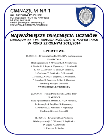GIMNAZJUM NR 1 im. Tadeusza Kościuszki Pl. Słowackiego 14; 34-400 Nowy Targ tel. (018) 26-659-44 e-mail: [email protected] http://www.gimnazjum1.nowytarg.pl NAJWAŻNIEJSZE OSIĄGNIĘCIA UCZNIÓW GIMNAZJUM NR 1 IM. TADEUSZA KOŚCIUSZKI W NOWYM TARGU W ROKU SZKOLNYM 2013/2014 SPORTOWE 16.09.2013r. – IV turniej piłkarski „ORLIKI” o puchar premiera Donalda Tuska Skład reprezentacji: J. Młynarczyk, B. Nowakowski, A. Musiorski, J. Repa, K. Zapotoczny, H. Pawłowski, K. Fic, D. Zaryczny, M. Buoso, P. Szopiński, H. Czubernat, T. Batkiewicz, O. Bryniarski, J. Mrożek, J. Cyrus, S. Szopiński, K. Woźniczka, P. Knutelski, B. Szewczyk, B. Ryt, S. Zborowski Opiekun p. Grzegorz Denenfeld AWANS DO KOLEJNEJ RUNDY 20.09.2013r. – Turniej Donalda Tuska „Orliki 2013” III MIEJSCE Skład reprezentacji: J. Mrożek, K. Fic, P. Knutelski, B. Szewczyk, S. Szopiński, K. Zapotoczny, H. Pawłowski, A. Musiorski, J. Młynarczyk Opiekun p. Grzegorz Denenfeld 01.10.2013r. – Powiatowe Biegi Przełajowe Skład reprezentacji: D. Widurski, B. Fryźlewicz, D. Ligęza, K. Zborowski L. Kupczyk, D. Kusiak, 1 GIMNAZJUM NR 1 im. Tadeusza Kościuszki Pl. Słowackiego 14; 34-400 Nowy Targ tel. (018) 26-659-44 e-mail: [email protected] http://www.gimnazjum1.nowytarg.pl U. Tokarczyk – awans do zawodów wojewódzkich 09.10.2013r. – Wojewódzkie Biegi Przełajowe Skład reprezentacji: U. Tokarczyk 15.10.2013r. – zawody halowej piłki nożnej dziewcząt – Gimnazjada Ośrodka Nowy Targ IV MIEJSCE Skład reprezentacji: P. Bryczka, S. Garlicka, A. Misiura, N. Ogrodniczek, B. Pcion, W. Suska, O. Pawlikowska, K, Siaśkiewicz, A. Skrzypek, A. Petryla Opiekun p. Robert Szopiński 15.10.2013r. – Zawody halowej piłki nożnej chłopców – Gimnazjada Ośrodka Nowy Targ II MIEJSCE awans do zawodów powiatowych Skład reprezentacji: J. Mrożek, P. Knutelski, J.Korczak, K. Szlachtowski, K. Fąfrowicz, J. Udziela, K. Zborowski, J. Żółtek, J. Jabłonski, M. Krajewski, D. Widurski Opiekun p. Robert Szopiński 30.10.2013r. – Powiatowe Zawody w halowej piłce nożnej chłopców V MIEJSCE Skład reprezentacji: J. Mrożek, P. Knutelski, J.Korczak, K. Szlachtowski, K. Fąfrowicz, J. Udziela, K. Zborowski, J. Żółtek, J. Jabłonski, M. Krajewski, D. Widurski 2 GIMNAZJUM NR 1 im. Tadeusza Kościuszki Pl. Słowackiego 14; 34-400 Nowy Targ tel. (018) 26-659-44 e-mail: [email protected] http://www.gimnazjum1.nowytarg.pl Opiekun p. Robert Szopiński 04.11.2013r. – Szkolna Liga w Strzelectwie Sportowym Skład drużyny: dziewczęta – J. Adamska, N. Nowak, U. Tokarczyk, M. Kuraś chłopcy – J. Udziela, K. Krzeszowski, K. Zborowski, B. Kołaciak Opiekun p. Tomasz Kędzior/ p. Dawid Pietrzak 07.11.2013r. – Powiatowe Zawody w unihokeju dziewcząt I MIEJSCE awans do zawodów wojewódzkich Skład drużyny: O. Jaskółka, A. Skrzypek, P. Fryźlewicz, P. Worwa, M. Firek, A. Sienka, B. Jędrol, J. Wolska, D. Fryźlewicz, O. Gromada, M. Landowska, I. Archacka, N. Garb Opiekun p. Robert Szopiński 08.11.2013r. – Powiatowe Zawody w unihokeju chłopców I MIEJSCE awans do zawodów wojewódzkich Skład drużyny: W. Staszel, R. Dzioboń, F. Dominik, P. Sulka, D. Widurski, K. Bryniarski, B. Kowalski, R. Konieczko, J. Piędel, M. Krajewski, H. Pawłowski, J. Udziela, J. Klimowski Opiekun p. Grzegorz Denenfeld 13.11.2013r. – Wojewódzkie Zawody w unihokeju dziewcząt II MIEJSCE Skład drużyny: O. Jaskółka, A. Skrzypek, P. Fryźlewicz, 3 GIMNAZJUM NR 1 im. Tadeusza Kościuszki Pl. Słowackiego 14; 34-400 Nowy Targ tel. (018) 26-659-44 e-mail: [email protected] http://www.gimnazjum1.nowytarg.pl P. Worwa, M. Firek, A. Sienka, B. Jędrol, J. Wolska, D. Fryźlewicz, O. Gromada, M. Landowska, I. Archacka, N. Garb Opiekun p. Robert Szopiński 13.11.2013r. – Szkolna Liga w Strzelectwie Sportowym V MIEJSCE drużynowo III miejsce indywidualnie – Karol Zborowski Skład drużyny: dziewczęta – J. Adamska, N. Nowak, U. Tokarczyk, L. Kupczyk chłopcy – J. Udziela, K. Krzeszowski, K. Zborowski, Opiekun p. Tomasz Kędzior 14.11.2013r. – Wojewódzkie Zawody w unihokeju chłopców II MIEJSCE Skład drużyny: W. Staszel, R. Dzioboń, F. Dominik, P. Sulka, D. Widurski, K. Bryniarski, B. Kowalski, R. Konieczko, J. Piędel, M. Krajewski, H. Pawłowski, J. Udziela, J. Klimowski Opiekun p. Grzegorz Denenfeld 13.12.2013r. – Gimnazjada Ośrodka Nowy Targ w koszykówce dziewcząt II MIEJSCE Skład drużyny: Z. Zubek, S. Zubek, K. Kobylarczyk, E. Jędrol, J. Jaskierska, N. Atanasow Ancew, M. Kuraś, N. Nowak, Z. Bryniarska, N. Lesner, 4 GIMNAZJUM NR 1 im. Tadeusza Kościuszki Pl. Słowackiego 14; 34-400 Nowy Targ tel. (018) 26-659-44 e-mail: [email protected] http://www.gimnazjum1.nowytarg.pl O. Bala, K. Repa Opiekun p. Joanna Skibińska Gąsior 18.12.2013r. – Powiatowa Gimnazjada w tenisie stołowym I MIEJSCE Skład drużyny: W. Stopka, B. Królikowski, P. Kolasa Opiekun: p. Tomasz Kędzior 20.12.2013r. - Gimnazjada Ośrodka Nowy Targ w koszykówce chłopców III MIEJSCE Skład drużyny: S. Janik, M. Nikołaj, K. Huzior, M. Krajewski, M. Migiel, J. Pindel, K. Haas, J. Mrożek Opiekun p. Joanna Skibińska Gąsior Karolina Pieprzak – mistrzyni Polski w narciarstwie alpejskim Junior C - I miejsce w XXVI lidze dzieci i Młodzieży w narciarstwie zjazdowym Małopolskiego Okręgowego Związku Narciarskiego 14.02.2014r. –Akcja Zarządu powiatowego LOK „Zima 2014” konkurencja Kpn20 I miejsce – Kamil Krzeszowski II miejsce – Agnieszka Galarowicz 20.02.2014r. - Gimnazjada Ośrodka Nowy Targ w snowboardzie dziewcząt i chłopców I miejsce drużyny dziewcząt 5 GIMNAZJUM NR 1 im. Tadeusza Kościuszki Pl. Słowackiego 14; 34-400 Nowy Targ tel. (018) 26-659-44 e-mail: [email protected] http://www.gimnazjum1.nowytarg.pl II miejsce drużyny chłopców Skład drużyny dziewcząt: P. Pawlikowska – I miejsce indywidualnie, M. Cewiło – III miejsce indywidualnie, A. Borzęcka Skład drużyny chłopców: K. Jędrol – III miejsce indywidualni