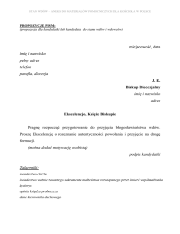 STAN WDÓW – ANEKS DO MATERIAŁÓW POMOCNICZYCH DLA KOŚCIOŁA W POLSCE PROPOZYCJE PISM: (propozycja dla kandydatki lub kandydata do stanu wdów i wdowców) miejscowość, data imię i nazwisko pełny adres telefon parafia, diecezja J. E. Biskup Diecezjalny imię i nazwisko adres Ekscelencjo, Księże Biskupie Pragnę rozpocząć przygotowanie do przyjęcia błogosławieństwa wdów. Proszę Ekscelencję o rozeznanie autentyczności powołania i przyjęcie na drogę formacji. (można dodać motywację osobistą) podpis kandydatki Załączniki: świadectwo chrztu świadectwo ważnie zawartego sakramentu małżeństwa rozwiązanego przez śmierć współmałżonka życiorys opinia księdza proboszcza dane kierownika duchowego STAN WDÓW – ANEKS DO MATERIAŁÓW POMOCNICZYCH DLA KOŚCIOŁA W POLSCE 2 propozycja pism dla kandydatki lub kandydata do stanu wdów i wdowców miejscowość, data imię i nazwisko pełny adres telefon parafia, diecezja J. E. Biskup Diecezjalny imię i nazwisko adres Ekscelencjo, Księże Biskupie Zwracam się z prośbą o włączenie mnie do stanu wdów poprzez obrzęd błogosławieństwa wdów. podpis kandydatki Załączniki: świadectwo chrztu opinia delegata biskupa diecezjalnego odpowiedzialnego za formację STAN WDÓW – ANEKS DO MATERIAŁÓW POMOCNICZYCH DLA KOŚCIOŁA W POLSCE propozycja pism dla kandydatki lub kandydata do stanu wdów i wdowców ŻYCIORYS imię i nazwisko obywatelstwo data i miejsce urodzenia data i miejsce chrztu data zawarcia sakramentu małżeństwa data śmierci współmałżonka telefon adres zamieszkania (pełny) adres do korespondencji parafia zamieszkania diecezja wykształcenie 3 STAN WDÓW – ANEKS DO MATERIAŁÓW POMOCNICZYCH DLA KOŚCIOŁA W POLSCE propozycja pism dla kandydatki lub kandydata do stanu wdów i wdowców historia zatrudnienia posługa w Kościele oświadczenie kandydatki, że zawarła sakrament małżeństwa raz w życiu motywacja miejscowość, data podpis 4 STAN WDÓW – ANEKS DO MATERIAŁÓW POMOCNICZYCH DLA KOŚCIOŁA W POLSCE propozycja pism dla kandydatki lub kandydata do stanu wdów i wdowców Propozycja formularza pomocniczego dla proboszcza parafii, z której pochodzi kandydatka Opinia o kandydatce do stanu wdów (imię i nazwisko kandydatki) 1. Czy kandydatka przyjmuje doktrynę i dyscyplinę Kościoła? 2. Jak przejawia się wiara kandydatki w praktyce? (formacja, modlitwa, życie sakramentalne, dzieła miłosierdzia) 3. Czy kandydatka angażuje się w konkretne formy apostolstwa w parafii i diecezji? Jakie? 4. Czy kandydatka jest osobą dojrzałą duchowo i psychicznie? Czy jest wolna w podejmowaniu decyzji dotyczących jej życia? 5 STAN WDÓW – ANEKS DO MATERIAŁÓW POMOCNICZYCH DLA KOŚCIOŁA W POLSCE propozycja pism dla kandydatki lub kandydata do stanu wdów i wdowców 5. Czy kandydatka ważnie zawarła sakrament małżeństwa i czy nie żyła publicznie w związku niesakramentalnym? 6. Czy kandydatka przez swój wiek, roztropność i obyczaje daje rękojmię, że wytrwa w życiu czystym oraz poświęconym służbie Kościołowi i bliźnim w świecie? 7. Inne uwagi miejscowość, data pieczęć i podpis 6