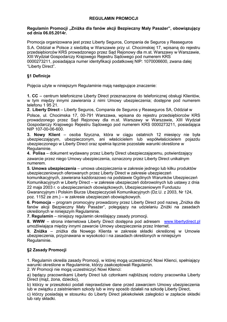 REGULAMIN PROMOCJI Regulamin Promocji „Zniżka dla fanów akcji Bezpieczny Mały Pasażer”, obowiązujący od dnia 06.05.2014r. Promocja organizowana jest przez Liberty Seguros, Compania de Seguros y Reaseguros S.A. Oddział w Polsce z siedzibą w Warszawie przy ul. Chocimskiej 17, wpisaną do rejestru przedsiębiorców KRS prowadzonego przez Sąd Rejonowy dla m.st. Warszawy w Warszawie, XIII Wydział Gospodarczy Krajowego Rejestru Sądowego pod numerem KRS 0000273211, posiadająca numer identyfikacji podatkowej NIP: 1070006600, zwana dalej “Liberty Direct”. §1 Definicje Pojęcia użyte w niniejszym Regulaminie mają następujące znaczenie: 1. CC – centrum telefoniczne Liberty Direct przeznaczone do telefonicznej obsługi Klientów, w tym między innymi zawierania z nimi Umowy ubezpieczenia; dostępne pod numerem telefonu 1 95 21. 2. Liberty Direct – Liberty Seguros, Compania de Seguros y Reaseguros SA, Oddział w Polsce, ul. Chocimska 17, 00-791 Warszawa, wpisana do rejestru przedsiębiorców KRS prowadzonego przez Sąd Rejonowy dla m.st. Warszawy w Warszawie, XIII Wydział Gospodarczy Krajowego Rejestru Sądowego pod numerem KRS 0000273211, posiadająca NIP 107-00-06-600. 3. Nowy Klient – osoba fizyczna, która w ciągu ostatnich 12 miesięcy nie była ubezpieczającym, ubezpieczonym, ani właścicielem lub współwłaścicielem pojazdu ubezpieczonego w Liberty Direct oraz spełnia łącznie pozostałe warunki określone w Regulaminie. 4. Polisa – dokument wydawany przez Liberty Direct ubezpieczającemu, potwierdzający zawarcie przez niego Umowy ubezpieczenia, oznaczony przez Liberty Direct unikalnym numerem. 5. Umowa ubezpieczenia – umowa ubezpieczenia w zakresie jednego lub kilku produktów ubezpieczeniowych oferowanych przez Liberty Direct w zakresie ubezpieczeń komunikacyjnych, zawierana każdorazowo na podstawie Ogólnych Warunków Ubezpieczeń Komunikacyjnych w Liberty Direct – w zakresie ubezpieczeń dobrowolnych lub ustawy z dnia 22 maja 2003 r. o ubezpieczeniach obowiązkowych, Ubezpieczeniowym Funduszu Gwarancyjnym i Polskim Biurze Ubezpieczycieli Komunikacyjnych (Dz.U. z 2003, Nr 124, poz. 1152 ze zm.) – w zakresie ubezpieczeń obowiązkowych. 6. Promocja – program promocyjny prowadzony przez Liberty Direct pod nazwą „Zniżka dla fanów akcji Bezpieczny Mały Pasażer”, polegający na udzielaniu Zniżki na zasadach określonych w niniejszym Regulaminie. 7. Regulamin – niniejszy regulamin określający zasady promocji. 8. WWW – strona internetowa Liberty Direct dostępna pod adresem www.libertydirect.pl umożliwiająca między innymi zawarcie Umowy ubezpieczenia przez Internet. 9. Zniżka – zniżka dla Nowego Klienta w zakresie składki określonej w Umowie ubezpieczenia, przyznawana w wysokości i na zasadach określonych w niniejszym Regulaminie. §2 Zasady Promocji 1. Regulamin określa zasady Promocji, w której mogą uczestniczyć Nowi Klienci, spełniający warunki określone w Regulaminie, którzy zaakceptowali Regulamin. 2. W Promocji nie mogą uczestniczyć Nowi Klienci: a) będący pracownikami Liberty Direct lub członkami najbliższej rodziny pracownika Liberty Direct (mąż, żona, dziecko), b) którzy w przeszłości podali nieprawdziwe dane przed zawarciem Umowy ubezpieczenia lub w związku z zaistnieniem szkody lub w inny sposób działali na szkodę Liberty Direct, c) którzy posiadają w stosunku do Liberty Direct jakiekolwiek zaległości w zapłacie składki lub raty składki. 3. Nowym Klientem w rozumieniu niniejszego Regulaminu może zostać wyłącznie osoba, która spełnia łącznie wszystkie warunki określone w Regulaminie, podała podczas zawierania Umowy ubezpieczenia kod promocyjny „BMP” lub „BMP2” lub „BMP3” i jest fanem fanpage’a Bezpieczny Mały Pasażer w serwisie Facebook. 4. Prawo do Zniżki nie podlega przeniesieniu na osoby trzecie. §3 Szczegółowe zasady przyznawania Zniżki 1. Nowy Klient nabywa prawo do Zniżki jeśli przed zawarciem Umowy ubezpieczenia z Liberty Direct za pośrednictwem CC podczas rozmowy telefonicznej z konsultantem lub zawierając Umowę ubezpieczenia on-line za pośrednictwem WWW podał kod promocyjny „BMP” lub „BMP2”. 2. Zniżka przyznawana w ramach Promocji nie podlega sumowaniu ze zniżkami z innych programów promocyjnych organizowanych przez Liberty Direct, w tym programów promocyjnych wymagających podania kodu promocji. W przypadku gdy dana osoba spełnia warunki uzyskania Zniżki na podstawie niniejszego Regulaminu i jednocześnie spełnia warunki uzyskania innej zniżki, to otrzyma ona wyłącznie jedną wybraną przez siebie zniżkę. 3. Zniżka wynosi: 10% i jest przyznawana Nowemu Klientowi przez Liberty Direct wyłącznie w sytuacji, gdy zawiera on Umowę ubezpieczenia obejmującą pakiet OC i AC (tj. obowiązkowe ubezpieczenie odpowiedzialności cywilnej posiadaczy pojazdów mechanicznych, ubezpieczenie AC, ubezpieczenie Assistance oraz ewentualnie dodatkowe ryzyka). 4. Jeżeli składka z tytułu Umowy ubezpieczenia jest płatna w ratach również zniżka jest podzielona równo na każdą z rat. 5. Nowy Klient może wykorzystać kod promocyjny, o którym mowa w ust. 1 powyżej tylko jeden raz, tj. może zawrzeć tylko jedną Umowę ubezpieczenia z wykorzystaniem Zniżki. §4 Reklamacje 1. Nowy Klient, który uważa że jego prawa związane z uczestnictwem w Promocji zostały naruszone, ma prawo zgłosić do Liberty Direct reklamację. 2. Reklamację należy zgłaszać pisemnie na adres: Liberty Seguros, Compania de Seguros y Reaseguros SA, Oddział w Polsce, ul. Chocimska 17, 00-791 Warszawa z dopiskiem „Zniżka dla fanów akcji Bezpieczny Mały Pasażer – reklamacja”. 3. Rozpatrywanie reklamacji trwa do 14 dni od dnia doręczenia Liberty Direct pisemnej reklamacji. §5 Postanowienia końcowe 1. Promocja obowiązuje od dnia 06.05.2014r. i trwa do dnia 06.08.2014r. 2. Każdy Nowy Klient może w dowolnym czasie zrezygnować z udziału