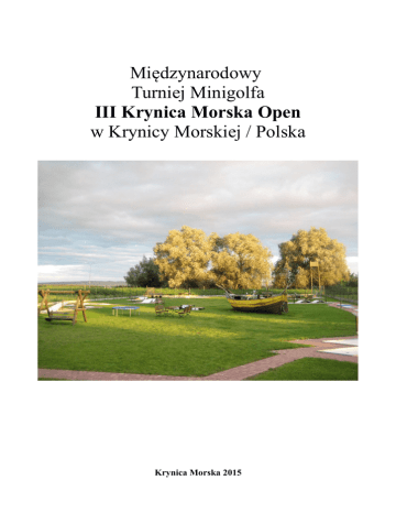 Międzynarodowy Turniej Minigolfa III Krynica Morska Open w Krynicy Morskiej / Polska Krynica Morska 2015 ZAPROSZENIE “III KRYNICA MORSKA OPEN” 2-3 MAJ 2015 ORGANIZATOR: Klub Sportowy Minigolf Krynica Morska POLE: minigolf 18 dołków, ul. Rybacka 92A, Krynica Morska 82-120 TERMIN: 2-3 maj 2015 r. ZAWODNICY: Zawodnicy zrzeszeni w klubach będących członkami federacji należących do WMF KATEGORIE: Juniorzy Kobiety Mężczyźni Seniorzy Open Drużynowa FORMUŁA TURNIEJU: Wszyscy uczestnicy grają 4 rundy w sobotę i 4 rundy w niedzielę. Wszystkie kategorie oprócz Open kończą się po 8 rundach. Rundę dziewiątą gra ośmiu najlepszych zawodników w kategorii Open. W przypadku takiego samego wyniku po ośmiu rundach zawodnicy grają dogrywkę do pierwszego przegranego dołka. WPISOWE: 60 zł od zawodnika NAGRODY: Puchary, nagrody rzeczowe + 50 % wpisowego zostanie przeznaczone na nagrody pieniężne dla zawodników. 1 miejsce – 3/6 sumy 2 miejsce – 2/6 sumy 3 miejsce – 1/6 sumy ZAPISY: Paweł Larus ul. Racławicka 12 81-737 Sopot Polska [email protected] +48-608-864-016 JAK DOJECHAĆ: 1. lotnisko – airport.gdansk.pl, 2. autokar – polskibus.com, pks.gdansk.pl, 3. pociąg – rozklad-pkp.pl, 4. bus - bus-kolobrzeg.pl, tsdskorpion.eu, w razie pytań proszę się kontaktować z Pawłem Larus. NOCLEGI: 1. http://dahara.mierzeja.pl/ ul. Gdańska 60, 82-120 Krynica Morska 2. mierzeja.pl, w razie pytań proszę się kontaktować z Pawłem Larus. WYŻYWIENIE: 1. restauracja na polu, 2. mierzeja.pl w razie pytań proszę się kontaktować z Pawłem Larus. INFORMACJE: mierzeja.pl, w razie pytań proszę się kontaktować z Pawłem Larus. HARMONOGRAM czwartek 30.04.2015 trening piątek 01.05.2015 trening, 20:00 ceremonia otwarcia sobota 02.05.2015 7:30 – 8:50 trening, start 9:00 4 rundy niedziela 03.05.2015 7:30 – 8:50 trening, start 9:00 4 rundy + 1 finałowa, wręczenie nagród, ceremonia zamknięcia