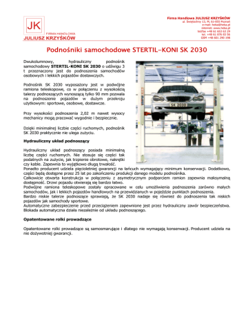 Firma Handlowa JULIUSZ KRZYŚKÓW ul. Świętochny 13, PL 61-055 Poznań e-mail: [email protected] internet: www.heka.pl tel/fax +48 61 653 63 29 tel. +48 61 876 83 56 GSM +48 601 290 198 Podnośniki samochodowe STERTIL-KONI SK 2030 Dwukolumnowy, hydrauliczny podnośnik samochodowy STERTIL-KONI SK 2030 o udźwigu 3 t przeznaczony jest do podnoszenia samochodów osobowych i lekkich pojazdów dostawczych. Podnośnik SK 2030 wyposażony jest w podwójne ramiona teleskopowe, co w połączeniu z wysokością talerzy podnoszących wynoszącą tylko 90 mm pozwala na podnoszenie pojazdów w dużym przekroju użytkowym: sportowe, osobowe, dostawcze. Przy wysokości podnoszenia 2,02 m nawet wysocy mechanicy mogą pracować wygodnie i bezpiecznie. Dzięki minimalnej liczbie części ruchomych, podnośnik SK 2030 praktycznie nie ulega zużyciu. Hydrauliczny układ podnoszący Hydrauliczny układ podnoszący posiada minimalną liczbę części ruchomych. Nie stosuje się części tak podatnych na zużycie, jak trzpienie obrotowe, nakrętki czy kable. Zapewnia to wyjątkowo długą trwałość. Ponadto producent udziela pięcioletniej gwarancji na łańcuch wymagający minimum konserwacji. Dodatkowo, części będą dostępne przez 25 lat po zakończeniu produkcji danego modelu podnośnika. Całkowicie otwarta konstrukcja w połączeniu z asymetrycznym podparciem ramion zapewnia maksymalną dostępność. Drzwi pojazdu otwierają się bardzo łatwo. Podwójne ramiona teleskopowe zostały opracowane w celu umożliwienia podnoszenia zarówno małych samochodów, jak i lekkich pojazdów handlowych na przewidzianych w pojeździe punktach podnoszenia. Bardzo niskie talerze podnoszące sprawiają, że SK 2030 nadaje się również do podnoszenia tak niskich pojazdów jak samochody sportowe. Automatyczne zabezpieczenie przed przeciążeniem zapewnione jest przez hydrauliczny zawór bezpieczeństwa. Blokada automatyczna działa niezależnie od układu podnoszącego. Opatentowane rolki prowadzące Opatentowane rolki prowadzące są samosmarujące i dlatego nie wymagają konserwacji. Producent udziela na nie dożywotniej gwarancji. Opcje: - Specjalne wsporniki do podnoszenia różnych pojazdów Zestaw oświetleniowy (2 oprawy) SK 2030, wersja obniżona o 20 cm, wysokość podnoszenia 1,92 m SK 2030, wersja obniżona o 40 cm, wysokość podnoszenia 1,82 m SK 2030, wersja szersza o 30 cm System płynnego opuszczania pojazdu: ruch w dół rozpoczyna się podczas opuszczania Skrzynki narzędziowe na długich ramionach Dodatkowy pulpit sterowniczy (do obsługi z obu kolumn) Podwójne gniazdo zasilania Kolor RAL według życzenia klienta Maksimum bezpieczeństwa: - Produkty STERTIL KONI osiadają certyfikaty CE, UDT, TUV Automatyczne ograniczanie wysokości Urządzenie zabezpieczające podczas podnoszenia i opuszczania Automatyczne zatrzymywanie na maksymalnej wysokości podnoszenia Automatyczna blokada ramienia Automatyczne zapadki elektromagnetyczne (zapobiegają niepożądanemu opuszczaniu) Automatyczne zabezpieczenie przeciw przeciążeniu DANE TECHNICZNE Układ podnoszący: hydrauliczny Udźwig: 3.000 kg Czas podnoszenia: 25 sek. Wysokość podnoszenia: 2,02 m Moc silnika: 3,6 kW Wysokość talerza podnoszącego: 90 - 130 mm www.heka.pl
