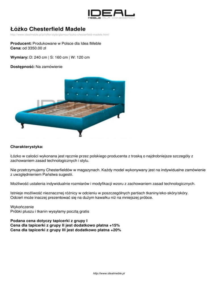 Łóżko Chesterfield Madele http://www.idealmeble.pl/pl/offer/style/glamour/lozko-chesterfield-madele.html/ Producent: Produkowane w Polsce dla Idea lMeble Cena: od 3350.00 zł Wymiary: D: 240 cm | S: 160 cm | W: 120 cm Dostępność: Na zamówienie Charakterystyka: Łózko w całości wykonana jest ręcznie przez polskiego producenta z troską o najdrobniejsze szczegóły z zachowaniem zasad technologicznych i stylu. Nie przetrzymujemy Chesterfieldów w magazynach. Każdy model wykonywany jest na indywidualne zamówienie z uwzględnieniem Państwa sugestii. Możliwość ustalenia indywidualnie rozmiarów i modyfikacji wzoru z zachowaniem zasad technologicznych. Istnieje możliwość nieznacznej różnicy w odcieniu w poszczególnych partiach tkaniny/eko-skóry/skóry. Odcień może inaczej prezentować się na dużym kawałku niż na mniejszej próbce. Wykończenie Próbki pluszu i tkanin wysyłamy pocztą gratis Podana cena dotyczy tapicerki z grupy I Cena dla tapicerki z grupy II jest dodatkowo płatna +15% Cena dla tapicerki z grupy III jest dodatkowo płatna +20% http://www.idealmeble.pl Dostępne wersje produktu: nazwa produktu Łóżko Chesterfield Madele 160cmx240cm Łóżko Chesterfield Madele 180cmx240cm Łóżko Chesterfield Madele 200cmx240cm warianty Tapicerka materiał, tkanina, plusz cena 3350.00zł dostępne Na zamówienie Tapicerka materiał, tkanina, plusz 3700.00zł Na zamówienie Tapicerka materiał, tkanina, plusz 3950.00zł Na zamówienie http://www.idealmeble.pl Zdjęcia produktu: http://www.idealmeble.pl Powered by TCPDF (www.tcpdf.org)
