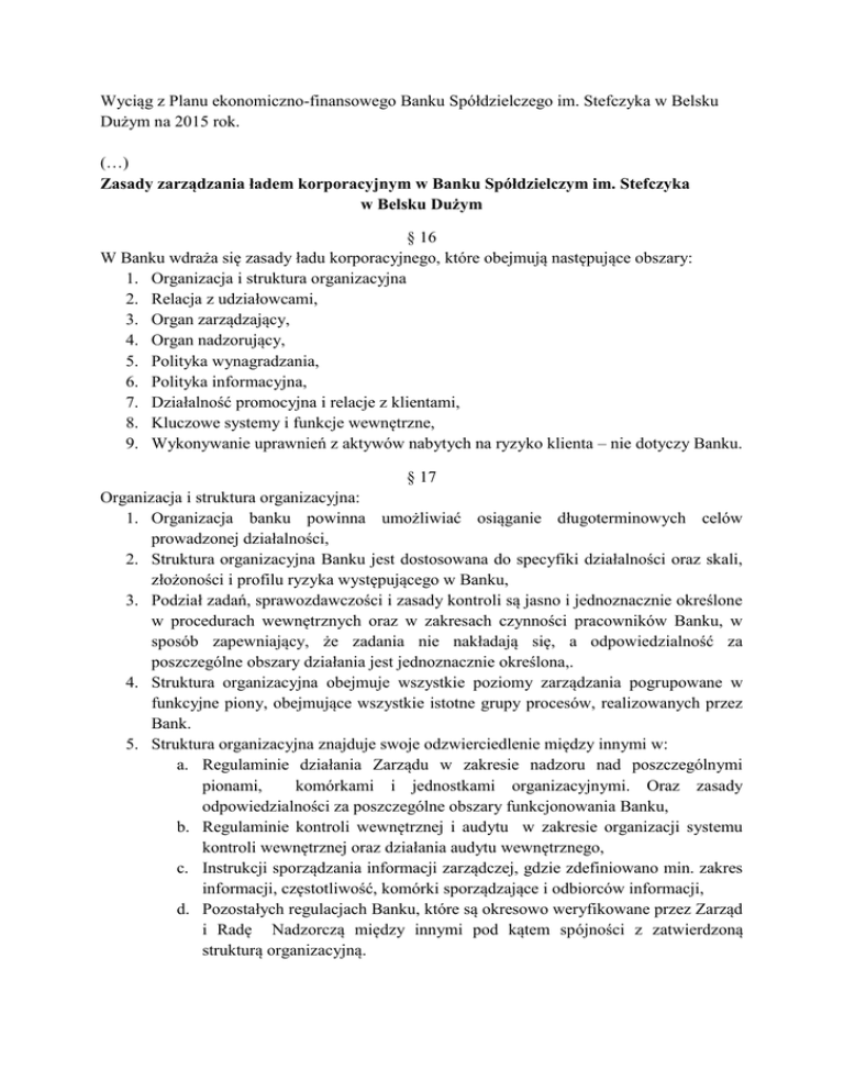 Wyciąg z Planu ekonomiczno-finansowego Banku Spółdzielczego im. Stefczyka w Belsku Dużym na 2015 rok. (…) Zasady zarządzania ładem korporacyjnym w Banku Spółdzielczym im. Stefczyka w Belsku Dużym § 16 W Banku wdraża się zasady ładu korporacyjnego, które obejmują następujące obszary: 1. Organizacja i struktura organizacyjna 2. Relacja z udziałowcami, 3. Organ zarządzający, 4. Organ nadzorujący, 5. Polityka wynagradzania, 6. Polityka informacyjna, 7. Działalność promocyjna i relacje z klientami, 8. Kluczowe systemy i funkcje wewnętrzne, 9. Wykonywanie uprawnień z aktywów nabytych na ryzyko klienta – nie dotyczy Banku. § 17 Organizacja i struktura organizacyjna: 1. Organizacja banku powinna umożliwiać osiąganie długoterminowych celów prowadzonej działalności, 2. Struktura organizacyjna Banku jest dostosowana do specyfiki działalności oraz skali, złożoności i profilu ryzyka występującego w Banku, 3. Podział zadań, sprawozdawczości i zasady kontroli są jasno i jednoznacznie określone w procedurach wewnętrznych oraz w zakresach czynności pracowników Banku, w sposób zapewniający, że zadania nie nakładają się, a odpowiedzialność za poszczególne obszary działania jest jednoznacznie określona,. 4. Struktura organizacyjna obejmuje wszystkie poziomy zarządzania pogrupowane w funkcyjne piony, obejmujące wszystkie istotne grupy procesów, realizowanych przez Bank. 5. Struktura organizacyjna znajduje swoje odzwierciedlenie między innymi w: a. Regulaminie działania Zarządu w zakresie nadzoru nad poszczególnymi pionami, komórkami i jednostkami organizacyjnymi. Oraz zasady odpowiedzialności za poszczególne obszary funkcjonowania Banku, b. Regulaminie kontroli wewnętrznej i audytu w zakresie organizacji systemu kontroli wewnętrznej oraz działania audytu wewnętrznego, c. Instrukcji sporządzania informacji zarządczej, gdzie zdefiniowano min. zakres informacji, częstotliwość, komórki sporządzające i odbiorców informacji, d. Pozostałych regulacjach Banku, które są okresowo weryfikowane przez Zarząd i Radę Nadzorczą między innymi pod kątem spójności z zatwierdzoną strukturą organizacyjną. 6. Podstawowa struktura organizacyjna, zatwierdzona przez Zarząd i Radę Nadzorczą jest publikowana na stronie internetowej Banku. 7. Zarząd odpowiada za dobór kadr o odpowiednich do realizowanych zadań kwalifikacjach. 8. Bank stosuje plany ciągłości działania mające na celu zapewnianie ciągłości działania i ograniczenia strat na wypadek poważnych zakłóceń w działalności. Plany ciągłości działania są elementem zarządzania ryzykiem operacyjnym. 9. W ramach oceny poziomu ryzyka operacyjnego Rada Nadzorcza i Zarząd są informowane o wszystkich stwierdzonych nadużyciach, zgłoszonych i zarejestrowanych w Rejestrze zdarzeń ryzyka operacyjnego. 10. Bank zapewnia pracownikom odpowiedni dostęp do informacji o zakresach uprawnień, obowiązkach i odpowiedzialności poszczególnych komórek organizacyjnych. Wszyscy pracownicy Banku są powiadamiani z każdą zmianą regulaminu organizacyjnego, co poświadczają w stosownych oświadczeniach. 11. Prawa pracowników są należycie chronione, a ich interesy należycie uwzględniane, Powyższe zasady znalazły odzwierciedlenie w Regulaminie pracy i płacy, zakresach czynności, w Regulaminie organizacyjnym oraz w Instrukcji zarządzania kadrami. § 18 Relacja z udziałowcami: 1. Bank działa w interesie wszystkich udziałowców z poszanowaniem interesu klientów. 2. Bank zapewnia udziałowcom właściwy dostęp do informacji. 3. Udziałowcy mogą wpływać na funkcjonowanie instytucji nadzorowanej wyłącznie poprzez decyzje organu stanowiącego nie naruszając kompetencji pozostałych organów. 4. Udziałowcy w swych decyzjach powinni kierować się interesem Banku. 5. Udziałowcy nie powinni wykorzystywać swojej pozycji do podejmowania decyzji prowadzących do przeniesienia aktywów z Banku do innych podmiotów a także do nabycia lub zbycia albo zawierania innych transakcji powodujących rozporządzenie przez Bank jej majątkiem na warunkach innych niż rynkowe, czy też z narażeniem bezpieczeństwa lub interesu Banku. 6. Przeprowadzenie transakcji z podmiotem powiązanym powinno być uzasadnione interesem Banku i powinno być dokonane w sposób transparentny w oparciu o zapisy regulacji wewnętrznych Banku. 7. Udziałowcy odpowiadają za utrzymanie pozycji kapitałowej Banku zdefiniowanej w Polityce kapitałowej (w tym w Polityce dywidendowej) Banku. 8. Powyższe zasady mają odzwierciedlenie w regulaminach obejmujących zasady działania organów statutowych Banku. § 19 Zarząd: 1. Członkowie Zarządu Banku posiadają odpowiednie kompetencje do prowadzenia spraw oraz dają rękojmię należytego wykonywania powierzonych im obowiązków. 2. Zarząd jest jedynym uprawnionym i odpowiedzialnym za zarządzanie działalnością Banku, w tym za prowadzenie spraw, planowanie, organizowanie, decydowanie, kierowanie oraz kontrolowanie działalności Banku. 3. Pracą Zarządu kieruje Prezes, a wewnętrzny podział obowiązków w Zarządzie zapewnia unikanie konfliktów interesów. 4. Pełnienie funkcji w Zarządzie powinno stanowić główny obszar aktywności zawodowej członka Zarządu. 5. Powyższe zasady reguluje Regulamin działania Zarządu Banku Spółdzielczego im. Stefczyka w Belsku Dużym. § 20 Rada Nadzorcza: 1. Członkowie Rady Nadzorczej Banku posiadają odpowiednie kompetencje do prowadzenia spraw oraz dają rękojmię należytego wykonywania powierzonych im obowiązków. 2. Indywidualne kompetencje poszczególnych członków Rady Nadzorczej powinny uzupełniać się w taki sposób, aby umożliwiać zapewnienie odpowiedniego poziomu kolegialnego sprawowania nadzoru nad wszystkimi obszarami działania. 3. Rada Nadzorcza oraz poszczególni jej członkowie przy wykonywaniu nadzoru kierują się obiektywną oceną i osądem. 4. Określony w Statucie skła