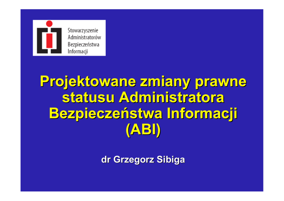 Projektowane zmiany prawne statusu Administratora Bezpieczeństwa Informacji (ABI) dr Grzegorz Sibiga Aktualny stan prawny ABI Zgodnie z art. 36 ust. 3 u.o.d.o. ABI nadzoruje przestrzeganie zasad technicznej i organizacyjnej ochrony danych osobowych (art. 36 ust.1 u.o.d.o.) Problemy: ¾ ¾ ¾ ¾ Status ABI Kompetencje ABI (nadzór) Ustrój ABI inne ABI w aspekcie prawnoporownawczym ABI w Dyrektywie 95/46/WE ABI w prawie członkowskim innych państw UE: Holandia Niemcy Węgry Zakres proponowanych zmian Status i kompetencje ABI Rejestracja zbiorów danych osobowych Zasady przeprowadzenia kontroli przez GIODO Zasada: powołanie ABI jest dobrowolne, ale gdy ADO dokona takiego powołania korzysta z udogodnień w realizacji ustawy. Proponowane zmiany Podstawowe zmiany: ¾ ¾ ¾ ¾ Powołanie ABI (brak obowiązku) Niezależne stanowisko, podległość kierownikowi jednostki organizacyjnej Kwalifikacje ABI Obowiązki ABI Powołanie ABI Administrator danych osobowych powołuje ABI, chyba że sam wykonuje zadania, określone w ustawie. Zadania ABI Przeprowadzanie kontroli przestrzegania przepisów o ochronie danych osobowych w jednostce organizacyjnej oraz opracowanie w tym zakresie sprawozdania dla administratora danych; Zapewnienie opracowania i aktualizowania dokumentacji, o której mowa w art. 36 ust.2, oraz nadzorowanie przestrzegania zasad w niej określonych; Zadania ABI Prowadzenie rejestru zbiorów danych przetwarzanych w jednostce organizacyjnej; Zaznajamianie osób upoważnionych do przetwarzania danych osobowych z przepisami o ochronie danych osobowych. Zadania ABI Administrator danych może powierzyć ABI wykonywanie innych zadań, które nie naruszałyby prawidłowego wykonywania jego obowiązków, określonych w ustawie. Kwalifikacje ABI ABI może być osoba, która: ¾ ¾ ¾ ¾ ma pełną zdolność do czynności prawnych oraz korzysta z pełni praw publicznych; posiada wykształcenie wyższe; posiada odpowiednią wiedzę z zakresu ochrony danych osobowych; nie była karana za przestępstwo popełnione z winy umyślnej. Zastępca ABI Administrator danych może powołać zastępcę ABI, który spełnia określone warunki Niezależność stanowiska ABI podlega bezpośrednio kierownikowi jednostki organizacyjnej, który zapewnia: ¾ ¾ niezbędne środki do wykonywania zadań organizacyjną odrębność ABI w niezależnym wykonywaniu zadań określonych w przepisach o ochronie danych osobowych. Zgłaszanie ABI do GIODO Administrator danych zawiadamia Generalnego Inspektora o: ¾ powołaniu ABI, ¾ odwołaniu ABI wraz z podaniem przyczyn takiego odwołania. Generalny Inspektor prowadzi ogólnokrajowy, jawny rejestr ABI Kompetencja do wykreślenia ABI z rejestru, gdy powołanie lub działalność narusza ustawowe zasady (wówczas ADO nie może korzystać z korzyści związanych z powołaniem ABI). Nowe rozporządzenie Minister właściwy do spraw administracji publicznej, na wniosek Generalnego Inspektora, określi w drodze rozporządzenia: ¾ ¾ ¾ zasady i tryb przeprowadzania kontroli oraz opracowania i przedstawiania sprawozdania ABI, tryb wykonywania nadzoru ABI, sposób prowadzenia rejestru zbiorów danych przez ABI Rejestracja Administrator danych, który powołał ABI jest zwolniony ze zgłoszenia do rejestracji/aktualizacji swoich zbiorów (za wyjątkiem zbiorów danych wrażliwych) W przypadku zgłoszenia zbiorów danych, pozytywna opinia ABI umożliwia rozpoczęcie przetwarzania danych bez potrzeby rejestracji przez GIODO Przeprowadzenie kontroli GIODO może powierzyć przeprowadzenie czynności kontrolnych ABI, co jednak nie wyłącza kompetencji kontrolnych organu ochrony danych osobowych. Korzyści dla ADO z wyznaczenia ABI Uproszczona procedura rejestracji zbiorów danych – zgłoszenie do ABI Zwolnienie z procedury uprzedniej kontroli przy rejestracji zbiorów z danymi wrażliwymi Uproszczona forma kontroli przez GIODO Dziękuję za uwagę. www.sabi.org.pl [email protected]