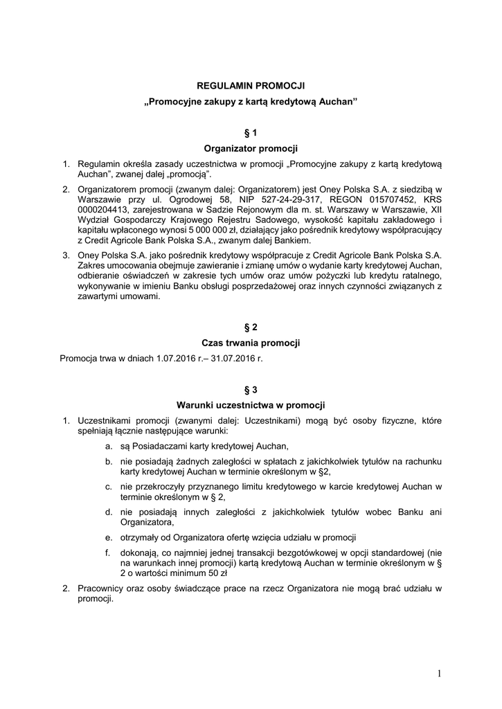 REGULAMIN PROMOCJI „Promocyjne zakupy z kartą kredytową Auchan” §1 Organizator promocji 1. Regulamin określa zasady uczestnictwa w promocji „Promocyjne zakupy z kartą kredytową Auchan”, zwanej dalej „promocją”. 2. Organizatorem promocji (zwanym dalej: Organizatorem) jest Oney Polska S.A. z siedzibą w Warszawie przy ul. Ogrodowej 58, NIP 527-24-29-317, REGON 015707452, KRS 0000204413, zarejestrowana w Sadzie Rejonowym dla m. st. Warszawy w Warszawie, XII Wydział Gospodarczy Krajowego Rejestru Sadowego, wysokość kapitału zakładowego i kapitału wpłaconego wynosi 5 000 000 zł, działający jako pośrednik kredytowy współpracujący z Credit Agricole Bank Polska S.A., zwanym dalej Bankiem. 3. Oney Polska S.A. jako pośrednik kredytowy współpracuje z Credit Agricole Bank Polska S.A. Zakres umocowania obejmuje zawieranie i zmianę umów o wydanie karty kredytowej Auchan, odbieranie oświadczeń w zakresie tych umów oraz umów pożyczki lub kredytu ratalnego, wykonywanie w imieniu Banku obsługi posprzedażowej oraz innych czynności związanych z zawartymi umowami. §2 Czas trwania promocji Promocja trwa w dniach 1.07.2016 r.– 31.07.2016 r. §3 Warunki uczestnictwa w promocji 1. Uczestnikami promocji (zwanymi dalej: Uczestnikami) mogą być osoby fizyczne, które spełniają łącznie następujące warunki: a. są Posiadaczami karty kredytowej Auchan, b. nie posiadają żadnych zaległości w spłatach z jakichkolwiek tytułów na rachunku karty kredytowej Auchan w terminie określonym w §2, c. nie przekroczyły przyznanego limitu kredytowego w karcie kredytowej Auchan w terminie określonym w § 2, d. nie posiadają innych zaległości z jakichkolwiek tytułów wobec Banku ani Organizatora, e. otrzymały od Organizatora ofertę wzięcia udziału w promocji f. dokonają, co najmniej jednej transakcji bezgotówkowej w opcji standardowej (nie na warunkach innej promocji) kartą kredytową Auchan w terminie określonym w § 2 o wartości minimum 50 zł 2. Pracownicy oraz osoby świadczące prace na rzecz Organizatora nie mogą brać udziału w promocji. 1 §4 Zasady promocji 1. Warunkiem koniecznym udziału w promocji jest dokonanie przez Uczestnika promocji w terminie określonym w § 2 co najmniej jednej transakcji bezgotówkowej o wartości minimum 50 zł w opcji standardowej (nie na warunkach innej promocji Organizatora) kartą kredytową Auchan. 2. Każdy Uczestnik, który spełni warunki określone w niniejszym Regulaminie otrzyma od Organizatora zwrot 10% sumy transakcji bezgotówkowych dokonanych kartą kredytową Auchan w terminie określonym w § 2, ale nie więcej niż 30 zł. 3. Kwota, o której mowa powyżej, zostanie wyksięgowana z rachunku karty kredytowej Auchan jako pomniejszenie kwoty zadłużenia wynikającego z sumy transakcji bezgotówkowych dokonanych kartą kredytową Auchan w czasie trwania promocji. 4. O wyksięgowaniu 10% kwoty kapitału transakcji, o których mowa w punkcie 2 niniejszego paragrafu z rachunku limitu karty kredytowej Auchan Uczestnik zostanie poinformowany najpóźniej na wyciągu z karty kredytowej Auchan generowanym dnia 24.08.2016 r. 5. Promocja nie łączy sie z innymi promocjami Organizatora. 6. Promocja dotyczy jedynie transakcji o wartości minimum 50 zł. §5 Tryb składania i rozpatrywania reklamacji 1. Każdemu Uczestnikowi przysługuje prawo do wniesienia reklamacji w zakresie niezgodności przeprowadzenia promocji z niniejszym Regulaminem. 2. Reklamacja powinna zostać złożona w jeden z następujących sposobów 2.1 ustnie: a. osobiście w dowolnej placówce Banku lub dowolnym Punkcie Doradztwa Finansowego lub b. złożona za pośrednictwem Serwisu Telefonicznego Oney 2.2 w formie pisemnej: a. wysłana pocztą na adres Banku do doręczeń i korespondencji, to jest: Oney Polska S.A., ul. Ogrodowa 58, 00-876 Warszawa, z dopiskiem „Promocyjne zakupy z kartą kredytową Auchan” lub b. złożona osobiście w dowolnej placówce Banku lub dowolnym Punkcie Doradztwa Finansowego 2.3 w formie elektronicznej: a. złożona poprzez formularz kontaktowy znajdujący się na stronie internetowej www.oney.com.pl 3 Złożona reklamacja, wraz z opisem przyczyn reklamacji, powinna być opatrzona czytelnym podpisem Uczestnika (w przypadku formy pisemnej) i zawierać dane umożliwiające jednoznaczną identyfikację Uczestnika. W treści reklamacji należy podać imię i nazwisko oraz adres do korespondencji. 4 Do reklamacji wymagających złożenia dokumentów, (lub jeśli taki wymóg wynika z powszechnie obowiązujących przepisów prawa) należy dołączyć kopie ewentualnych dokumentów potwierdzających zasadność złożonej reklamacji. 2 5 Reklamacje będą rozpatrywane niezwłocznie, nie później niż w terminie do 30 dni kalendarzowych (liczonych od daty otrzymania reklamacji) przy uwzględnieniu zasad określonych w niniejszym Regulaminie oraz obowiązujących przepisów prawa. Organizator udziela odpowiedzi w formie pisemnej - listownie na wskazany w reklamacji adres korespondencyjny lub w formie telefonicznej – na wskazany w reklamacji numer telefonu kontaktowego (w tym wysłanie wiadomości SMS w przypadku pozytywnego rozpatrzenia reklamacji). 6 W przypadku uzasadnionej niemożności udzielenia odpowiedzi w terminie wskazanym w ust. 5 Organizator: a. wyjaśnia przyczyny opóźnienia, b. wskazuje okoliczności, które muszą zostać ustalone, c. wskazuje przewidywany termin udzielenia odpowiedzi, który nie może przekroczyć 60 dni od dnia otrzymania reklamacji. §6 Postanowienia końcowe 1. Dane osobowe Uczestników będą przetwarzane zgodnie z Umową o kartę kredytową Auchan. 2. Udział Uczestnika w promocji oznacza jego akceptację zasad promocji zawartych w niniejszym Regulaminie. Regulamin promocji jest dostępny na stronie www.oney.com.pl 3. W sprawach nieuregulowanych w niniejszym Regulaminie mają zastosowanie przepisy powszechnie obowiązującego prawa. 3