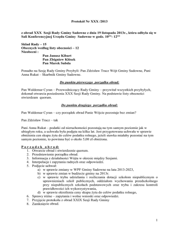 Protokół Nr XXX /2013 z obrad XXX Sesji Rady Gminy Sadowne z dnia 19 listopada 2013r., która odbyła się w Sali Konferencyjnej Urzędu Gminy Sadowne w godz. 10°°- 12°° Skład Rady – 15 Obecnych według listy obecności – 12 Nieobecni : Pan Janusz Kibart Pan Zbigniew Kłósek Pan Marek Subda Ponadto na Sesję Rady Gminy Przybyli: Pan Zdzisław Tracz Wójt Gminy Sadowne, Pani Anna Rukat – Skarbnik Gminy Sadowne. Do punktu pierwszego porządku obrad: Pan Waldemar Cyran – Przewodniczący Rady Gminy – przywitał wszystkich przybyłych, dokonał otwarcia posiedzenia XXX Sesji Rady Gminy. Na podstawie listy obecności stwierdzam quorum. Do punktu drugiego porządku obrad: Pan Waldemar Cyran – czy porządek obrad Panie Wójcie pozostaje bez zmian? Pan Zdzisław Tracz – tak Pani Anna Rukat – podatki od nieruchomości pozostają na tym samym poziomie jak w ubiegłym roku, a uchwała była podjęta na kilka lat. Jest przygotowana uchwała w sprawie obniżenia cen skupu żyta do celów podatku rolnego, jeżeli stawka miałaby pozostać na tym samym poziomie, to powinna być o około 5,00 zł obniżona. P o r z ą d e k o b r a d: 1. Otwarcie obrad i stwierdzenie quorum. 2. Przedstawienie porządku obrad. 3. Informacja z działalności Wójta w okresie między Sesjami. 4. Interpelacje i zapytania radnych oraz odpowiedzi. 5. Podjęcie uchwał: a) w sprawie zmiany w WPF Gminy Sadowne na lata 2013-2023, b) w sprawie zmian w budżecie gminy na 2013r. c) w sprawie trybu udzielania i rozliczania dotacji szkołom niepublicznym o uprawnieniach szkół publicznych, oddziałom wychowania przedszkolnego przy niepublicznych szkołach podstawowych oraz trybu i zakresu kontroli prawidłowości ich wykorzystywania, d) w sprawie określenia ceny skupu żyta do celów podatku rolnego, 6. Sprawy różne – zapytania i wolne wnioski oraz odpowiedzi. 7. Przyjęcie protokołu z obrad XXIX Sesji Rady Gminy 8. Zamknięcie obrad. 1 Do punktu trzeciego porządku obrad: Pan Zdzisław Tracz – wykonano drogę Ocięte – Krupińskie i czynem społecznym wyrównano doły na drodze gminnej Sadowne – Ocięte. W dniu 12.10.2013r. odbyło się otwarcie ofert na drogę Wilczogęby – Sojkówek. Brakuje nam na tę drogę pieniędzy w budżecie i w związku z tym ta dzisiejsza sesja. Przygotowano dokumentację projektową na remont boiska i bieżni sportowej. Wystąpiliśmy do Starostwa o zgodę na wykonanie inwestycji w związku z tym, że Starostwo jest współwłaścicielem. Zlecono wykonanie projektów na przebudowę drogi w miejscowości Zarzetka, Morzyczyn, Krupińskie- Sadowne. Wykonano przepust na Bojewce w miejscowości Kołodziąż, wyżwirowano drogę z Grabin do Szynkarzyzny. Jest oferta na wykonanie oświetlenia w Złotkach. Jest podpisana umowa na budowę SUW w Złotkach. Wykonano dokumentację na wodociągi w Złotkach, Kolonia Złotki. Do punktu czwartego porządku obrad: Pan Marek Gajewski – w protokole z Komisji Rolnictwa, Bezpieczeństwa Publicznego, Ochrony Przeciwpożarowej i Ochrony Środowiska są wpisane do budowy inne drogi, niż te, które zostały umieszczone w projekcie budżetu na 2014r. Co z pozostałymi drogami, które są we wniosku z komisji. Pan Zdzisław Tracz – Zarzetka jest w budżecie. Pani Anna Rukat - 2 200 000,00 zł to kwota w budżecie na kanalizacje i SUW, na drogi powiatowe 348 753,50 zł, na drogi gminne 470 000,00 zł i są to drogi: Krupińskie-Sadowne, Morzyczyn, Płatkownica, Wilczogęby, Zarzetka, Złotki, Kolonia Złotki i Orzełek Pan Jacek Rostek – ile nas będą kosztowały inwestycje, które robimy wspólnie z powiatem. Pani Anna Rukat – uczestniczymy w kosztach 50 do 50. Pan Marek Gajewski – w Stoczku zrobiona jest ładna droga, do której gmina nic nie dokładała. Pan Zdzisław Tracz – jest to droga, która została zrobiona w ramach programu przeciwdziałania i usuwania skutków klęsk żywiołowych. Pan Andrzej Rosiński – na jakim etapie jest budowa oświetlenia na Szynkarzyźnie. Pan Zdzisław Tracz – myślę, że na święta będzie zrobione. Pan Andrzej Wrzosek – na jakim etapie jest budowa ulicy Kilińskiego? Pan Zdzisław Tracz – było trzech wykonawców, ale żaden nie chciał robić, mają większe inwestycje. Pan Piotr Olkowski – chciałbym Panu Wójtowi, Pani Skarbnik i Radzie Gminy podziękować za drogę w Ociętem i w związku z tym zaprosić na najbliższy piątek na obiad. 2 Do punktu piątego porządku obrad: Pani Anna Rukat – zmiany w budżecie, które państwo dostaliście dotyczą przede wszystkim drogi Wilczogęby-Zalesie. Po otwarciu oferty brakuje nam na tę drogę około 20.000 zł. Pan Marek Zasłona – o ile zmniejszą się wydatki na kanalizację w związku z tym, że o 1m niżej kopiemy. Pan Zdzisław Tracz – tak zmniejszają się, ale nie wiemy dokładnie na jaka kwotę myślę, że będzie to jakieś 20 000,00 – 30 000,00zł. Pan Marek Zasłona – rozmawiałem z wykonawcą kanalizacji w Okuniewie, który twierdzi, że w obecnych warunkach można kopać na 5 m w głąb. Te ruchome piaski, o których pan mówi, to pic na wodę. Tylko u nas w Sadownem będą stały dwie przepompownie w środku miejscowości. Pan Zdzisław Tracz- wykonawca przedstawił racjonalne wyliczenia i brak możliwości budowy i stąd te dwie przepompownie. a) w sprawie zmiany w WPF Gminy Sadowne na lata 2013-2023, Wniosek w sprawie nie odczytywania całej treści uchwały Odbyło się glosowanie: Za – 11 Przeciw – 0 Wstrzymało się od głosu – 1 Odbyło się glosowanie za uchwałą: Za – 10 Przeciw – 0 Wstrzymało się od głosu – 2 b) w sprawie zmian w budżecie gminy na 2013r. Odbyło się glosowanie za uchwałą: Za – 10 Przeciw – 0 Wstrzymało się od głosu – 2 c) w sprawie trybu udzielania i rozliczania dotacji szkołom niepublicznym o uprawnieniach szkół publicznych, oddziałom wychowania przedszkolnego przy niepublicznych szkołach podstawowych oraz trybu i zakresu kontroli prawidłowości