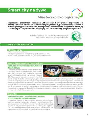 Smart city na żywo Tegoroczna przestrzeń specjalna „Miasteczko Ekologiczne” zapowiada się bardzo ciekawie. To unikalne w skali kraju wydarzenie, podczas którego w formie interaktywnej prezentowane są ekologiczne i ekonomiczne urządzenia, maszyny i technologie. Uzupełnieniem ekspozycji jest czterodniowy program wydarzeń. Patronat Honorowy nad Miasteczkiem Ekologicznym objął Główny Inspektor Ochrony Środowiska. EKSPOZYCJA MIASTECZKA T&T Proenergy Mikroinstalacja fotowoltaiczna (współpracująca z siecią energetyczną zgodnie z Ustawą OZE). Panele EGING PV 250W, Inwerter SAJ,Konstrukcja Oberhauser Klaster Zrównoważona Infrastruktura MOBILNE LABORATORIUM INNOWACYJNEGO BUDOWNICTWA – prezentacja nowoczesnego sprzętu badawczego i diagnostycznego do weryfikacji parametrów wewnętrznych i zewnętrznych budynków, rozwiązań pasywnych w budownictwie i sprawności instalacji OZE. Wyposażenie laboratorium stanowi wysokiej jakości sprzęt do badań termowizyjnych, prób szczelności budynków, badań jakości powietrza, mikroklimatu i komfortu cieplnego wewnątrz budynków. Sprzęt pozwala również zbadać wilgotność przegród budowlanych, wyznaczyć współczynnik przenikania ciepła oraz dokonać ciągłego pomiaru parametrów klimatu lokalnego. Mobilne laboratorium służy do weryfikacji jakości budynków pod kątem prac termomodernizacyjnych, jak również do promowania technologii inteligentnego budownictwa zeroenergetycznego oraz działań na rzecz poprawy efektywności energetycznej. Dodatkowe wyposażenie stanowią modele domu zeroenergetycznego i detali konstrukcyjnych w budynkach pasywnych. Compillar Słupy oświetleniowe z tworzywa kompozytowego ze zintegrowanym koszem na odpady Innowacyjne latarnie z wytrzymałego laminatu wzmocnionego włóknem szklanym, atrakcyjne wizualnie i technologicznie. Charakteryzujące się min. 60-letnim okresem trwałości, nieobecnością zjawiska korozji, dowolnością koloru żywicy oraz wysoką odpornością UV. Kosz kompozytowy montowany obejmą stalową może być dopasowany do innych średnic słupów, masztów oraz słupków. 1 Infraster Filtry do studzienek SWEDROP™ Dzięki szwedzkiej technologii możliwe jest oczyszczanie wody deszczowej bez ogromnych inwestycji w duże instalacje. Filtry SWEDROP™ umieszczone w studzienkach sprawiają, że oczyszczona jest woda płynąca w systemie kanalizacji burzowej. Pozbawiona jest nawet metali ciężkich. Można bezpiecznie wypuścić ją do rzeki. MPI Systemy Dla Środowiska Biologiczna oczyszczalnia ścieków SBR pracująca na sprężonym powietrzu, z wyposażeniem technicznym w specjalnej obudowie. W przypadku tradycyjnych oczyszczalni SBR, wyposażenie techniczne, takie jak dmuchawa czy zawory magnetyczne, jest umieszczone w skrzynce sterującej. Montuje się ją w domu lub w ogrodzie, co powoduje, że „brzęczenie” dmuchawy czy „stukanie” zaworów często zakłóca spokój mieszkańców. W przypadku SOLIDO jest inaczej – wszystkie części mechaniczne są bezpiecznie zamontowane pod specjalną osłoną na zbiorniku. Dzięki temu nie powodują one żadnych zakłóceń. Umożliwia to nie tylko spokojny sen, ale jest także niezwykle efektywne: umieszczenie wyposażenia technicznego pod obudową SOLIDO powoduje, że uciążliwe układanie długich węży doprowadzających sprężone powietrze jest zbędne, a równocześnie nie występują zbędne straty ciśnienia. System domowo-ogrodowy NEO do zagospodarowania wody deszczowej Nowy płaski zbiornik NEO z innowacyjną konstrukcją, niewielką wysokością oraz dużą wytrzymałością idealnie nadaje się do Twojego systemu na wodę deszczową. Zbiornik występuje w pojemnościach od 800 do 40 000 litrów WYKORZYSTANIE ZBIORNIKÓW NEO: • Systemy zagospodarowanie wody deszczowej w ogrodzie i w domu • Bezodpływowy zbiornik na ścieki Prosperplast Compothermo szczelny, bardzo wydajny i wytrzymały kompostownik. Podwójne ściany zapewniają doskonałą izolację i optymalną temperaturę, przyspieszającą proces powstawania kompostu. Biocompo prosty w montażu, wytrzymały i odporny na uszkodzenia, o mocnej, solidnej konstrukcji piramidy. Grawitacyjny przepływ powietrza dzięki ażurowej konstrukcji ścian i swobodny odpływ wody deszczowej z wyprofilowanej klapy górnej. Deszczownice i systemy nawadniania które mogą być wykorzystane w przydomowych ogródkach, na terenach zieleni miejskiej (trawniki, boiska, rabaty) oraz jako ekologiczny sposób zbierania i wykorzystania wody opadowej. Rozwiązania te pozwalają znacznie ograniczyć zużycie i straty wody, a przy okazji zadbać o środowisko naturalne. 2 Husqvarna Automower® Szeroka gama kosiarek z rodziny Automower® firmy Husqvarna to automatyczne, inteligentne urządzenia, które zadbają o idealny wygląd i kondycję Twojego trawnika, oszczędzając przy tym cenny czas. Firma Husqvarna wprowadziła je na rynek już w 1995 roku. 20-letnie doświadczenie w ich produkcji, widoczne jest w kolejnych udoskonaleniach i innowacyjnych rozwiązaniach technicznych. Kosiarki są ekologiczne – nie wydzielają spalin i bardzo ciche (nawet 57dB –podczas, gdy głośna rozmowa to 70 dB a lejąca się woda 75 dB). Dzięki wbudowanemu modułowi GPS, możesz komunikować się z nimi przez wyświetlacz smartfona. Husqvarna Automower® mogą pozostawać w ogrodzie przez cały sezon, gdyż są odporne na warunki pogodowe. Dodatkowo realizują koszenie niezależnie od kształtu trawnika, obecności przeszkód (rośliny, mała architektura ogrodowa itp.), ukształtowania terenu. To mechaniczni eksperci ds. koszenia, przy których będziesz mógł się zrelaksować i cieszyć pięknem przydomowego zieleńca. Bio Fed Mikroorganizmy EM Firma zajmuje się ekologicznym oczyszczaniem zbiorników wodnych. Nasza metoda pozwala na przywrócenie równowagi biologicznej ekosystemu w akwenach. Dzięki naszym działaniom likwidujemy odory gnilne, zmniejszamy osady mułu, eliminujemy emi
