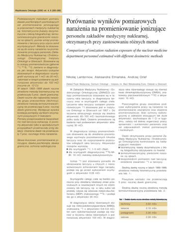 Wspó³czesna Onkologia (2000) vol. 4; 6 (265–266) Podstawowymi metodami pomiaru dawek poch³oniêtych pochodz¹cych od promieniowania jonizuj¹cego w pracowniach medycyny nuklearnej s¹: fotometryczna (kasety dozymetryczne z b³on¹ fotograficzn¹), termoluminescencyjna (pierœcionki noszone na rêkach), pomiar emisji promieniowania z tarczycy przy u¿yciu sond scyntylacyjnych. Metody te stosowane s¹ do oceny nara¿enia na promieniowanie jonizuj¹ce personelu Zak³adu Medycyny Nuklearnej i Endokrynologii Onkologicznej Instytutu Onkologii w Gliwicach. Stosowane s¹ tu izotopy promieniotwórcze (g³ównie 131 I, 99mTc, 125I), zarówno w diagnostyce, jak i terapii. Aktywnoœci izotopów stosowanych w diagnostyce i scyntygrafii wynosz¹ od 1 mCi do 20 mCi, natomiast w terapii podawane s¹ jednorazowe aktywnoœci do 150 mCi (rocznie ok. 12 Ci). W latach 1993–1999 dawki roczne okreœlone metod¹ fotometryczn¹ nie przekroczy³y 5 proc. dawki granicznej. Dawki roczne dla najbardziej nara¿onej grupy pracowników (technicy), okreœlone metod¹ termoluminescencyjn¹ nie przekraczaj¹ 5 proc. rocznej dawki granicznej. Wystêpuje wysoka korelacja pomiêdzy wynikami otrzymanymi powy¿szymi 2 metodami. Pomiary przeprowadzone bezpoœrednio nad tarczyc¹ wykazuj¹, i¿ poziomy aktywnoœci tylko w sporadycznych przypadkach przekracza³y próg detekcji. Ocenione dawki nie przekracza³y 7 proc. rocznego limitu nara¿enia. S³owa kluczowe: promieniowanie jonizuj¹ce, dawka poch³oniêta, dawka graniczna, ochrona radiologiczna. Porównanie wyników pomiarowych nara¿enia na promieniowanie jonizuj¹ce personelu zak³adów medycyny nuklearnej, otrzymanych przy zastosowaniu ró¿nych metod Comparison of ionization radiation exposure of the nuclear medicine department personnel estimated with different dosimetric methods Niko³aj Lambrinow, Aleksandra Etmañska, Andrzej Orlef Zak³ad Fizyki Medycznej, Centrum Onkologii – Instytutu im. Marii Sk³odowskiej-Curie, Oddzia³ w Gliwicach W Zak³adzie Medycyny Nuklearnej i Endokrynologii Onkologicznej (ZMNiEO) izotopy promieniotwórcze stosowane s¹ w leczeniu raka tarczycy, w diagnostyce tarczycy oraz w scyntygrafii ca³ego cia³a. Leczenie raka tarczycy izotopem promieniotwórczym 131I stosowane jest w Instytucie Onkologii w Gliwicach od 1957 r. Do leczenia ablacyjnego stosuje siê œrednio aktywnoœæ 60–100 mCi beznoœnikowego jodku sodu (NaI). Ostatnio prowadzone s¹ badania nad podawaniem aktywnoœci ablacyjnej 30 mCi. W diagnostyce izotopy promieniotwórcze stosowane s¹ do okreœlenia procentowego wychwytu pozostawionych kikutów tarczycy oraz do rozpoznawania przerzutów odleg³ych raka tarczycy. Aktywnoœci izotopów wynosz¹: dla scyntygrafii 131I: 1–3 mCi (NaI), dla scyntygrafii diagnostycznej 99mTc-MIBI: 10 mCi metoksy-izobutyloizonitrylu. Izotop 131I jest stosowany ponadto do obrazowania tarczycy u chorych z nienowotworowymi schorzeniami tego narz¹du, podaje siê go przed wykonaniem scyntygrafii o aktywnoœci 0,05 mCi. Scyntygrafie ca³ego cia³a s¹ bardzo pomocne przy okreœlaniu lokalizacji zmian przerzutowych w nowotworach innych ni¿ zró¿nicowany rak tarczycy, np. w raku sutka lub prostaty. U¿ywa siê wówczas metylo-dwu-fosfonianu (MDP) znakowanego 99mTc i podaje siê go o aktywnoœci 20 mCi. styce raka rdzeniastego stosuje siê równie¿ kwas dimerkaptobursztynowy (DMSA), znakowany piêciowartoœciowym 99mTC o aktywnoœci 15 mCi. Poszczególne grupy zawodowe podczas wykonywania pracy s¹ nara¿one na promieniowanie zewnêtrzne oraz ska¿enia promieniotwórcze. Stan ochrony radiologicznej w zak³adzie stosuj¹cym tak du¿e aktywnoœci, dochodz¹ce do 1 Ci w tygodniu, zale¿y od dobrej organizacji pracy, sprawnoœci i sumiennoœci personelu oraz od odpowiednich metod pomiarowych i kontrolnych. Dawki otrzymywane przez personel Zak³adu Medycyny Nuklearnej i Endokrynologii Onkologicznej kontrolowane s¹ nastêpuj¹cymi metodami: fotometryczn¹: kasety dozymetryczne z b³on¹ fotograficzn¹ odczytywane co kwarta³, termoluminescencyjn¹: pierœcionki noszone na rêkach, bezpoœrednim pomiarem nad tarczyc¹: okreœlenie zawartoœci 131I w tarczycy. Œredni¹ dawkê roczn¹ w latach 1993–1999, okreœlona metod¹ fotometryczn¹ przedstawia tab. 1.: Powy¿sze wartoœci nie przekraczaj¹ 5 proc. rocznej dawki granicznej. Œredni¹ dawkê roczn¹ okreœlon¹ metod¹ termoluminescencyjn¹ przedstawia tab. 2.: Tab. 1. Œrednia dawka roczna okreœlona metod¹ fotometryczn¹ W diagnostyce raków rdzeniastych stosuje siê meta-jodobenzylgwanidynê (MIBG), znakowan¹ 131I o aktywnoœci 0,6–0,8 mCi, ten sam radiofarmaceutyk podaje siê równie¿ w leczeniu raków rdzeniastych o jednorazowej aktywnoœci 150 mCi. W diagno- technicy 2,50 mSv lekarze 2,10 mSv pielêgniarki 2,30 mSv salowe 2,30 mSv Wspó³czesna Onkologia (2000) vol. 4; 6 (265–266) Basically, the absorbed dose measurements for Nuclear Medicine Department personnel are performed with three methods using: film badges, thermoluminescent (TLds) – rings on the fingers, scintillation detector systems for detection of the radiation emitted from the thyroid. These methods were used in order to evaluate radiation exposure of the personnel employed in the Nuclear Medicine Department of the Institute of Oncology, branch Gliwice. The radioactive isotopes used here for diagnostic or therapeutic purposes are 131I, 99mTc and 125I. The typical activities of the isotopes used diagnostically are from the range of 1-20 mCi whereas in case of therapeutical applications activities are of about 150 mCi. In particular about 12 Ci of the 131I per year is used. Annual doses do not exceed 5% of annual limit as estimated from film badges measurements performed between 1993 and 1999. As estimated by TLDs the limit of 5% is also retained for technicians, the group of the greatest radiation risk. There is a good correlation between the doses measured by both methods. The measurements of the radiation emitted 
