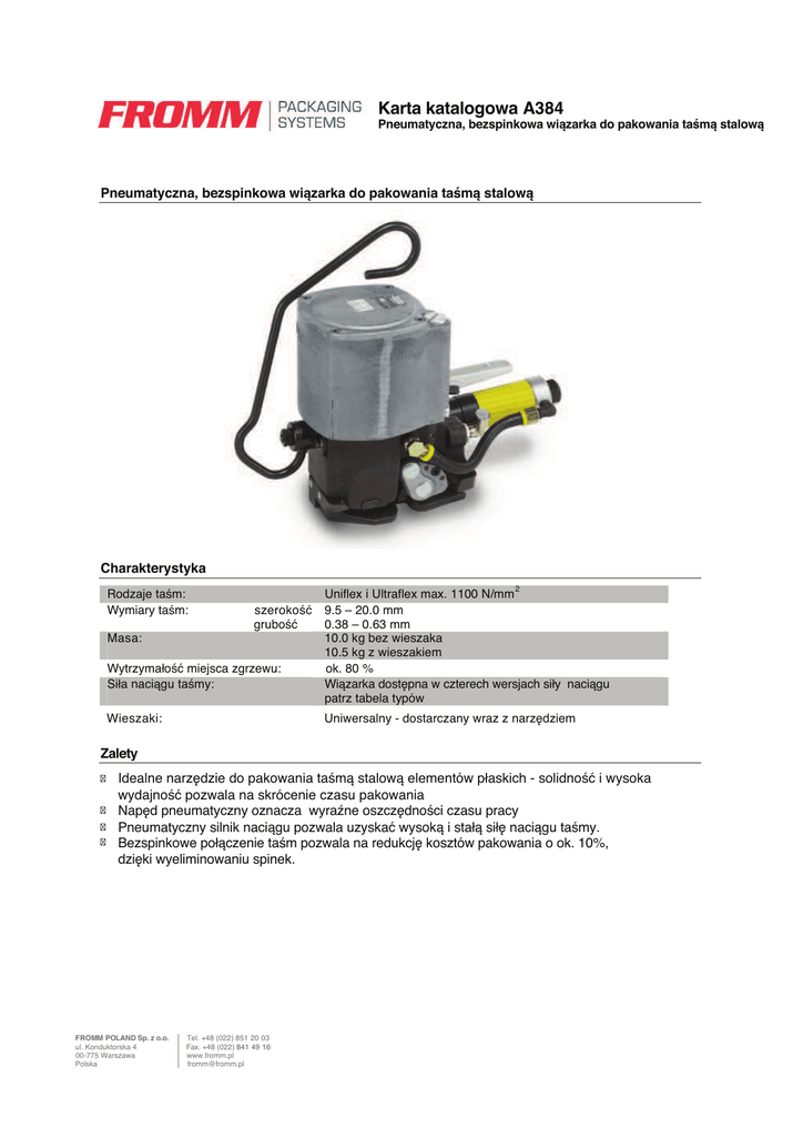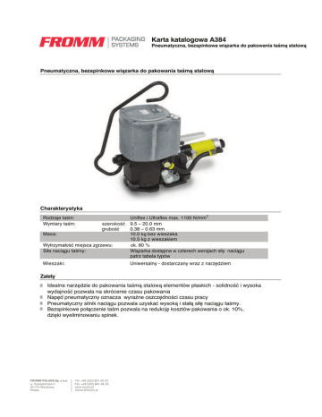 Karta katalogowa A384 Pneumatyczna, bezspinkowa wiązarka do pakowania taśmą stalową Pneumatyczna, bezspinkowa wiązarka do pakowania taśmą stalową Charakterystyka Rodzaje taśm: Wymiary taśm: 2 szerokość grubość Masa: Wytrzymałość miejsca zgrzewu: Siła naciągu taśmy: Uniflex i Ultraflex max. 1100 N/mm 9.5 – 20.0 mm 0.38 – 0.63 mm 10.0 kg bez wieszaka 10.5 kg z wieszakiem ok. 80 % Wiązarka dostępna w czterech wersjach siły naciągu patrz tabela typów Uniwersalny - dostarczany wraz z narzędziem Wieszaki: Zalety Idealne narzędzie do pakowania taśmą stalową elementów płaskich - solidność i wysoka wydajność pozwala na skrócenie czasu pakowania Napęd pneumatyczny oznacza wyraźne oszczędności czasu pracy Pneumatyczny silnik naciągu pozwala uzyskać wysoką i stałą siłę naciągu taśmy. Bezspinkowe połączenie taśm pozwala na redukcję kosztów pakowania o ok. 10%, dzięki wyeliminowaniu spinek. FROMM POLAND Sp. z o.o. ul. Konduktorska 4 00-775 Warszawa Polska Tel. +48 (022) 851 20 03 Fax. +48 (022) 841 49 16 www.fromm.pl [email protected] Karta katalogowa A384 Pneumatyczna, bezspinkowa wiązarka do pakowania taśmą stalową Tabela typów modeli A384 Nr katalog. Model Szerokość taśmy Grubość taśmy Max. siła naciągu Prędkość naciągania mm mm N mm/s 13.6810 A384/9.5/0.38-0.50/3.5 9.5 0.38-0.50 3500 120 13.6811 A384/9.5/0.38-0.50/2.2 9.5 0.38-0.50 2200 190 13.6820 A384/10/0.38-0.50/3.5 10 0.38-0.50 3500 120 13.6821 A384/10/0.38-0.50/2.2 10 0.38-0.50 2200 190 13.6830 A384/12.7/0.38-0.50/3.5 12.7 0.38-0.50 3500 120 13.6831 A384/12.7/0.38-0.50/6.5 12.7 0.38-0.50 6500 65 13.6832 A384/12.7/0.58-0.63/3.5 12.7 0.58-0.63 3500 120 13.6833 A384/12.7/0.58-0.63/6.5 12.7 0.58-0.63 6500 65 13.6834 A384/12.7/0.38-0.50/2.2 12.7 0.38-0.50 2200 190 13.6835 A384/12.7/0.38-0.50/4.1 12.7 0.38-0.50 4100 100 13.6836 A384/12.7/0.58-0.63/2.2 12.7 0.58-0.63 2200 190 13.6837 A384/12.7/0.58-0.63/4.1 12.7 0.58-0.63 4100 100 13.6840 A384/13/0.38-0.50/3.5 13 0.38-0.50 3500 120 13.6841 A384/13/0.38-0.50/6.5 13 0.38-0.50 6500 65 13.6842 A384/13/0.58-0.63/3.5 13 0.58-0.63 3500 120 13.6843 A384/13/0.58-0.63/6.5 13 0.58-0.63 6500 65 13.6844 A384/13/0.38-0.50/2.2 13 0.38-0.50 2200 190 13.6845 A384/13/0.38-0.50/4.1 13 0.38-0.50 4100 100 13.6846 A384/13/0.58-0.63/2.2 13 0.58-0.63 2200 190 13.6847 A384/13/0.58-0.63/4.1 13 0.58-0.63 4100 100 13.6850 A384/16/0.38-0.50/3.5 16 0.38-0.50 3500 120 13.6851 A384/16/0.38-0.50/6.5 16 0.38-0.50 6500 65 13.6852 A384/16/0.58-0.63/3.5 16 0.58-0.63 3500 120 13.6853 A384/16/0.58-0.63/6.5 16 0.58-0.63 6500 65 13.6854 A384/16/0.38-0.50/2.2 16 0.38-0.50 2200 190 13.6855 A384/16/0.38-0.50/4.1 16 0.38-0.50 4100 100 13.6856 A384/16/0.58-0.63/2.2 16 0.58-0.63 2200 190 13.6857 A384/16/0.58-0.63/4.1 16 0.58-0.63 4100 100 13.6860 A384/19/0.50-0.63/3.5 19 0.50-0.63 3500 120 13.6861 A384/19/0.50-0.63/6.5 19 0.50-0.63 6500 65 13.6862 A384/19/0.50-0.63/2.2 19 0.50-0.63 2200 190 13.6863 A384/19/0.50-0.63/4.1 19 0.50-0.63 4100 100 13.6870 A384/20/0.50-0.63/3.5 20 0.50-0.63 3500 120 13.6871 A384/20/0.50-0.63/6.5 20 0.50-0.63 6500 65 13.6872 A384/20/0.50-0.63/2.2 20 0.50-0.63 2200 190 13.6873 A384/20/0.50-0.63/4.1 20 0.50-0.63 4100 100 2 Uniflex (UNI) = Taśma standardowa o wytrzymałości max . 850 N/mm 2 Ultraflex (ULT) = Taśma o podwyższonych parametrach wytrzymałościowych do max. 1100 N/mm FROMM POLAND Sp. z o.o. ul. Konduktorska 4 00-775 Warszawa Polska Tel. +48 (022) 851 20 03 Fax. +48 (022) 841 49 16 www.fromm.pl [email protected]