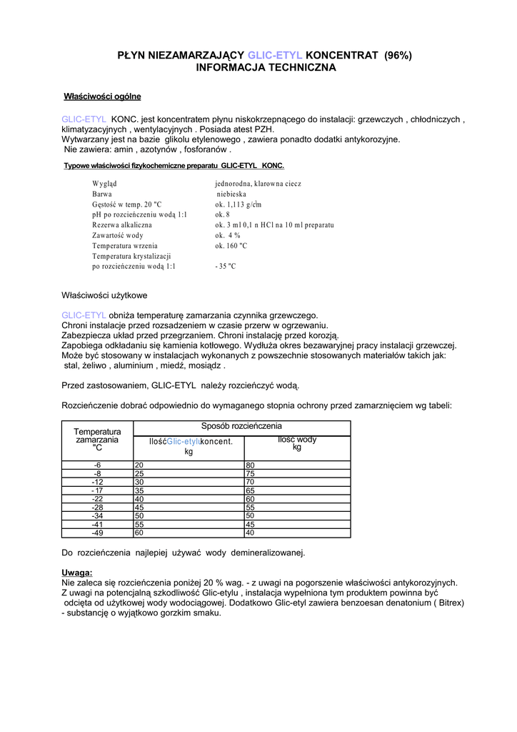 PŁYN NIEZAMARZAJĄCY GLIC-ETYL KONCENTRAT (96%) INFORMACJA TECHNICZNA Właściwości ogólne GLIC-ETYL KONC. jest koncentratem płynu niskokrzepnącego do instalacji: grzewczych , chłodniczych , klimatyzacyjnych , wentylacyjnych . Posiada atest PZH. Wytwarzany jest na bazie glikolu etylenowego , zawiera ponadto dodatki antykorozyjne. Nie zawiera: amin , azotynów , fosforanów . Typowe właściwości fizykochemiczne preparatu GLIC-ETYL KONC. W ygląd Barwa Gęstość w temp. 20 "C pH po rozcieńczeniu w odą 1:1 Rezerw a alkaliczna Zawartość wody Temperatura wrzenia Temperatura krystalizacji po rozcieńczeniu w odą 1:1 jednorodna, klarow na ciecz niebieska 3 ok. 1,113 g/cm ok. 8 ok. 3 m l 0,1 n H C l na 10 m l preparatu ok. 4 % ok. 160 "C - 35 "C Właściwości użytkowe GLIC-ETYL obniża temperaturę zamarzania czynnika grzewczego. Chroni instalacje przed rozsadzeniem w czasie przerw w ogrzewaniu. Zabezpiecza układ przed przegrzaniem. Chroni instalację przed korozją. Zapobiega odkładaniu się kamienia kotłowego. Wydłuża okres bezawaryjnej pracy instalacji grzewczej. Może być stosowany w instalacjach wykonanych z powszechnie stosowanych materiałów takich jak: stal, żeliwo , aluminium , miedź, mosiądz . Przed zastosowaniem, GLIC-ETYL należy rozcieńczyć wodą. Rozcieńczenie dobrać odpowiednio do wymaganego stopnia ochrony przed zamarznięciem wg tabeli: Sposób rozcieńczenia Temperatura zamarzania "C -6 20 -8 -12 25 30 35 40 45 50 55 - 17 -22 -28 -34 -41 -49 Ilość wody kg IlośćGlic-etylukoncent. kg 60 80 75 70 65 60 55 50 45 40 Do rozcieńczenia najlepiej używać wody demineralizowanej. Uwaga: Nie zaleca się rozcieńczenia poniżej 20 % wag. - z uwagi na pogorszenie właściwości antykorozyjnych. Z uwagi na potencjalną szkodliwość Glic-etylu , instalacja wypełniona tym produktem powinna być odcięta od użytkowej wody wodociągowej. Dodatkowo Glic-etyl zawiera benzoesan denatonium ( Bitrex) - substancję o wyjątkowo gorzkim smaku.