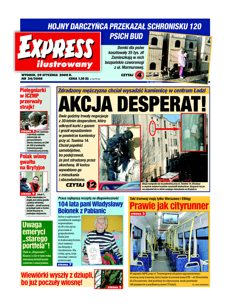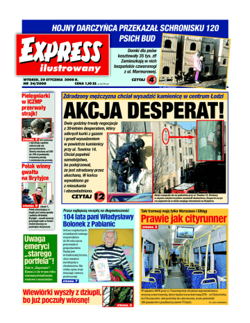 HOJNY DARCZYŃCA PRZEKAZAŁ SCHRONISKU 120 PSICH BUD Domki dla psów kosztowały 35 tys. zł! Zamieszkają w nich bezpańskie czworonogi z ul. Marmurowej. WTOREK, 29 STYCZNIA 2008 R. NR 24/2008 CENA 1,10 ZŁ CZYTAJ W TYM 7% VAT 4 FOT. AGATA KOMOROWSKA Pielęgniarki w ICZMP przerwały strajk! FOT. ŁUKASZ KASPRZAK Zdradzony mężczyzna chciał wysadzić kamienicę w centrum Łodzi STRONA 5 Ich rozmowy z dyrekcją szpitala zakończyły się porozumieniem. Siostry dostaną od 200 do 350 zł podwyżki, trzynastą pensję i comiesięczną premię. FOT. PAP/EPA Polak winny gwałtu na Brytyjce STRONA 9 Jakub T., Polak mieszkający w Anglii, jest winny gwałtu i pobicia 48-letniej Brytyjki – uznali wczoraj przysięgli sądu w Exeter. Został skazany na podwójne dożywocie. Uwaga emeryci „starego portfela”! Dziś w „Expressie”: Komu i o ile w tym roku wzrosną świadczenia rentowe i emerytalne. AKCJA DESPERAT! Dwie godziny trwały negocjacje z 30-letnim desperatem, który odkręcił kurki z gazem i groził wysadzeniem w powietrze kamienicy przy ul. Tuwima 14. Chciał popełnić samobójstwo, bo podejrzewał, że jest zdradzany przez ukochaną. W końcu wywabiono go z mieszkania i obezwładniono. CZYTAJ 12 Akcja rozegrała się na podwórku przy ul. Tuwima 14. Strażacy w asyście antyterrorystów rozstawili skokochron. Desperat raz po raz pojawiał się w oknie swojego mieszkania na III piętrze. Praca najlepszą receptą na długowieczność 104 lata pani Władysławy Bolonek z Pabianic Jedna z najstarszych mieszkanek naszego województwa do 90 roku życia pracowała w gospodarstwie. Nadal jest w doskonałej formie, choć ostatnio ma kłopoty z chodzeniem. Ma córkę, syna, troje wnucząt i czworo prawnucząt. STRONA Taki tramwaj mają tylko Warszawa i Elbląg Prawie jak cityrunner STRONA 3 7 Wiewiórki wyszły z dziupli, bo już poczuły wiosnę! STRONA 3 W zajezdni MPK przy ul. Tramwajowej oficjalnie zaprezentowano wczoraj nowy tramwaj, który będzie kursował trasą ŁTR – od Helenówka do Chocianowic. Jest podobny do cityrunnera, może przewieźć 189 pasażerów z prędkością nawet 70 km/h. FOT. AGATA KOMOROWSKA