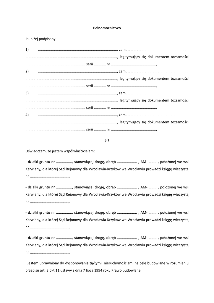 Pełnomocnictwo Ja, niżej podpisany: 1) ..............................................................................., zam. ............................................................. ............................................................................................, legitymujący się dokumentem tożsamości ............................................................ serii ............ nr ............................................., 2) ..............................................................................., zam. ............................................................. ............................................................................................, legitymujący się dokumentem tożsamości ............................................................ serii ............ nr ............................................., 3) ..............................................................................., zam. ............................................................. ............................................................................................, legitymujący się dokumentem tożsamości ............................................................ serii ............ nr ............................................., 4) ..............................................................................., zam. ............................................................. ............................................................................................, legitymujący się dokumentem tożsamości ............................................................ serii ............ nr ............................................., §1 Oświadczam, że jestem współwłaścicielem: - działki gruntu nr ................, stanowiącej drogę, obręb .................... , AM- ........ , położonej we wsi Karwiany, dla której Sąd Rejonowy dla Wrocławia-Krzyków we Wrocławiu prowadzi księgę wieczystą nr ......................................., - działki gruntu nr ................, stanowiącej drogę, obręb .................... , AM- ........ , położonej we wsi Karwiany, dla której Sąd Rejonowy dla Wrocławia-Krzyków we Wrocławiu prowadzi księgę wieczystą nr ......................................., - działki gruntu nr ................, stanowiącej drogę, obręb .................... , AM- ........ , położonej we wsi Karwiany, dla której Sąd Rejonowy dla Wrocławia-Krzyków we Wrocławiu prowadzi księgę wieczystą nr ......................................., - działki gruntu nr ................, stanowiącej drogę, obręb .................... , AM- ........ , położonej we wsi Karwiany, dla której Sąd Rejonowy dla Wrocławia-Krzyków we Wrocławiu prowadzi księgę wieczystą nr ......................................., i jestem uprawniony do dysponowania tą/tymi nieruchomościami na cele budowlane w rozumieniu przepisu art. 3 pkt 11 ustawy z dnia 7 lipca 1994 roku Prawo budowlane. §2 Ustanawiam moim pełnomocnikiem Stowarzyszenie Mieszkańców „Karwiany-Komorowice” z siedzibą w Karwianach i umocowuję do: a) wyrażenia w moim imieniu wobec innych współwłaścicieli nieruchomości zgody na przeprowadzenie na tej nieruchomości procesu inwestycyjnego polegającego na inwentaryzacji geodezyjnej istniejących sieci kanalizacji wodnej, sanitarnej i deszczowej, zaprojektowaniu oraz budowie lub przebudowie tych sieci a także na budowie lub przebudowie drogi ulicy Wiosennej; b) odebrania w moim imieniu takich oświadczeń o wyrażeniu zgody od innych współwłaścicieli; c) reprezentowania mnie przed wszystkimi osobami fizycznymi i prawnymi, jednostkami organizacyjnymi nie posiadającymi osobowości prawnej, sądami powszechnymi i administracyjnymi oraz organami administracji publicznej, także w postępowaniach prowadzonych na podstawie ustawy, w celu zrealizowania inwestycji, o której mowa w punkcie a. d) w tym do udzielenia w moim imieniu innej osobie lub podmiotowi zgody na dysponowanie nieruchomością/nieruchomościami na cele budowlane w zakresie niezbędnym dla realizacji inwestycji, o której mowa w punkcie a., według wyboru i uznania stowarzyszenia. §3 Oświadczam, że umocowanie to nie wygasa z chwilą śmierci mocodawcy. Podpisy: 1) ....................................................... , miejscowość ........................................ data ...................... 2) ....................................................... , miejscowość ........................................ data ...................... 3) ....................................................... , miejscowość ........................................ data ...................... 4) ....................................................... , miejscowość ........................................ data ......................