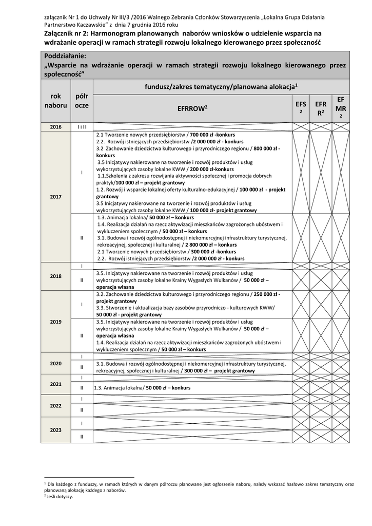 załącznik Nr 1 do Uchwały Nr III/3 /2016 Walnego Zebrania Członków Stowarzyszenia „Lokalna Grupa Działania Partnerstwo Kaczawskie” z dnia 7 grudnia 2016 roku Załącznik nr 2: Harmonogram planowanych naborów wniosków o udzielenie wsparcia na wdrażanie operacji w ramach strategii rozwoju lokalnego kierowanego przez społeczność Poddziałanie: „Wsparcie na wdrażanie operacji w ramach strategii rozwoju lokalnego kierowanego przez społeczność” fundusz/zakres tematyczny/planowana alokacja1 rok naboru 2016 półr ocze EFRROW2 EFS 2 EFR R2 EF MR 2 I i II I 2017 II 2.1 Tworzenie nowych przedsiębiorstw / 700 000 zł -konkurs 2.2. Rozwój istniejących przedsiębiorstw /2 000 000 zł - konkurs 3.2 Zachowanie dziedzictwa kulturowego i przyrodniczego regionu / 800 000 zł konkurs 3.5 Inicjatywy nakierowane na tworzenie i rozwój produktów i usług wykorzystujących zasoby lokalne KWW / 200 000 zł-konkurs 1.1.Szkolenia z zakresu rozwijania aktywności społecznej i promocja dobrych praktyk/100 000 zł – projekt grantowy 1.2. Rozwój i wsparcie lokalnej oferty kulturalno-edukacyjnej / 100 000 zł - projekt grantowy 3.5 Inicjatywy nakierowane na tworzenie i rozwój produktów i usług wykorzystujących zasoby lokalne KWW / 100 000 zł- projekt grantowy 1.3. Animacja lokalna/ 50 000 zł – konkurs 1.4. Realizacja działań na rzecz aktywizacji mieszkańców zagrożonych ubóstwem i wykluczeniem społecznym / 50 000 zł – konkurs 3.1. Budowa i rozwój ogólnodostępnej i niekomercyjnej infrastruktury turystycznej, rekreacyjnej, społecznej i kulturalnej / 2 800 000 zł – konkurs 2.1 Tworzenie nowych przedsiębiorstw / 300 000 zł -konkurs 2.2. Rozwój istniejących przedsiębiorstw /2 000 000 zł - konkurs I 2018 II I 2019 II 3.5. Inicjatywy nakierowane na tworzenie i rozwój produktów i usług wykorzystujących zasoby lokalne Krainy Wygasłych Wulkanów / 50 000 zł – operacja własna 3.2. Zachowanie dziedzictwa kulturowego i przyrodniczego regionu / 250 000 zł projekt grantowy 3.3. Stworzenie i aktualizacja bazy zasobów przyrodniczo - kulturowych KWW/ 50 000 zł - projekt grantowy 3.5. Inicjatywy nakierowane na tworzenie i rozwój produktów i usług wykorzystujących zasoby lokalne Krainy Wygasłych Wulkanów / 50 000 zł – operacja własna 1.4. Realizacja działań na rzecz aktywizacji mieszkańców zagrożonych ubóstwem i wykluczeniem społecznym / 50 000 zł – konkurs I 2020 II 3.1. Budowa i rozwój ogólnodostępnej i niekomercyjnej infrastruktury turystycznej, rekreacyjnej, społecznej i kulturalnej / 300 000 zł – projekt grantowy I 2021 II 1.3. Animacja lokalna/ 50 000 zł – konkurs I 2022 II I 2023 II 1 Dla każdego z funduszy, w ramach których w danym półroczu planowane jest ogłoszenie naboru, należy wskazać hasłowo zakres tematyczny oraz planowaną alokację każdego z naborów. 2 Jeśli dotyczy.