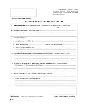 Zaświadczenie wydaje lekarz psychiatra dla osoby chorej psychicznie ubiegającej się o skierowanie do domu pomocy społecznej Pieczątka zakładu opieki zdrowotnej ZAŚWIADCZENIE LEKARZA PSYCHIATRY 1. Imię i nazwisko osoby obiegającej się o skierowanie do domu pomocy społecznej …....................................................................................................... wiek ….......................... 2. Szczegółowa diagnoza psychiatryczna …......................................................................................... ............................................................................................................................................................. …......................................................................................................................................................... 3. Przebieg leczenia: a. data pierwszej hospitalizacji …....................................................... , ostatniej ............................... b. liczba hospitalizacji ….................................... , łączny czas hospitalizacji …............................. c. główne powody hospitalizacji …............. ...................................................................................... …........................................................................................................................................................ …........................................................................................................................................................ 4. Opis aktualnego stanu zdrowia psychicznego osoby badanej i prognoza stanu zdrowia ….......................................................................................................................................................... ….......................................................................................................................................................... ….......................................................................................................................................................... ….......................................................................................................................................................... Charakterystyczne cechy funkcjonowania w środowisku osoby obiegającej się 5. o skierowanie do domu pomocy społecznej …....................................................................................... …............................................................................................................................................................................. …............................................................................................................................................................................. …............................................................................................................................................................................. 6. Lekarz prowadzący (imię i nazwisko, adres, numer telefonu) …...................................................... …........................................................................................................................................................... 7. Uwagi uzupełniające i zalecenia lekarza …....................................................................................... …......................................................................................................................................................... …......................................................................................................................................................... ............................................................................................................................................................. ............................................................................................................................................................. Miejscowość Data …................................................ …........................................... Podpis i pieczęć lekarza psychiatry