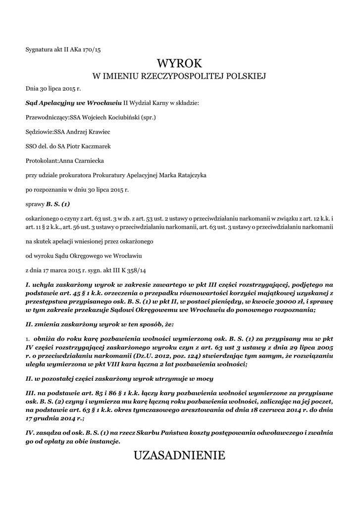 Sygnatura akt II AKa 170/15 WYROK W IMIENIU RZECZYPOSPOLITEJ POLSKIEJ Dnia 30 lipca 2015 r. Sąd Apelacyjny we Wrocławiu II Wydział Karny w składzie: Przewodniczący:SSA Wojciech Kociubiński (spr.) Sędziowie:SSA Andrzej Krawiec SSO del. do SA Piotr Kaczmarek Protokolant:Anna Czarniecka przy udziale prokuratora Prokuratury Apelacyjnej Marka Ratajczyka po rozpoznaniu w dniu 30 lipca 2015 r. sprawy B. S. (1) oskarżonego o czyny z art. 63 ust. 3 w zb. z art. 53 ust. 2 ustawy o przeciwdziałaniu narkomanii w związku z art. 12 k.k. i art. 11 § 2 k.k., art. 56 ust. 3 ustawy o przeciwdziałaniu narkomanii, art. 63 ust. 3 ustawy o przeciwdziałaniu narkomanii na skutek apelacji wniesionej przez oskarżonego od wyroku Sądu Okręgowego we Wrocławiu z dnia 17 marca 2015 r. sygn. akt III K 358/14 I. uchyla zaskarżony wyrok w zakresie zawartego w pkt III części rozstrzygającej, podjętego na podstawie art. 45 § 1 k.k. orzeczenia o przepadku równowartości korzyści majątkowej uzyskanej z przestępstwa przypisanego osk. B. S. (1) w pkt II, w postaci pieniędzy, w kwocie 30000 zł, i sprawę w tym zakresie przekazuje Sądowi Okręgowemu we Wrocławiu do ponownego rozpoznania; II. zmienia zaskarżony wyrok w ten sposób, że: 1. obniża do roku karę pozbawienia wolności wymierzoną osk. B. S. (1) za przypisany mu w pkt IV części rozstrzygającej zaskarżonego wyroku czyn z art. 63 ust 3 ustawy z dnia 29 lipca 2005 r. o przeciwdziałaniu narkomanii (Dz.U. 2012, poz. 124) stwierdzając tym samym, że rozwiązaniu uległa wymierzona w pkt VIII kara łączna 2 lat pozbawienia wolności; II. w pozostałej części zaskarżony wyrok utrzymuje w mocy III. na podstawie art. 85 i 86 § 1 k.k. łączy kary pozbawienia wolności wymierzone za przypisane osk. B. S. (2) czyny i wymierza mu karę łączną roku pozbawienia wolności, zaliczając na jej poczet, na podstawie art. 63 § 1 k.k. okres tymczasowego aresztowania od dnia 18 czerwca 2014 r. do dnia 17 grudnia 2014 r.; IV. zasądza od osk. B. S. (1) na rzecz Skarbu Państwa koszty postępowania odwoławczego i zwalnia go od opłaty za obie instancje. UZASADNIENIE B. S. (2) został oskarżony o to, że: I. w okresie od grudnia 2013r. do marca 2014r. w P., działając wbrew przepisom ustawy, z góry powziętym zamiarem w celu osiągnięcia korzyści majątkowej uprawiał krzewy ziela konopi innych niż włókniste mogących dostarczyć znacznej ilości ziela, a następnie wytwarzał z nich środek odurzających w ten sposób, że po uzyskaniu dojrzałości kwiatostanów zebrał je i wysuszył, uzyskując w ten sposób nie mniej niż 2 kilogramy ziela konopi innych niż włókniste o wartości nie niższej niż 40,000 zł tj. o czyn z art. 63 ust.1 i 3 i art. 53 ust. 2 i art. ustawy z dnia 29 lipca 2005 r. o przeciwdziałaniu narkomanii w związku z art. 12 k.k. i art. 11 § 2 k.k.; II. w marcu 2014r. we W., działając wbrew przepisom ustawy, w z góry powziętym zamiarem i celu osiągnięcia korzyści majątkowej wprowadził do obrotu nie mniej niż 2 kilogramy środków odurzających w postaci ziela konopi innych niż włókniste, w ten sposób, że sprzedał je mężczyźnie o nieustalonej tożsamości za kwotę 30,000 zł, tj. o czyn z art. 56 ust. 1 i 3 ustawy z dnia 29 lipca 2005r. o przeciwdziałaniu narkomanii; III. w okresie od marca 2014r. do 18 czerwca 2014r. w P. działając wbrew przepisom ustawy, w z góry powziętym zamiarem i w celu osiągnięcia korzyści majątkowej uprawiał krzewy ziela konopi innych niż włókniste mogących dostarczyć znacznej ilości ziela, tj. o czyn z art. 63 ust. 3 ustawy z dnia 29 lipca 2005r. o przeciwdziałaniu narkomanii w związku z art. 12 k.k.; IV. w dniu 18 czerwca 2014r. w G. wbrew przepisom ustawy posiadał środki odurzające w postaci suszu ziela konopi innych niż włókniste w ilości 3,24 grama netto, tj. o czyn z art. 62 ust. 1 ustawy z dnia 29 lipca 2005 r. o przeciwdziałaniu narkomanii. Sąd Okręgowy we Wrocławiu wyrokiem z dnia 17 marca 2015 r. orzekł: I. Uznał B. S. (1) za winnego tego, że w okresie od grudnia 2013r. do marca 2014r. w P., działając wbrew przepisom ustawy, w wykonaniu z góry powziętego zamiaru w celu osiągnięcia korzyści majątkowej uprawiał konopie inne niż włókniste w ilości pozwalającej dostarczyć znaczną ilości ziela konopi, a następnie wytworzył z nich znaczną ilość środka odurzającego w ten sposób, że po uzyskaniu dojrzałości kwiatostanów zebrał je i wysuszył, uzyskując w ten sposób 2 kilogramy marihuany tj. przestępstwa z art. 63 ust. 3 w zb. z art. 53 ust. 2 ustawy z dnia 29 lipca 2005 r. o przeciwdziałaniu narkomanii (Dz. U. 2012 poz. 124 zm.) w związku z art. 12 kk. i art. 11 § 2 kk. i za to na podstawie art. 53 ust. 2 ustawy z dnia 29 lipca 2005 r. o przeciwdziałaniu narkomanii w zw. z art. 11§3 kk. przy zastosowaniu art. 60 § 2 i 6 pkt 2 kk. wymierzył karę 1 (jednego) roku pozbawienia wolności i grzywnę w wysokości 200 (dwustu) stawek ustalając wysokość jednej stawki na kwotę 20 (dwudziestu) złotych; II. Uznał B. S. (1) za winnego tego, że w marcu 2014r. we W., działając wbrew przepisom ustawy i celu osiągnięcia korzyści majątkowej wprowadził do obrotu znaczną ilość środka odurzającego w postaci 2 kilogramów marihuany, w ten sposób, że sprzedał go nieustalonemu mężczyźnie za kwotę 30 000, 00 zł, tj. przestępstwa z art. 56 ust. 3 ustawy z dnia 29 lipca 2005r. o przeciwdziałaniu narkomanii (Dz. U. z 2012r., poz. 124) i za to na podstawie art. 56 ust. 3 ustawy z dnia 29 lipca 2005 r. o przeciwdziałaniu narkomanii przy zastosowaniu art. 60 § 2 i 6 pkt 3 kk. wymierzył karę 1 (jednego) roku pozbawienia wolności i 200 (dwustu) stawek dziennych grzywny ustalając wysokość jednej stawki dziennej na kwotę 20 (dwudziestu) złotych i na podstawie 45 § 1 kk. orzekł przepadek równowartości korzyści majątkowej uzyskanej z przestępstwa przypisanego w punkcie II w kwocie 30 