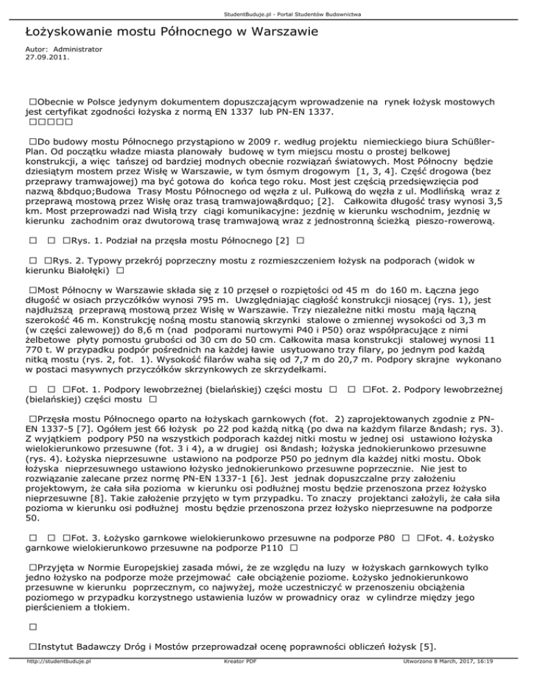 StudentBuduje.pl - Portal Studentów Budownictwa Łożyskowanie mostu Północnego w Warszawie Autor: Administrator 27.09.2011. Obecnie w Polsce jedynym dokumentem dopuszczającym wprowadzenie na rynek łożysk mostowych jest certyfikat zgodności łożyska z normą EN 1337 lub PN-EN 1337. Do budowy mostu Północnego przystąpiono w 2009 r. według projektu niemieckiego biura SchüßlerPlan. Od początku władze miasta planowały budowę w tym miejscu mostu o prostej belkowej konstrukcji, a więc tańszej od bardziej modnych obecnie rozwiązań światowych. Most Północny będzie dziesiątym mostem przez Wisłę w Warszawie, w tym ósmym drogowym [1, 3, 4]. Część drogowa (bez przeprawy tramwajowej) ma być gotowa do końca tego roku. Most jest częścią przedsięwzięcia pod nazwą „Budowa Trasy Mostu Północnego od węzła z ul. Pułkową do węzła z ul. Modlińską wraz z przeprawą mostową przez Wisłę oraz trasą tramwajową” [2]. Całkowita długość trasy wynosi 3,5 km. Most przeprowadzi nad Wisłą trzy ciągi komunikacyjne: jezdnię w kierunku wschodnim, jezdnię w kierunku zachodnim oraz dwutorową trasę tramwajową wraz z jednostronną ścieżką pieszo-rowerową. Rys. 1. Podział na przęsła mostu Północnego [2] Rys. 2. Typowy przekrój poprzeczny mostu z rozmieszczeniem łożysk na podporach (widok w kierunku Białołęki) Most Północny w Warszawie składa się z 10 przęseł o rozpiętości od 45 m do 160 m. Łączna jego długość w osiach przyczółków wynosi 795 m. Uwzględniając ciągłość konstrukcji niosącej (rys. 1), jest najdłuższą przeprawą mostową przez Wisłę w Warszawie. Trzy niezależne nitki mostu mają łączną szerokość 46 m. Konstrukcję nośną mostu stanowią skrzynki stalowe o zmiennej wysokości od 3,3 m (w części zalewowej) do 8,6 m (nad podporami nurtowymi P40 i P50) oraz współpracujące z nimi żelbetowe płyty pomostu grubości od 30 cm do 50 cm. Całkowita masa konstrukcji stalowej wynosi 11 770 t. W przypadku podpór pośrednich na każdej ławie usytuowano trzy filary, po jednym pod każdą nitką mostu (rys. 2, fot. 1). Wysokość filarów waha się od 7,7 m do 20,7 m. Podpory skrajne wykonano w postaci masywnych przyczółków skrzynkowych ze skrzydełkami. Fot. 1. Podpory lewobrzeżnej (bielańskiej) części mostu (bielańskiej) części mostu Fot. 2. Podpory lewobrzeżnej Przęsła mostu Północnego oparto na łożyskach garnkowych (fot. 2) zaprojektowanych zgodnie z PNEN 1337-5 [7]. Ogółem jest 66 łożysk po 22 pod każdą nitką (po dwa na każdym filarze – rys. 3). Z wyjątkiem podpory P50 na wszystkich podporach każdej nitki mostu w jednej osi ustawiono łożyska wielokierunkowo przesuwne (fot. 3 i 4), a w drugiej osi – łożyska jednokierunkowo przesuwne (rys. 4). Łożyska nieprzesuwne ustawiono na podporze P50 po jednym dla każdej nitki mostu. Obok łożyska nieprzesuwnego ustawiono łożysko jednokierunkowo przesuwne poprzecznie. Nie jest to rozwiązanie zalecane przez normę PN-EN 1337-1 [6]. Jest jednak dopuszczalne przy założeniu projektowym, że cała siła pozioma w kierunku osi podłużnej mostu będzie przenoszona przez łożysko nieprzesuwne [8]. Takie założenie przyjęto w tym przypadku. To znaczy projektanci założyli, że cała siła pozioma w kierunku osi podłużnej mostu będzie przenoszona przez łożysko nieprzesuwne na podporze 50. Fot. 3. Łożysko garnkowe wielokierunkowo przesuwne na podporze P80 Fot. 4. Łożysko garnkowe wielokierunkowo przesuwne na podporze P110 Przyjęta w Normie Europejskiej zasada mówi, że ze względu na luzy w łożyskach garnkowych tylko jedno łożysko na podporze może przejmować całe obciążenie poziome. Łożysko jednokierunkowo przesuwne w kierunku poprzecznym, co najwyżej, może uczestniczyć w przenoszeniu obciążenia poziomego w przypadku korzystnego ustawienia luzów w prowadnicy oraz w cylindrze między jego pierścieniem a tłokiem. Instytut Badawczy Dróg i Mostów przeprowadzał ocenę poprawności obliczeń łożysk [5]. http://studentbuduje.pl Kreator PDF Utworzono 8 March, 2017, 16:19 StudentBuduje.pl - Portal Studentów Budownictwa Zweryfikowano przede wszystkim te ich parametry, które mają największy wpływ na zachowanie łożysk podczas eksploatacji. Sprawdzeniu podlegały: - naprężenie docisku do płyty elastomerowej, - naprężenie docisku do arkusza PTFE, - warunek nieprzekroczenia nośności obliczeniowej przy obciążeniu mimośrodowym, - współczynnik tarcia przy docisku osiowym, - możliwość obrotu tłoka względem pierścienia cylindra z zachowaniem: – bezpiecznej odległości między krawędzią tłoka a krawędzią pierścienia cylindra, – odpowiedniego luzu między kołnierzem tłoka a krawędzią pierścienia cylindra. W obliczeniach łożysk wykonanych przez biuro Reisner & Wolff Engineering przy wyznaczaniu nośności łożysk na siły poziome przyjęto, że w przenoszeniu tych sił bierze udział tarcie powierzchni ślizgowych, co jest niezgodne z wymaganiami PN-EN 1337 [6, 8]. Nie miało to jednak wpływu na ogólną ocenę poprawności obliczeń łożysk. Nośność obliczeniowa łożysk garnkowych zastosowanych w moście Północnym mieściła się w zakresie od 500 kN do 50 000 kN. Łożyska przesuwne umożliwiają przemieszczenia do ą270 mm. Największe z łożysk ma średnicę 1200 mm i masę ponad 3,5 t. W związku z powstaniem Normy Europejskiej EN 1337 i obowiązkiem jej stosowania obecnie w Polsce jedynym dokumentem dopuszczającym wprowadzenie na rynek łożysk mostowych jest certyfikat zgodności łożyska z normą EN 1337 lub PN-EN 1337. Ten certyfikat zgodności jest wydawany wtedy, gdy łożysko pod względem materiałowym i konstrukcyjnym mieści się w zakresie normy EN 1337 lub PNEN 1337. Upoważnionymi do wydawania certyfikatów zgodności z EN 1337 lub PN-EN 1337 są akredytowane laboratoria lub instytucje. Każde łożysko spełniające wymagania EN 1337 otrzymuj