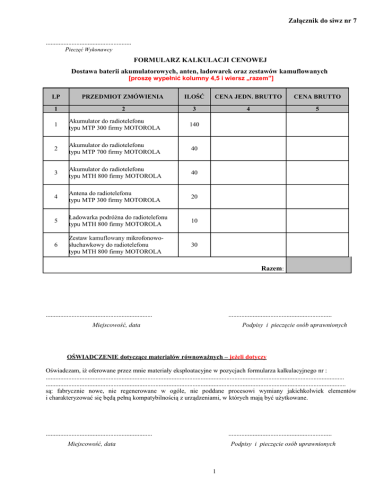 Załącznik do siwz nr 7 ..................................................... Pieczęć Wykonawcy FORMULARZ KALKULACJI CENOWEJ Dostawa baterii akumulatorowych, anten, ładowarek oraz zestawów kamuflowanych [proszę wypełnić kolumny 4,5 i wiersz „razem”] LP PRZEDMIOT ZMÓWIENIA ILOŚĆ CENA JEDN. BRUTTO CENA BRUTTO 1 2 3 4 5 1 Akumulator do radiotelefonu typu MTP 300 firmy MOTOROLA 140 2 Akumulator do radiotelefonu typu MTP 700 firmy MOTOROLA 40 3 Akumulator do radiotelefonu typu MTH 800 firmy MOTOROLA 40 4 Antena do radiotelefonu typu MTP 300 firmy MOTOROLA 20 5 Ładowarka podróżna do radiotelefonu typu MTH 800 firmy MOTOROLA 10 6 Zestaw kamuflowany mikrofonowosłuchawkowy do radiotelefonu typu MTH 800 firmy MOTOROLA 30 Razem: .................................................................. ................................................................ Miejscowość, data Podpisy i pieczęcie osób uprawnionych OŚWIADCZENIE dotyczące materiałów równoważnych – jeżeli dotyczy Oświadczam, iż oferowane przez mnie materiały eksploatacyjne w pozycjach formularza kalkulacyjnego nr : ......................................................................................................................................................................................... .......................................................................................................................................................................................... są: fabrycznie nowe, nie regenerowane w ogóle, nie poddane procesowi wymiany jakichkolwiek elementów i charakteryzować się będą pełną kompatybilnością z urządzeniami, w których mają być użytkowane. .................................................................. ................................................................ Miejscowość, data Podpisy i pieczęcie osób uprawnionych 1