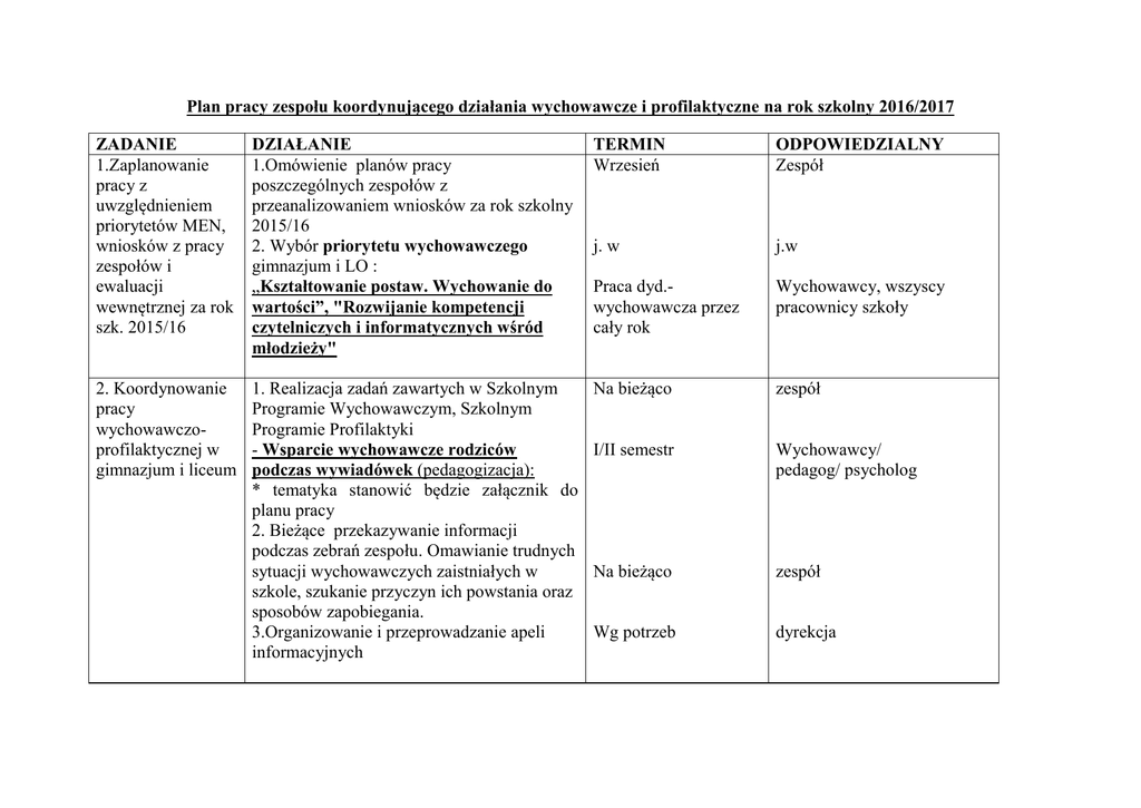 Plan pracy zespołu koordynującego działania wychowawcze i
