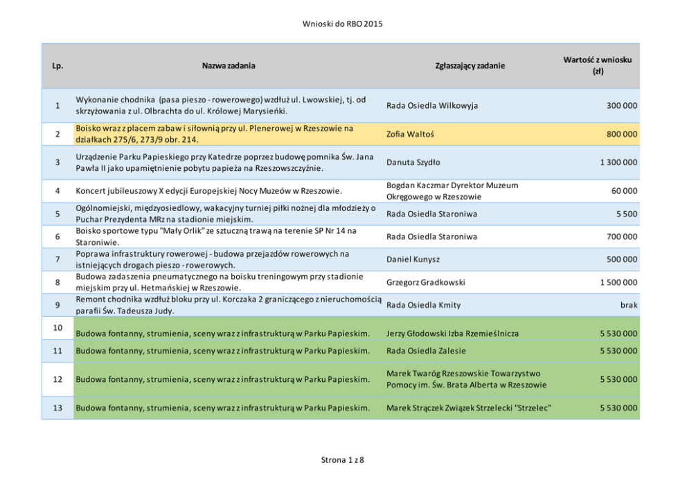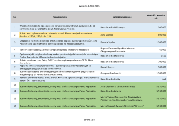 Wnioski do RBO 2015 Lp. Nazwa zadania Zgłaszający zadanie Wartość z wniosku (zł) 1 Wykonanie chodnika (pasa pieszo - rowerowego) wzdłuż ul. Lwowskiej, tj. od skrzyżowania z ul. Olbrachta do ul. Królowej Marysieńki. Rada Osiedla Wilkowyja 300 000 2 Boisko wraz z placem zabaw i siłownią przy ul. Plenerowej w Rzeszowie na działkach 275/6, 273/9 obr. 214. Zofia Waltoś 800 000 3 Urządzenie Parku Papieskiego przy Katedrze poprzez budowę pomnika Św. Jana Pawła II jako upamiętnienie pobytu papieża na Rzeszowszczyźnie. Danuta Szydło 4 Koncert jubileuszowy X edycji Europejskiej Nocy Muzeów w Rzeszowie. Bogdan Kaczmar Dyrektor Muzeum Okręgowego w Rzeszowie 5 6 7 8 9 10 Ogólnomiejski, międzyosiedlowy, wakacyjny turniej piłki nożnej dla młodzieży o Puchar Prezydenta MRz na stadionie miejskim. Boisko sportowe typu "Mały Orlik" ze sztuczną trawą na terenie SP Nr 14 na Staroniwie. Poprawa infrastruktury rowerowej - budowa przejazdów rowerowych na istniejących drogach pieszo - rowerowych. Budowa zadaszenia pneumatycznego na boisku treningowym przy stadionie miejskim przy ul. Hetmańskiej w Rzeszowie. Remont chodnika wzdłuż bloku przy ul. Korczaka 2 graniczącego z nieruchomością parafii Św. Tadeusza Judy. 1 300 000 60 000 Rada Osiedla Staroniwa 5 500 Rada Osiedla Staroniwa 700 000 Daniel Kunysz 500 000 Grzegorz Gradkowski Rada Osiedla Kmity 1 500 000 brak Budowa fontanny, strumienia, sceny wraz z infrastrukturą w Parku Papieskim. Jerzy Głodowski Izba Rzemieślnicza 5 530 000 11 Budowa fontanny, strumienia, sceny wraz z infrastrukturą w Parku Papieskim. Rada Osiedla Zalesie 5 530 000 12 Budowa fontanny, strumienia, sceny wraz z infrastrukturą w Parku Papieskim. Marek Twaróg Rzeszowskie Towarzystwo Pomocy im. Św. Brata Alberta w Rzeszowie 5 530 000 13 Budowa fontanny, strumienia, sceny wraz z infrastrukturą w Parku Papieskim. Marek Strączek Związek Strzelecki "Strzelec" 5 530 000 Strona 1 z 8 Wnioski do RBO 2015 Lp. 14 15 16 Nazwa zadania Zgłaszający zadanie Budowa placu zabaw w parku na Osiedlu Miłocin wraz z ławeczkami i koszami na Rada Osiedla Miłocin śmieci. Docieplenie i wykonanie elewacji budynku (1257m2) Szkoły Podstawowej Nr 24 Elżbieta Chodzińska w Rzeszowie oraz konserwacja dachu (1030m2). Boisko wraz z placem zabaw i siłownią przy ul. Plenerowej w Rzeszowie na Rada Osiedla Fr. Kotuli działkach 275/6, 273/9 obr. 214. Wartość z wniosku (zł) 300 000 300 000 800 000 Budowa dwupasmowego ronda (o parametrach analogicznych jak rondo Pileckiego) na skrzyżowaniu ul. Strzyżowskiej i Bł. Karoliny wraz z zatoką autobusową na ul. Bł. Karoliny zgodnie z załącznikiem graficznym. Rada Osiedla Fr. Kotuli 18 Budowa fontanny, strumienia, sceny wraz z infrastrukturą w Parku Papieskim. Nina Kitlińska Stowarzyszenie Przyjaciół Podkarpackiej Rodziny Szkół im. Jana Pawła II 5 530 000 19 Budowa fontanny, strumienia, sceny wraz z infrastrukturą - Park Papieski. Józef Wicher Rzeszowskie Stowarzyszenie Dziedzictwo jana Pawła II "LUMEN ET SPES" 5 530 000 20 Budowa fontanny, strumienia, sceny wraz z infrastrukturą w Parku Papieskim. Ks. Janusz Podlaszczak Parafia Rzymskokatolicka pw. Chrystusa Króla 5 530 000 21 Budowa fontanny, strumienia, sceny wraz z infrastrukturą w Parku Papieskim. Bożena Borkowska - Bała 5 530 000 22 Budowa fontanny, strumienia, sceny wraz z infrastrukturą w Parku Papieskim. Rada Osiedla Nowe Miasto 5 530 000 23 Budowa fontanny, strumienia, sceny wraz z infrastrukturą w Parku Papieskim. Rada Osiedla Wilkowyja 5 530 000 24 Budowa fontanny, strumienia, sceny wraz z infrastrukturą w Parku Papieskim. Krzysztof Szmigiel 5 530 000 17 Strona 2 z 8 800 000 Wnioski do RBO 2015 Lp. 25 26 27 28 29 30 31 32 33 34 35 Nazwa zadania Zgłaszający zadanie Budowa dwupasmowego ronda (o parametrach analogicznych jak rondo Pileckiego) na skrzyżowaniu ul. Strzyżowskiej i Bł. Karoliny wraz z zatoką autobusową na ul. Bł. Karoliny zgodnie z załącznikiem graficznym. Boisko wraz z placem zabaw i siłownią przy ul. Plenerowej w Rzeszowie na działkach 275/6, 273/9 obr. 214. Modernizacja nawierzchni boiska sportowego Zespołu Szkół Nr 5 przy ul. Beskidzkiej. Powołanie trenerów osiedlowych Przyspieszenie rewitalizacji Parku Miejskiego przy ul. Rycerskiej, zgodnie z opracowanym projektem. Pakiet edukacyjno - zdrowotny dla emerytów i rencistów. EduCursus - specjalistyczna pomoc dla dzieci ze specjalnymi potrzebami rozwojowymi i edukacyjnymi. Opracowanie projektu technicznego oraz budowa siłowni na świeżym powietrzu na Osiedlu Załęże. Wykonanie nakładki asfaltowej na parkingu przy sklepie "LUX" ul. Bohaterów 4 oraz drogi dojazdowej do budynków przy ul. Bohaterów 6 i 10. Opracowanie projektu technicznego oraz budowa boiska ze sztuczną nawierzchnią na Osiedlu Załęże. Zakup i zamontowanie lamp oświetleniowych na stadionie sportowym K.S. "Korona" Rzeszów. Wartość z wniosku (zł) Jacek Grochola 800 000 Danuta Solarz 800 000 Rada Osiedla Zwięczyca 300 000 Andrzej Dec 165 000 Rada Osiedla 1000 - lecia 2 800 000 Rada Osiedla 1000 - lecia 50 000 Krzysztof Janik 120 000 Rada Osiedla Załęże 115 000 Rada Osiedla Kmity brak Rada Osiedla Załęże 795 000 Tadeusz Świgoń 15 000 36 Street workout Park Sybiraków. Jacek Adamowicz Stowarzyszenie Podkarpacka Inicjatywa Obywatelska 40 000 37 Spotkania z fotografią - warsztaty, plenery, prelekcje fotograficzne. Praca w ciemni fotograficznej. Katarzyna Warańska 34 000 Strona 3 z 8 Wnioski do RBO 2015 Lp. Nazwa zadania Zgłaszający zadanie Wartość z wniosku (zł) 38 Osiedlowy plac zabaw dla maluchów i dla dzieci starszych z urządzeniami siłowni Rada Osiedla Baranówka zewnętrznej na Osiedlu Baranówka przy ul. Starzyńskiego. 39 Wybudowanie siłowni na powietrzu wraz z rozbudową placu zabaw dla dzieci oraz montażem dodatkowych barierek ochronnych od strony stawów i ul. Paderewskiego w Parku im. W. Szafera w Rzeszowie. Rada Osiedla Słocina 100 00 40 Doświetlenie prz
