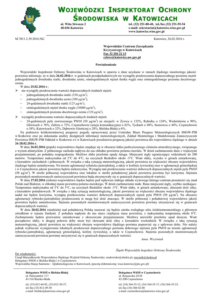 WOJEWÓDZKI INSPEKTORAT OCHRONY ŚRODOWISKA W KATOWICACH ul. Wita Stwosza 2 40-036 Katowice tel. (32) 251-80-40, tel./fax (32) 251-55-54 e-mail: [email protected] www.katowice.wios.gov.pl M.7011.2.39.2016.NG Katowice, 26.02.2016 r. Wojewódzkie Centrum Zarządzania Kryzysowego w Katowicach Fax 32 256 22 13 [email protected] Powiadomienie Wojewódzki Inspektorat Ochrony Środowiska w Katowicach w oparciu o dane uzyskane w ramach śląskiego monitoringu jakości powietrza informuje, że w dniu 26.02.2016 r. w godzinach przedpołudniowych nie wystąpiły przekroczenia dopuszczalnego poziomu stężeń jednogodzinnych dwutlenku siarki, dwutlenku azotu, ośmiogodzinnych stężeń tlenku węgla oraz ośmiogodzinnego poziomu docelowego ozonu. W dniu 25.02.2016 r.: nie wystąpiły przekroczenia wartości dopuszczalnych średnich stężeń: − jednogodzinnych dwutlenku siarki (350 µg/m3), − jednogodzinnych dwutlenku azotu (200 µg/m3), − 24-godzinnych dwutlenku siarki (125 µg/m3), − ośmiogodzinnych stężeń tlenku węgla (10000 µg/m3), − ośmiogodzinnych poziomu docelowego ozonu (120 µg/m3), wystąpiły przekroczenia wartości dopuszczalnych średnich stężeń: 24-godzinnych pyłu zawieszonego PM10 (50 µg/m3) na stacjach: w Żywcu o 132%, Rybniku o 124%, Wodzisławiu o 90%, Gliwicach o 76%, Zabrzu o 72%, Częstochowie (stacja komunikacyjna) o 62%, Tychach o 48%, Sosnowcu o 44%, Częstochowie o 38%, Katowicach o 32%, Dąbrowie Górniczej o 28%, Bielsku-Białej o 6%. Na podstawie krótkoterminowej prognozy pogody opracowanej przez Centralne Biuro Prognoz Meteorologicznych IMGW-PIB w Krakowie oraz po dokonaniu analizy dostępnych informacji meteorologicznych, Zakład Monitoringu i Modelowania Zanieczyszczeń Powietrza IMGW-PIB Oddział w Krakowie z/s w Katowicach przedstawia prognozę jakości powietrza dla województwa śląskiego w dniach 26-28.02.2016 r. W dniu 26.02.2016 (piątek) województwo śląskie znajduje się w obszarze lekko podwyższonego ciśnienia atmosferycznego, związanego z wyżem atlantyckim. Z północnego zachodu napływa do nas chłodne powietrze polarno-morskie. W dzień zachmurzenie duże z większymi przejaśnieniami, po południu rozpogodzenia. Możliwe słabe przelotne opady śniegu. Miejscami mgły ograniczające widzialność do 200 metrów. Temperatura maksymalna od 2°C do 4°C, na szczytach Beskidów około -5°C. Wiatr słaby, wysoko w górach umiarkowany, z kierunków zachodnich i północnych. W związku z taką sytuacją meteorologiczną, jakość powietrza na większości obszaru województwa śląskiego będzie umiarkowana. Na terenie aglomeracji rybnicko-jastrzębskiej, a także w kotlinie żywieckiej oraz w aglomeracji górnośląskiej i w Częstochowie jakość powietrza będzie niekorzystna. Wystąpią tam przekroczenia wartości dobowych dopuszczalnych stężeń pyłu PM10 (50 µg/m3). W strefie północnej województwa oraz lokalnie w strefie południowej jakość powietrza powinna być korzystna. Stężenia pozostałych monitorowanych zanieczyszczeń powietrza będą utrzymywały się w granicach dopuszczalnych wartości. W dniu 27.02.2016 (sobota) województwo śląskie będzie pod wpływem słabego układu wyżowego którego centrum przemieści się znad Polski nad Białoruś, w chłodnej masie powietrza polarno-morskiego. W dzień zachmurzenie małe. Rano miejscami mgły, szybko zanikające. Temperatura maksymalna od 3°C do 5°C, na szczytach Beskidów około -3°C. Wiatr słaby, w górach umiarkowany, okresami dość silny, z kierunków południowych. W związku z taką sytuacją meteorologiczną, jakość powietrza na większości obszaru województwa śląskiego nadal nie będzie korzystna, wystąpią przekroczenia wartości dobowych dopuszczalnych stężeń pyłu PM10 (50 µg/m3). Na obszarze aglomeracji rybnicko-jastrzębskiej przekroczenia te mogą być dość znaczące. W strefie północnej i południowej województwa jakość powietrza będzie umiarkowana. Stężenia pozostałych monitorowanych zanieczyszczeń powietrza powinny utrzymywać się w granicach dopuszczalnych wartości. W dniu 28.02.2016 (niedziela) nad południową Polskę nasuwać się będzie zatoka rozległego niżu śródziemnomorskiego z głównym ośrodkiem w rejonie Sardynii. Z południa napłynie do nas nieco cieplejsza masa powietrza, z maksymalną temperaturą około 8°C. Zachmurzenie będzie przeważnie umiarkowane z okresowymi przejaśnieniami. Możliwy niewielki przelotny opad deszczu. Wiatr początkowo słaby, w drugiej połowie doby może być okresami dość silny z kierunków wschodnich. W związku z taką sytuacją meteorologiczną, jakość powietrza na większości obszaru województwa śląskiego powinna poprawiać się z upływem doby. Nie należy jednak wykluczać występowania lokalnych przekroczeń dopuszczalnego poziomu dobowego stężenia pyłu PM10 na terenie aglomeracji rybnicko-jastrzębskiej, aglomeracji górnośląskiej, kotliny żywieckiej, a także w Częstochowie. Stężenia pozostałych monitorowanych zanieczyszczeń powietrza powinny utrzymywać się w granicach dopuszczalnych wartości. Anna Wrześniak − Śląski Wojewódzki Inspektor Ochrony Środowiska Do wiadomości: Urząd Marszałkowski Województwa Śląskiego Wydział Ochrony Środowiska: [email protected], [email protected] Delegatury WIOŚ w Bielsku Białej i w Częstochowie Wojewódzka Stacja Sanitarno – Epidemiologiczna w Katowicach, (pocztą elektroniczną: [email protected]) Delegatura WIOŚ w Bielsku-Białej ul. Partyzantów 117 43-316 Bielsko-Biała Delegatura WIOŚ w Częstochowie ul. Rząsawska 24/28 42-200 Częstochowa tel. (33) 812-44-92, (33) 812-30-37, tel./fax (33) 812-49-30 e-mail: [email protected] tel. (34) 364-35-12, (34) 364-35-17, (34) 364-35-23, tel./fax (34) 360-42-80 e-mail: [email protected]