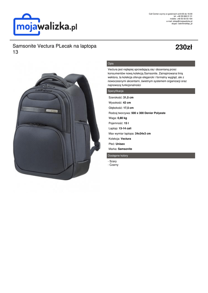 Call Center czynny w godzinach od 8:00 do 16:00 tel. +48 58 668 01 31 mobile: +48 50 50 50 164 e-mail: [email protected] skype: valentinisklep_pl 230zł Samsonite Vectura PLecak na laptopa 13 Opis Vectura jest najlepiej sprzedającą się i docenianą przez konsumentów nową kolekcją Samsonite. Zainspirowana linią wektora, ta kolekcja oferuje elegancki i formalny wygląd, ale z nowoczesnymi akcentami, świetnym systemem organizacji oraz najnowszą funkcjonalności Specyfikacja Szerokość: 31,5 cm Wysokość: 42 cm Głębokość: 17,5 cm Rodzaj tworzywa: 500 x 300 Denier Polyeste Waga: 0,80 kg Pojemność: 15 l Laptop: 13-14 cali Max wymiar laptopa: 24x34x3 cm Kolekcja: Vectura Płeć: Unisex Marka: Samsonite Dostępne kolory - Szary - Czarny Powered by TCPDF (www.tcpdf.org)