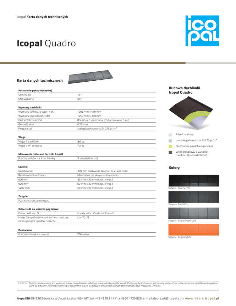 Icopal Karta danych technicznych Icopal Quadro Karta danych technicznych Budowa dachówki Icopal Quadro Pochylenie połaci dachowej Minimalne 15° Maksymalne 90° Wymiary dachówki Wymiary całkowite (szer. x dł.) 1293 mm x 419 mm Wymiary krycia (szer. x dł.) 1250 mm x 399 mm Powierzchnia krycia 0,5 m2 na 1 dachówkę (2 dachówki na 1 m2) Grubość stali 0,75 mm Rodzaj stali stal galwanizowana Zn 275 gr/m² Rdzeń stalowy Waga Waga 1 dachówki 3,6 kg powłoka galwaniczna Zn275 gr/m² Waga 1 m² pokrycia 7,2 kg obustronna powłoka organiczna Mocowanie (zalecane łączniki Icopal) Ilość łączników na 1 dachówkę 3 sztuki (6 na m ) lakier proszkowy o wysokiej trwałości Qualicoat Class 2 2 Łacenie Rozstaw łat 399 mm (podwójne łacenie: 174 i 225 mm) Rozstaw krokwi (max.): Minimalne przekroje łat (zalecane): 600 mm 38 mm x 30 mm (szer. x wys.) 900 mm 50 mm x 30 mm (szer. x wys.) 1200 mm 50 mm x 50 mm (szer. x wys.) Kolory Satyna – Czarny (71) Zużycie Patrz: Instrukcja montażu Satyna – Grafit (31) Odporność na warunki pogodowe Odporność na UV trwały kolor, Qualicoat Class 2 Hałas (bezpośrednio pod dachem podczas intensywnych opadów deszczu) Li = 70 dB Satyna – Szara Oliwka (41) Pakowanie Ilość dachówek na palecie 200 sztuk Satyna – Ceglasty (35) 03/2016 / Ta informacja podana jest w dobrej wierze na podstawie ostatniej wiedzy dostępnej dla Icopal. Podczas gdy dochowano starań, aby upewnić się , że w momencie opublikowania podane dane są aktualne , klienci proszeni są o upewnienie się, co do bieżącej aktualności danych technicznych, gdyż mogą ulec zmianie. Icopal SA 98-220 Zduńska Wola, ul. Łaska 169/197, tel: +48 43 823 4111, +48 601 725 526 e-mail: decra.pl @icopal.com www.decra.icopal.pl