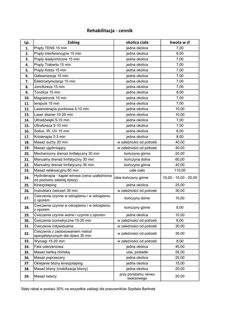 Rehabilitacja - cennik Lp. 1. 2. 3. 4. 5. 6. 7. 8. 9. 10. 11. 12. 13. 14. 15. 16. 17. 18. 19. 20. 21. 22. 23. 24. 25. 26. 27. 28. 29. 30. 31. 32. 33. 34. 35. 36. 37. 38. 39. Zabieg okolica ciała kwota w zł Prądy TENS 15 min jedna okolica 7,00 Prądy interferencyjne 15 min Prądy diadynmiczne 15 min jedna okolica jedna okolica 8,00 7,00 Prądy Traberta 15 min Prądy Kotza 15 min jedna okolica jedna okolica 7,00 7,00 Galwanizacja 15 min Elektrostymulacja 15 min jedna okolica jedna okolica 7,00 7,00 Jonoforeza 15 min Tonoliza 15 min jedna okolica jedna okolica 7,00 8,00 Magnetronik 15 min terapuls 15 min Laseroterapia punktowa 5-10 min jedna okolica jedna okolica jedna okolica 7,00 7,00 10,00 Laser skaner 10-20 min Ultradźwięki 5-10 min jedna okolica jedna okolica 10,00 7,00 Ultraforeza 5-10 min Sollux, IR, UV 15 min jedna okolica jedna okolica 7,00 6,00 Krioterapia 2-3 min Masaż suchy 20 min jedna okolica w zależności od potrzeb 8,00 40,00 Masaż ujędrniający w zależności od potrzeb 40,00 Mechaniczny drenaż limfatyczny 30 min kończyna górna 20,00 Manualny drenaż limfatyczny 30 min Manualny drenaż limfatyczny 30 min kończyna dolna kończyna górna 60,00 40,00 Masaż relaksacyjny 60 min całe ciało Hydroterapia - kąpiel wirowa (cena uzależniona obie kończyny górne od poziomu zalanej dyszy) Kinezjotaping jedna okolica Instruktarz ćwiczeń 30 min w zależności od potrzeb Ćwiczenia czynne w odciążeniu i w odciążeniu kończyny dolne z oporem Ćwiczenia czynne w odciążeniu i w odciążeniu kończyny górne z oporem Ćwiczenia czynne wolne i czynne z oporem jedna okolica Ćwiczenia izometryczne 15-20 min w zależności od potrzeb Ćwiczenia indywidualne Ćwiczenia z zastosowaniem metod specjalistycznych dla dzieci 30 min Wyciagi 15-20 min Fala uderzeniowa Masaż bańką chińską Masaż poprzeczny Oklejanie blizny kinezjotaping Masaż blizny (mobilizacja blizny) Masaż twarzy 110,00 10,00 - 15,00 - 20,00 25,00 30,00 10,00 8,00 10,00 8,00 w zależności od potrzeb 30,00 w zależności od potrzeb 35,00 w zależności od potrzeb jedna okolica uda, pośladki 8,00 45,00 55,00 jedna okolica jedna okolica 25,00 15,00 jedna okolica przy porażaniu nerwu twarzowego 20,00 Stały rabat w postaci 30% na wszystkie zabiegi dla pracowników Szpitala Barlinek 20,00