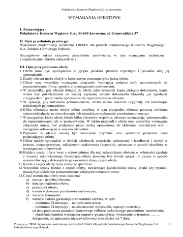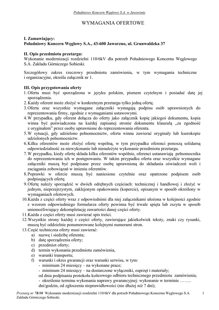 Południowy Koncern Węglowy S.A. w Jaworznie WYMAGANIA OFERTOWE I. Zamawiający: Południowy Koncern Węglowy S.A., 43-600 Jaworzno, ul. Grunwaldzka 37 II. Opis przedmiotu przetargu: Wykonanie modernizacji rozdzielni 110/6kV dla potrzeb Południowego Koncernu Węglowego S.A. Zakładu Górniczego Sobieski. Szczegółowy zakres rzeczowy przedmiotu zamówienia, w tym wymagania techniczne i organizacyjne, określa załącznik nr 1. III. Opis przygotowania oferty 1. Oferta musi być sporządzona w języku polskim, pismem czytelnym i posiadać datę jej sporządzenia. 2. KaŜdy oferent moŜe złoŜyć w konkretnym przetargu tylko jedną ofertę. 3. Oferta oraz wszystkie wymagane załączniki wymagają podpisu osób uprawnionych do reprezentowania firmy, zgodnie z wymaganiami ustawowymi. 4. W przypadku, gdy oferent dołącza do oferty jako załącznik kopię jakiegoś dokumentu, kopia winna być poświadczona na kaŜdej zapisanej stronie dokumentu klauzulą „za zgodność z oryginałem” przez osoby uprawnione do reprezentowania oferenta. 5. W sytuacji, gdy udzielono pełnomocnictw, oferta winna zawierać oryginały lub kserokopie udzielonych pełnomocnictw. 6. Kilku oferentów moŜe złoŜyć ofertę wspólną, w tym przypadku oferenci ponoszą solidarną odpowiedzialność za niewykonanie lub nienaleŜyte wykonanie przedmiotu przetargu. 7. W przypadku, kiedy ofertę składa kilku oferentów wspólnie, oferenci ustanawiają pełnomocnika do reprezentowania ich w postępowaniu. W takim przypadku oferta oraz wszystkie wymagane załączniki muszą być podpisane przez osobę uprawnioną do składania oświadczeń woli i zaciągania zobowiązań w imieniu oferentów. 8. Poprawki w ofercie muszą być naniesione czytelnie oraz opatrzone podpisem osób podpisujących ofertę. 9. Ofertę naleŜy sporządzić w dwóch odrębnych częściach: technicznej i handlowej i złoŜyć w jednym, nieprzejrzystym, zaklejonym opakowaniu (kopercie), opisanym w sposób określony w wymaganiach ofertowych. 10. KaŜda z części oferty wraz z odpowiednimi dla niej załącznikami ułoŜona w kolejności zgodnie z wzorem odpowiedniego formularza oferty powinna być trwale spięta lub zszyta w sposób uniemoŜliwiający dekompletację zawartości danej części oferty. 11. KaŜda z części oferty musi zawierać spis treści. 12. Wszystkie strony kaŜdej z części oferty, zawierające jakiekolwiek teksty, znaki czy rysunki, muszą być oddzielnie ponumerowane kolejnymi numerami stron. 13. Część techniczna oferty musi zawierać: a) nazwę i siedzibę oferenta; b) datę sporządzenia oferty; c) przedmiot oferty; d) termin wykonania przedmiotu zamówienia, e) warunki transportu; f) warunki i okres gwarancji oraz warunki serwisu, w tym: - minimum 24 miesięcy – na wykonane prace; - minimum 24 miesięcy – na dostarczone wyłączniki, osprzęt i materiały; od dnia podpisania protokołu końcowego odbioru technicznego przedmiotu zamówienia; - określenie terminu wykonania naprawy gwarancyjnej: wykonanie w terminie …….. dni/godzin, od zgłoszenia nieprawidłowości (nie dłuŜej niŜ 7 dni); Przetarg nr 78/10 Wykonanie modernizacji rozdzielni 110/6kV dla potrzeb Południowego Koncernu Węglowego S.A. Zakładu Górniczego Sobieski. 1 Południowy Koncern Węglowy S.A. w Jaworznie g) oświadczenie oferenta, Ŝe usługa jest wolna od wad prawnych; h) oświadczenie, Ŝe oferent posiada niezbędną wiedzę i doświadczenie oraz dysponuje potencjałem technicznym i osobami zdolnymi do wykonania zamówienia; i) wykaz wykonanych, a w przypadku świadczeń okresowych lub ciągłych równieŜ wykonywanych usług w okresie ostatnich trzech lat przed dniem określonym jako termin złoŜenia oferty, a jeŜeli okres prowadzenia działalności jest krótszy - w tym okresie, odpowiadających swoim rodzajem usługom przy rozdzielniach wysokiego napięcia lub robotom budowlano-montaŜowym urządzeń elektroenergetycznych WN, w tym zrealizowanych na terenie zakładów górniczych węgla kamiennego, stanowiących przedmiot zamówienia, z podaniem ich wartości, przedmiotu, dat wykonania i odbiorców; j) kserokopie referencji lub rekomendacji lub opinii świadczących, Ŝe oferent gwarantuje odpowiedni poziom wykonania przedmiotu zamówienia – w zakresie usług przy rozdzielniach wysokiego napięcia lub robotach budowlano-montaŜowych urządzeń elektroenergetycznych WN, w tym zrealizowanych na terenie zakładów górniczych węgla kamiennego; k) wykazy (wraz z załączeniem kserokopii) dokumentów stwierdzających, Ŝe osoby które będą uczestniczyć w wykonywaniu zamówienia, posiadają wymagane uprawnienia: - kserokopie dokumentów osoby/osób dozoru przewidzianych do prowadzenia i nadzorowania prac, posiadające jednocześnie: • przewidziane w Prawie Budowlanym uprawnienia budowlane do prowadzenia i kierowania robotami bez ograniczeń w specjalności instalacyjnej w zakresie sieci, instalacji i urządzeń elektrycznych i elektroenergetycznych, • stwierdzenie kwalifikacji przez organ nadzoru górniczego jako osoba dozoru wyŜszego specjalności elektrycznej – w podziemnych zakładach górniczych wydobywających węgiel kamienny, • świadectwo kwalifikacyjne uprawniające do zajmowania się nadzorem nad eksploatacją urządzeń, instalacji i sieci na stanowisku dozoru w zakresie – min. do 110 kV, - kserokopie dokumentów stwierdzających, Ŝe osoby wykonujące prace, które będą uczestniczyć w wykonywaniu zamówienia, posiadają wymagane uprawnienia – (min 3 osoby) posiadające poniŜsze kwalifikacje: • świadectwo kwalifikacyjne uprawniające do zajmowania się eksploatacją urządzeń, instalacji i sieci na stanowisku eksploatacji w zakresie - min. do 110 kV, - kserokopie dokumentów stwierdzających, Ŝe osoby wykonujące prace pomiarowe, które będą uczestniczyć w wykonywaniu zamówienia, posiadają wymagane uprawnienia – (min 2 osoby) posiadające jednocześnie : • świadectwo kwalifikacyjne upraw