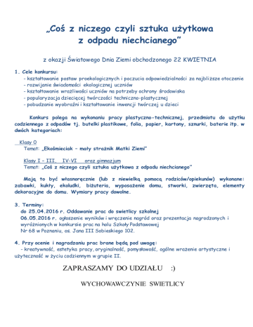 „Coś z niczego czyli sztuka użytkowa z odpadu niechcianego” z okazji Światowego Dnia Ziemi obchodzonego 22 KWIETNIA 1. Cele konkursu: - kształtowanie postaw proekologicznych i poczucia odpowiedzialności za najbliższe otoczenie - rozwijanie świadomości ekologicznej uczniów - kształtowanie wrażliwości uczniów na potrzeby ochrony środowiska - popularyzacja dziecięcej twórczości techniczno-plastycznej - pobudzanie wyobraźni i kształtowanie inwencji twórczej u dzieci Konkurs polega na wykonaniu pracy plastyczno-technicznej, przedmiotu do użytku codziennego z odpadów tj. butelki plastikowe, folia, papier, kartony, sznurki, baterie itp. w dwóch kategoriach: Klasy 0 Temat: „Ekośmieciak – mały strażnik Matki Ziemi” Klasy I – III, IV-VI oraz gimnazjum Temat: „Coś z niczego czyli sztuka użytkowa z odpadu niechcianego” Mają to być własnoręcznie (lub z niewielką pomocą rodziców/opiekunów) wykonane: zabawki, kukły, ekoludki, biżuteria, wyposażenie domu, stworki, zwierzęta, elementy dekoracyjne do domu. Wymiary pracy dowolne. 3. Terminy: do 25.04.2016 r. Oddawanie prac do swietlicy szkolnej 06.05.2016 r. ogłoszenie wyników i wręczenie nagród oraz prezentacja nagrodzonych i wyróżnionych w konkursie prac na holu Szkoły Podstawowej Nr 68 w Poznaniu, os. Jana III Sobieskiego 102. 4. Przy ocenie i nagradzaniu prac brane będą pod uwagę: - kreatywność, estetyka pracy, oryginalność, pomysłowość, ogólne wrażenie artystyczne i użyteczność w życiu codziennym w grupie II. ZAPRASZAMY DO UDZIAŁU :) WYCHOWAWCZYNIE SWIETLICY 9. Ogłoszenie wyników i wręczenie nagród: Komisja konkursowa powołana przez organizatorów dokona oceny prac i przyzna nagrody w dwóch grupach wiekowych. Laureaci konkursu (I, II, III miejsce i wyróżnienia) otrzymają nagrody oraz pamiątkowe dyplomy. O wynikach konkursu oraz uroczystym wręczeniu nagród i dyplomów, które odbędzie się w piątek 6 maja powiadomimy telefonicznie lub mailowo do 29.04.2016 r. Informacja ta również ukaże się na stronie internetowej i stronie portalu społecznościowego FB naszej szkoły. SERDECZNIE ZAPRASZAMY DO UDZIAŁU W KONKURSIE! Organizatorzy: Paulina Dominiczak Marek Niezborała