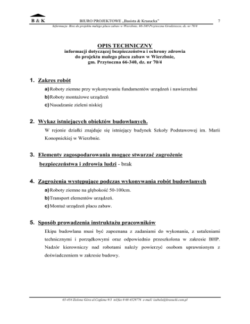 BIURO PROJEKTOWE „Basista & Krasucka” B&K 7 Informacja Bioz do projektu małego placu zabaw w Wierzbnie, 66-340 Przytoczna Grodziszcze, dz. nr 70/4 OPIS TECHNICZNY informacji dotyczącej bezpieczeństwa i ochrony zdrowia do projektu małego placu zabaw w Wierzbnie, gm. Przytoczna 66-340, dz. nr 70/4 1. Zakres robót a) Roboty ziemne przy wykonywaniu fundamentów urządzeń i nawierzchni b) Roboty montażowe urządzeń c) Nasadzanie zieleni niskiej 2. Wykaz istniejących obiektów budowlanych. W rejonie działki znajduje się istniejący budynek Szkoły Podstawowej im. Marii Konopnickiej w Wierzbnie. 3. Elementy zagospodarowania mogące stwarzać zagrożenie bezpieczeństwa i zdrowia ludzi - brak 4. Zagrożenia występujące podczas wykonywania robót budowlanych a) Roboty ziemne na głębokość 50-100cm. b) Transport elementów urządzeń. c) Montaż urządzeń placu zabaw. 5. Sposób prowadzenia instruktażu pracowników Ekipa budowlana musi być zapoznana z zadaniami do wykonania, z ustaleniami technicznymi i porządkowymi oraz odpowiednio przeszkolona w zakresie BHP. Nadzór kierowniczy nad robotami należy powierzyć osobom uprawnionym z doświadczeniem w zakresie budowy. 65-454 Zielona Góra ul.Ceglana 9/3 tel/fax 0 68 4529776 e-mail: [email protected] BIURO PROJEKTOWE „Basista & Krasucka” B&K 8 Informacja Bioz do projektu małego placu zabaw w Wierzbnie, 66-340 Przytoczna Grodziszcze, dz. nr 70/4 6. Środki techniczne i organizacyjne zapobiegające niebezpieczeństwom W razie wypadku udzielić pierwszej pomocy, zapewnić pomoc lekarską, usunąć osoby zbędne (trzecie). Na terenie budowy należy zapewnić podręczną apteczkę pierwszej pomocy wyposażoną w podstawowe leki pierwszej pomocy oraz środki opatrunkowe. Zapewnić komunikację umożliwiającą szybką ewakuację na wypadek pożaru, awarii i innych zagrożeń. 7. Uwagi końcowe Powyższe opracowanie zostało opracowane zgodnie z Rozporządzeniem Ministra Infrastruktury z dnia 23 czerwca 2006r. (Dz.U. Nr 120 poz.1126) Autor: mgr inż. Izabela Krasucka 65-454 Zielona Góra ul.Ceglana 9/3 tel/fax 0 68 4529776 e-mail: [email protected]