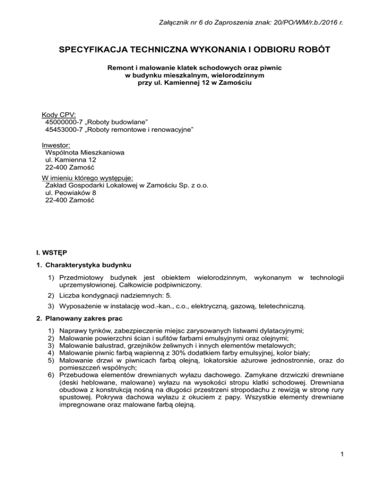Załącznik nr 6 do Zaproszenia znak: 20/PO/WM/r.b./2016 r. SPECYFIKACJA TECHNICZNA WYKONANIA I ODBIORU ROBÓT Remont i malowanie klatek schodowych oraz piwnic w budynku mieszkalnym, wielorodzinnym przy ul. Kamiennej 12 w Zamościu Kody CPV: 45000000-7 „Roboty budowlane” 45453000-7 „Roboty remontowe i renowacyjne” Inwestor: Wspólnota Mieszkaniowa ul. Kamienna 12 22-400 Zamość W imieniu którego występuje: Zakład Gospodarki Lokalowej w Zamościu Sp. z o.o. ul. Peowiaków 8 22-400 Zamość I. WSTĘP 1. Charakterystyka budynku 1) Przedmiotowy budynek jest obiektem wielorodzinnym, wykonanym w technologii uprzemysłowionej. Całkowicie podpiwniczony. 2) Liczba kondygnacji nadziemnych: 5. 3) Wyposażenie w instalację wod.-kan., c.o., elektryczną, gazową, teletechniczną. 2. Planowany zakres prac 1) 2) 3) 4) 5) Naprawy tynków, zabezpieczenie miejsc zarysowanych listwami dylatacyjnymi; Malowanie powierzchni ścian i sufitów farbami emulsyjnymi oraz olejnymi; Malowanie balustrad, grzejników żeliwnych i innych elementów metalowych; Malowanie piwnic farbą wapienną z 30% dodatkiem farby emulsyjnej, kolor biały; Malowanie drzwi w piwnicach farbą olejną, lokatorskie ażurowe jednostronnie, oraz do pomieszczeń wspólnych; 6) Przebudowa elementów drewnianych wyłazu dachowego. Zamykane drzwiczki drewniane (deski heblowane, malowane) wyłazu na wysokości stropu klatki schodowej. Drewniana obudowa z konstrukcją nośną na długości przestrzeni stropodachu z rewizją w stronę rury spustowej. Pokrywa dachowa wyłazu z okuciem z papy. Wszystkie elementy drewniane impregnowane oraz malowane farbą olejną. 1 Załącznik nr 6 do Zaproszenia znak: 20/PO/WM/r.b./2016 r. II. REALIZACJA ROBÓT 1. Prace demontażowe Zakres prac demontażowych: 1) rozebranie drewnianego włazu na dach; 2) skucie luźnego tynku na klatkach schodowych, wykucie kratek wentylacyjnych; 3) demontaż nieużywanych instalacji elektrycznych oraz teletechnicznych; Prace należy prowadzić przy zachowaniu wszelkich zasad BHP. Wymogi dotyczą także ubioru ochronnego pracowników. 2. Przygotowanie podłoża do malowania ścian farbami emulsyjnymi Przed przystąpieniem do prac malarskich z powierzchni sufitów i ścian malowanych farbami emulsyjnymi należy przetrzeć celem wyrównania powierzchni podłoża oraz zagruntować preparatem wzmacniającym. Pęknięcia i nierówności tynków wypełnić i wyrównać masą szpachlową. Niedopuszczalne jest malowanie powierzchni zatłuszczonych oraz luźnego tynku. W miejscach gdzie powstają rysy należy wkuć listwy dylatacyjne. Podłoża należy zagruntować preparatami firmowymi, przeznaczonymi do tego celu. Przed użyciem należy uzyskać zgodę Inspektora Nadzoru na wykorzystanie produktu. Ściany piwnic malować, farbą wapienną z dodatkiem 30% farby emulsyjnej, po uprzednim odtłuszczeniu miejsc zanieczyszczonych oraz wyczyszczeniu z pajęczyn oraz kurzu. 3. Malowanie tynków wewnętrznych farbą emulsyjną Do malowania powierzchni sufitów i ścian nad lamperią należy stosować farby emulsyjne do wymalowań wewnętrznych. 4. Malowanie lamperii oraz elementów metalowych farbami olejnymi Na powierzchni ścian malowanych farbą olejną należy wykonać drobne naprawy tynku i przecierki celem wyrównania podłoża. Przed zagruntowaniem istniejącą warstwę lamperii należy przetrzeć mechanicznie papierem ściernym o grubości max 300 na całej powierzchni w celu poprawy nośności farby. Nie będzie wymagane usunięcie całej warstwy farby, a jedynie zwiększenie chłonności podłoża oraz pozbycie się obszarów niezwiązanych z podłożem, przed położeniem kolejnych warstw. Podłoża należy zagruntować preparatami firmowymi ustalonymi z Inspektorem Nadzoru. Nierówności na powierzchni tynku uzupełnić gładzią gipsową. Nawierzchnię lamperii należy wykonać farbą olejną. Kolorystykę ustalić ze Wspólnotą Mieszkaniową oraz Inspektorem Nadzoru. Elementy metalowe takie jak grzejniki żeliwne, futryny także drewniane, piony instalacyjne przed malowaniem należy oczyścić na całej powierzchni kaloryfera z kurzu, pajęczyn, zanieczyszczeń olejowych, itp. Wszystkie elementy należy malować, aż do uzyskania jednolitej barwy powierzchni. Wszystkie roboty należy wykonać zgodnie z kosztorysem ofertowym, sztuką budowlaną i należytą starannością. Przed złożeniem oferty należy wykonać wizję lokalną. Wszelkie wątpliwości i korekty kosztorysu, a także wybór materiałów, kolorystyki oraz wbudowywanych elementów ustalić z Zamawiającym. Należy stosować materiały firmowe ze znakami dopuszczającymi do stosowania w budownictwie. Podczas nakładania wszystkich materiałów należy postępować zgodnie 2 Załącznik nr 6 do Zaproszenia znak: 20/PO/WM/r.b./2016 r. z zaleceniami producenta. Każdy pracownik powinien zapoznać się z treścią etykiety pod kątem stosowania materiału, którego aktualnie używa. Przed zastosowaniem danego materiału budowlanego należy uzyskać zgodę od Inspektora Nadzoru na jego użycie. III. POZOSTAŁE UZGODNIENIA 1. Kontrola jakości robót Odpowiedzialność za jakość prowadzonych robót w pełni ponosi Wykonawca. W celu zapewnienia żądanej jakości prac. Zamawiający będzie podczas trwania robót prowadził bieżącą kontrolę. Do prowadzenia kontroli upoważniony jest prowadzący Inspektor Nadzoru oraz inni wskazani przez Zamawiającego pracownicy. 2. Dokumentacja budowy Podstawowymi dokumentami budowy są: 1) Specyfikacja techniczna; 2) Protokóły odbiorów częściowych i końcowych (poszczególnych robót na klatkach schodowych); 3) Certyfikaty i dopuszczenia dotyczące jakości wbudowanych materiałów; 4) Notatki i uzgodnienia spisane na budowie przez przedstawicieli stron; 3. Odbiory robót 1) Odbiór robót zanikających polega na finalnej ocenie ilości i jakości wykonanych robót, zastosowanych materiałów, prawidłowości wykonania. Odbiorów częściowych dokonuje na wniosek Wyk
