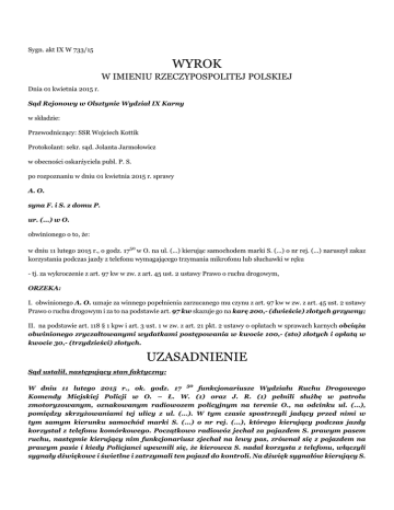 Sygn. akt IX W 733/15 WYROK W IMIENIU RZECZYPOSPOLITEJ POLSKIEJ Dnia 01 kwietnia 2015 r. Sąd Rejonowy w Olsztynie Wydział IX Karny w składzie: Przewodniczący: SSR Wojciech Kottik Protokolant: sekr. sąd. Jolanta Jarmołowicz w obecności oskarżyciela publ. P. S. po rozpoznaniu w dniu 01 kwietnia 2015 r. sprawy A. O. syna F. i S. z domu P. ur. (...) w O. obwinionego o to, że: w dniu 11 lutego 2015 r., o godz. 1750 w O. na ul. (...) kierując samochodem marki S. (...) o nr rej. (...) naruszył zakaz korzystania podczas jazdy z telefonu wymagającego trzymania mikrofonu lub słuchawki w ręku - tj. za wykroczenie z art. 97 kw w zw. z art. 45 ust. 2 ustawy Prawo o ruchu drogowym, ORZEKA: I. obwinionego A. O. uznaje za winnego popełnienia zarzucanego mu czynu z art. 97 kw w zw. z art. 45 ust. 2 ustawy Prawo o ruchu drogowym i za to na podstawie art. 97 kw skazuje go na karę 200,- (dwieście) złotych grzywny; II. na podstawie art. 118 § 1 kpw i art. 3 ust. 1 w zw. z art. 21 pkt. 2 ustawy o opłatach w sprawach karnych obciąża obwinionego zryczałtowanymi wydatkami postępowania w kwocie 100,- (sto) złotych i opłatą w kwocie 30,- (trzydzieści) złotych. UZASADNIENIE Sąd ustalił, następujący stan faktyczny: W dniu 11 lutego 2015 r., ok. godz. 17 50 funkcjonariusze Wydziału Ruchu Drogowego Komendy Miejskiej Policji w O. – Ł. W. (1) oraz J. R. (1) pełnili służbę w patrolu zmotoryzowanym, oznakowanym radiowozem policyjnym na terenie O., na odcinku ul. (...), pomiędzy skrzyżowaniami tej ulicy z ul. (...). W tym czasie spostrzegli jadący przed nimi w tym samym kierunku samochód marki S. (...) o nr rej. (...), którego kierujący podczas jazdy korzystał z telefonu komórkowego. Początkowo radiowóz jechał za pojazdem S. prawym pasem ruchu, następnie kierujący nim funkcjonariusz zjechał na lewy pas, zrównał się z pojazdem na prawym pasie i kiedy Policjanci upewnili się, że kierowca S. nadal korzysta z telefonu, włączyli sygnały dźwiękowe i świetlne i zatrzymali ten pojazd do kontroli. Na dźwięk sygnałów kierujący S. pośpiesznie odłożył aparat do konsoli środkowej pojazdu. Kierowcą zatrzymanego pojazdu okazał się obwiniony A. O.. Podczas kontroli zaprzeczył aby rozmawiał przez telefon i ostatecznie odmówił przyjęcia mandatu karnego w kwocie 200,- zł. (dowody - zeznania świadków – J. R. - k. 15v, Ł. W. - k. 16; częściowo wyjaśnienia obwinionego – k. 15; częściowo zeznania świadka T. S. – k. 15v-16; notatka urzędowa - k. 3; wydruk z bazy (...) k. 4, rachunek szczegółowy – k. 13 - 14). Obwiniony w wyjaśnieniach złożonych na rozprawie nie przyznał się do popełnienia zarzucanego mu czynu stwierdzając, że widział radiowóz jadący za nim r i choćby dlatego nie korzystałby z telefonu. Podkreślił, że ma przyciemniane szyby w samochodzie, a na zewnątrz było już ciemno. Był tak zdziwiony interwencją, że nawet nie zwrócił uwagi Policjantom, że ma w samochodzie zestaw głośnomówiący. Prosił Policjanta aby sprawdził w jego aparacie, że nie wykonywał żadnych połączeń telefonicznych, ani nie przychodziły do niego żadne wiadomości tekstowe, co udokumentował przedłożonym przez siebie rachunkiem. (wyjaśnienia – k. 15 – 15v) Sąd zważył, co następuje: Wyjaśnienia obwinionego, w zakresie dotyczącym najważniejszego aspektu niniejszej sprawy nie zasługują na wiarę. Sąd, po przeanalizowaniu całokształtu materiału dowodowego zgromadzonego w niniejszej sprawie uznał, że pozwala on, mimo zapewnień obwinionego i świadka – pasażera pojazdu obwinionego, na przyjęcie sprawstwa obwinionego. Przede wszystkim Sąd dysponował jednoznacznymi zeznaniami dwóch naocznych świadków – funkcjonariuszy Policji, którzy w sposób jasny i logiczny oraz szczegółowy opisali zachowanie obwinionego – korzystanie przez niego z telefonu komórkowego podczas jazdy, kierowania samochodem ulicą (...) w O.. Świadkowie zgodnie wykluczyli możliwość swojej pomyłki podkreślając, że jechali pewien czas najpierw bezpośrednio za pojazdem obwinionego, a następnie obok niego i mieli doskonałą widoczność i możliwość dokładnego obserwowania jego zachowania. Przyznali również z całą mocą, że wykluczają możliwość swojej pomyłki i po to by jej nie popełnić specjalnie przez pewien czas jechali obok pojazdu obwinionego mając możliwość obserwacji jego zachowania nie tylko z tyłu ale i z boku. Wprawdzie zdarzenie to miało miejsce już po zmroku ale działo się na doskonale oświetlonej przez uliczne latarnie ulicy (...). Sąd oczywiście dostrzegł rozbieżność w relacjach świadków dotyczącą ręki w której obwiniony miał trzymać aparat telefoniczny, jednak okoliczność ta jest kwestią zdecydowanie drugorzędną. Obaj świadkowie zgodnie i kategorycznie twierdzili, że obwiniony korzystał podczas jazdy z telefonu, a to w której dokładnie ręce trzymał ten aparat nie może przesądzająco wpływać na kwestię jego odpowiedzialności. ‘. Konieczne jest również podkreślenie, że świadkowie – funkcjonariusze Policji są osobami obcymi dla obwinionego i nie mieli żadnego interesu w tym, by celowo składać zeznania o treści obciążającej obwinionego. Ponadto jako funkcjonariusze Policji z pewnością mają świadomość odpowiedzialności zarówno karnej, jak i służbowej grożącej im za złożenie nieprawdziwych zeznań. Nie mieli wcześniej nigdy styczności z obwinionym i trudno ich, zatem posądzać o jakąś swoiście rozumianą chęć zemsty. Charakterystyczne jest to, że obaj zgodnie podkreślają reakcję obwinionego na włączenie sygnałów do zatrzymania, którą obaj świadkowie określili jako energiczny ruch odkładania aparatu mający maskować wcześniejsze czynności. W przekonaniu Sądu na pełen przymiot wiarygodności nie mogą zasługiwać zeznania świadka T’. S. – kolegi i pasażera pojazdu obwinionego. Przekonywał on, podo