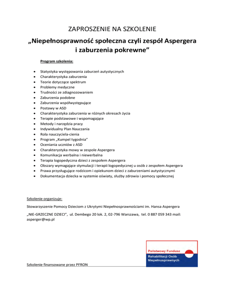 ZAPROSZENIE NA SZKOLENIE „Niepełnosprawność społeczna czyli zespół Aspergera i zaburzenia pokrewne” Program szkolenia: • • • • • • • • • • • • • • • • • • • • • Statystyka występowania zaburzeń autystycznych Charakterystyka zaburzenia Teorie dotyczące spektrum Problemy medyczne Trudności ze zdiagnozowaniem Zaburzenia podobne Zaburzenia współwystępujące Postawy w ASD Charakterystyka zaburzenia w różnych okresach życia Terapie podstawowe i wspomagające Metody i narzędzia pracy Indywidualny Plan Nauczania Rola nauczyciela-cienia Program „Kumpel tygodnia” Oceniania uczniów z ASD Charakterystyka mowy w zespole Aspergera Komunikacja werbalna i niewerbalna Terapia logopedyczna dzieci z zespołem Aspergera Obszary wymagające stymulacji i terapii logopedycznej u osób z zespołem Aspergera Prawa przysługujące rodzicom i opiekunom dzieci z zaburzeniami autystycznymi Dokumentacja dziecka w systemie oświaty, służby zdrowia i pomocy społecznej Szkolenie organizuje: Stowarzyszenie Pomocy Dzieciom z Ukrytymi Niepełnosprawnościami im. Hansa Aspergera „NIE-GRZECZNE DZIECI”, ul. Dembego 20 lok. 2, 02-796 Warszawa, tel. 0 887 059 343 mail: [email protected] Szkolenie finansowane przez PFRON