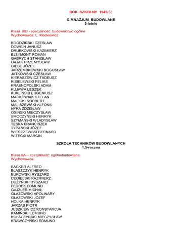 ROK SZKOLNY 1949/50 GIMNAZJUM BUDOWLANE 3-letnie Klasa IIIB - specjalność: budownictwo ogólne Wychowawca: L. Mackiewicz BOGDZIŃSKI CZESŁAW DOWSIN JANUSZ DRUBKOWSKI KAZIMIERZ EJSYMONT ROMAN GABRYCH STANISŁAW GAJAK PRZEMYSŁAW GIESE JÓZEF JARZEMBKOWSKI BOGUSŁAW JATKOWSKI CZESŁAW KIERASZEWICZ TADEUSZ KISIELEWSKI FELIKS KRASNOPOLSKI ADAM KUJAWA LESZEK KUKLIŃSKI EUGENIUSZ MAĆKOWIAK STEFAN MALICKI NORBERT MALISZEWSKI ALFONS NYKA ZDZISŁAW OSIŃSKI MIECZYSŁAW SMOCZYŃSKI HENRYK SZYMAŃSKI WŁADYSŁAW TESKA FRANCISZEK TYPAŃSKI JÓZEF WIERCZEWSKI BERNARD WITECKI MARCIN SZKOŁA TECHNIKÓW BUDOWLANYCH 1,5-roczna Klasa IIA – specjalność: ogólnobudowlana Wychowawca: BACKER ALFRED BŁASZCZYK HENRYK BUKOWSKI RYSZARD CEGIELSKI KAZIMIERZ DUŻYŃSKI RYSZARD FEDDEK EDMUND GAJZLER MICHAŁ GŁAZOWSKI APOLINARY GŁAZOWSKI JÓZEF HOLKA HENRYK JARZĄB PIOTR JUSZKIEWICZ KONSTANCJA KAMIŃSKI EDMUND KOŁACZYŃSKI MIECZYSŁAW KRAWCZYŃSKI EDMUND KRUSZCZYŃSKI WIESŁAW KRUSZYŃSKI MIECZYSŁAW KRYSKA SYLWESTER LEWANDOWSKI JERZY LINDA ZDZISŁAW LUBIEWSKI BOGDAN MARKOWSKA IRENA MYSZKOROWSKI STANISŁAW NITKA TADEUSZ NOWAKOWSKI ZBIGNIEW PIEGŁOWSKI EDWARD PIOTROWSKI CZESŁAW PIOTROWSKI LEON SKWIERAWSKI STANISŁAW SMOCZYŃSKI JÓZEF TREPCZYŃSKI HENRYK WRÓBLEWSKI ALEKSANDER ŻUKOWSKA HALINA Klasa IIB – specjalność: ogólnobudowlana Wychowawca: BOGDANOWICZ JERZY DELMACZYŃSKI RAFAŁ DRZEWIECKI JERZY GWIAZDOWSKI BENEDYKT JAĆMIERSKI MIECZYSŁAW KANIA HENRYK KITKOWSKI JANUSZ KLECZKOWSKI STANISŁAW KOGUCIUK ADAM KORTAS ZBYSZKO KOSTUCH ZDZISŁAW KUNC HENRYK LESZCZ JAN LEŚNIEWSKI HENRYK MISZKER JÓZEF OSTROWSKI MIECZYSŁAW PESTKA STEFAN PIĄTEK WACŁAW ROSOWSKI HENRYK SPECHT EDMUND SZCZERBACKI KAZIMIERZ SZYMKOWSKI ZYGMUNT ŚWIETLIK FRANCISZEK ŚWIRKO KAZIMIERZ TOMCZAK EDWIN TOPOLIŃSKI ALFONS WACHOWICZ BERNARD ZAGÓRSKI STEFAN