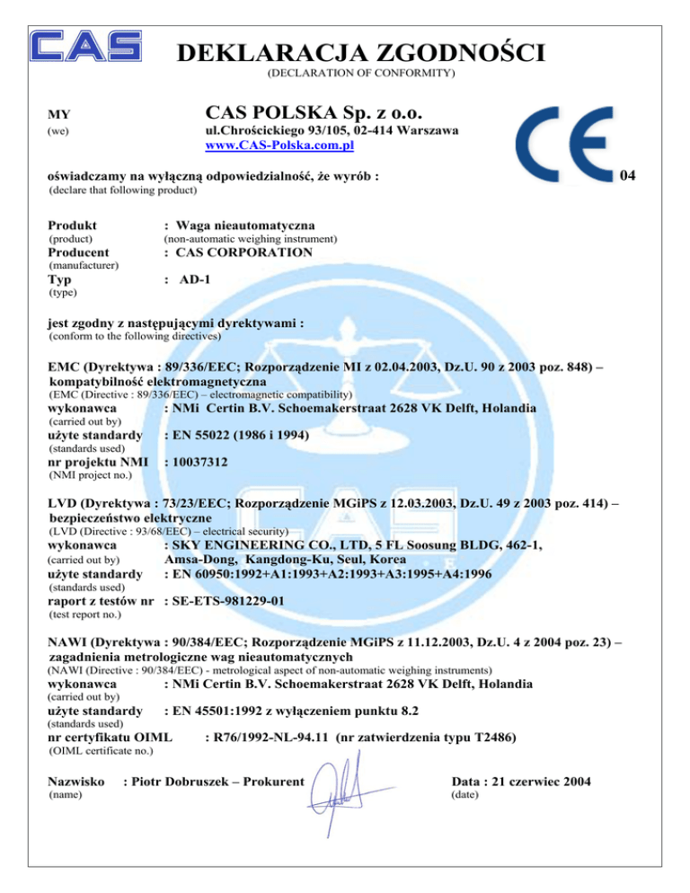 DEKLARACJA ZGODNOŚCI (DECLARATION OF CONFORMITY) CAS POLSKA Sp. z o.o. MY ul.Chrościckiego 93/105, 02-414 Warszawa www.CAS-Polska.com.pl (we) 04 oświadczamy na wyłączną odpowiedzialność, że wyrób : (declare that following product) Produkt : Waga nieautomatyczna (product) (non-automatic weighing instrument) Producent : CAS CORPORATION (manufacturer) Typ : AD-1 (type) jest zgodny z następującymi dyrektywami : (conform to the following directives) EMC (Dyrektywa : 89/336/EEC; Rozporządzenie MI z 02.04.2003, Dz.U. 90 z 2003 poz. 848) – kompatybilność elektromagnetyczna (EMC (Directive : 89/336/EEC) – electromagnetic compatibility) wykonawca : NMi Certin B.V. Schoemakerstraat 2628 VK Delft, Holandia (carried out by) użyte standardy : EN 55022 (1986 i 1994) (standards used) nr projektu NMI : 10037312 (NMI project no.) LVD (Dyrektywa : 73/23/EEC; Rozporządzenie MGiPS z 12.03.2003, Dz.U. 49 z 2003 poz. 414) – bezpieczeństwo elektryczne (LVD (Directive : 93/68/EEC) – electrical security) wykonawca (carried out by) użyte standardy : SKY ENGINEERING CO., LTD, 5 FL Soosung BLDG, 462-1, Amsa-Dong, Kangdong-Ku, Seul, Korea : EN 60950:1992+A1:1993+A2:1993+A3:1995+A4:1996 (standards used) raport z testów nr : SE-ETS-981229-01 (test report no.) NAWI (Dyrektywa : 90/384/EEC; Rozporządzenie MGiPS z 11.12.2003, Dz.U. 4 z 2004 poz. 23) – zagadnienia metrologiczne wag nieautomatycznych (NAWI (Directive : 90/384/EEC) - metrological aspect of non-automatic weighing instruments) wykonawca : NMi Certin B.V. Schoemakerstraat 2628 VK Delft, Holandia (carried out by) użyte standardy : EN 45501:1992 z wyłączeniem punktu 8.2 (standards used) nr certyfikatu OIML : R76/1992-NL-94.11 (nr zatwierdzenia typu T2486) (OIML certificate no.) Nazwisko (name) : Piotr Dobruszek – Prokurent Data : 21 czerwiec 2004 (date)