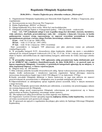 Regulamin Olimpiady Kajakarskiej 20.06.2010 r. - Stanica Żeglarska przy zbiorniku wodnym „Mściwojów” 1. Organizatorem Olimpiady kajakarskiej jest Harcerski Klub Żeglarski „Widmo z Targoszyna, przy współudziale: a) Stowarzyszenia na rzecz Rozwoju Wsi Targoszyn b) Klubu Żeglarskiego „REDA” ze Złotoryi 2. Załoga kajakarska liczy dwie osoby. Może być ona koedukacyjna. 3. Olimpiada przebiegać będzie w 4 kategoriach (jednej – VIP oraz trzech – wiekowych): I kat. – tzw. VIP (członkami załogi w tym wypadku mogą być dowolnie: starosta, burmistrz, wójt, sekretarz, skarbnik, przewodniczący rady, itd. – związany z daną jst). Liczymy, że każda gmina/powiat wystawi swoją reprezentację, co zapewni wszystkim uczestnikom i licznie zgromadzonym gościom z terenu całego Powiatu Jaworskiego, ciekawe widowisko. II kat. - wiek 10-12 lat (ur. 2000-1998) III kat. – wiek 13-15 lat (ur. 1997-1995) IV kat. – wiek 16 lat i więcej (ur. 1994 i wcześniej) Start uczestników w kategorii VIP planowany jest jako pierwszy (zaraz po pokazach windsurfingowych). 4. W przypadku kategorii II-IV, dwuosobowa ekipa kajakarska składać się może z zawodników należących do różnych kategorii wiekowych (10-12 lat, 13-15 lat, 16 lat i więcej), przy założeniu że ekipa ta będzie zakwalifikowana do odpowiedniej kategorii, adekwatnie do wieku starszego członka załogi. 5. W przypadku kategorii I (tzw. VIP) zgłoszenia załóg przyjmowane będą telefonicznie pod nr tel. 69486747 lub e-mailowo ([email protected]), do dnia 16.06.2010 r., co pozwoli nam na lepszą organizację Olimpiady. Uczestnicy w pozostałych kategoriach zgłaszają się na miejscu, w dniu organizacji imprezy, w biurze rejestracyjnym. 6. Długość trasy: ok. 180 metrów. 7. Mile widziane jednolite koszulki dwuosobowych załóg. Sprzęt wykorzystywany podczas olimpiady (kajaki, środki asekuracyjne i ratunkowe) zapewnia organizator. Sprzęt pływający stanowią nowoczesne dwuosobowe kajaki typu LAGO 530 (długość 5,3 m; ładowność: 270 kg) 8. Każdy zawodnik Olimpiady deklaruje w biurze startowym, że jego stan zdrowia nie stanowi przeciwwskazań do uczestniczenia w olimpiadzie oraz że posiada umiejętność pływania. 9. Odpowiedzialność za udostępniony sprzęt żeglarski ponosi uczestnik, który w danym momencie z niego korzysta. 10. Podczas Olimpiady spożywanie alkoholu jest zabronione, a uczestnicy nie przestrzegający zakazu nie zostaną dopuszczeni do Olimpiady. 11. Każda załoga przed rozpoczęciem Olimpiady zobowiązana jest zarejestrować się w biurze sędziowskim na Stanicy Żeglarskiej, otrzymując numer startowy. 12. Dla najlepszych załóg przewidziane są cenne nagrody oraz dyplomy. 13. Organizator wyróżni również specjalną nagrodą najlepszą żeńską osadę kajakarską, niezależnie od wieku uczestniczek tych sportowych zmagań. 14. W sprawach nie ujętych w regulaminie decydujący głos należy do Sędziego Głównego Olimpiady Kajakarskiej.