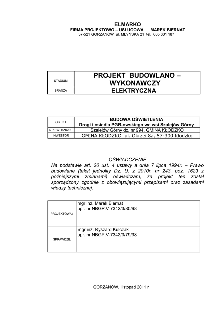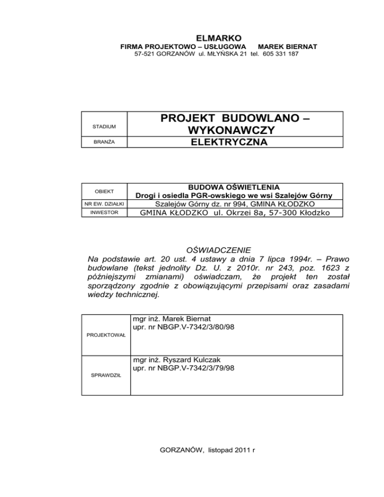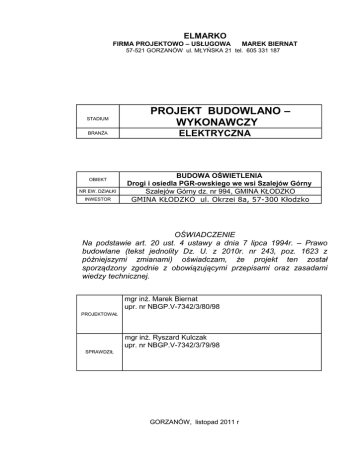 ELMARKO FIRMA PROJEKTOWO – USŁUGOWA MAREK BIERNAT 57-521 GORZANÓW ul. MŁYŃSKA 21 tel. 605 331 187 STADIUM BRANŻA OBIEKT NR EW. DZIAŁKI INWESTOR PROJEKT BUDOWLANO – WYKONAWCZY ELEKTRYCZNA BUDOWA OŚWIETLENIA Drogi i osiedla PGR-owskiego we wsi Szalejów Górny Szalejów Górny dz. nr 994, GMINA KŁODZKO GMINA KŁODZKO ul. Okrzei 8a, 57-300 Kłodzko OŚWIADCZENIE Na podstawie art. 20 ust. 4 ustawy a dnia 7 lipca 1994r. – Prawo budowlane (tekst jednolity Dz. U. z 2010r. nr 243, poz. 1623 z późniejszymi zmianami) oświadczam, że projekt ten został sporządzony zgodnie z obowiązującymi przepisami oraz zasadami wiedzy technicznej. mgr inż. Marek Biernat upr. nr NBGP.V-7342/3/80/98 PROJEKTOWAŁ mgr inż. Ryszard Kulczak upr. nr NBGP.V-7342/3/79/98 SPRAWDZIŁ GORZANÓW, listopad 2011 r ZAWARTOŚĆ PROJEKTU I 1 2 3 4 5 6 7 8 9 10 II III 1 2 3 4 5 6 7 8 9 10 11 12 13 14 15 OPIS TECHNICZNY Przedmiot i zakres opracowania Założenia projektowe Stan istniejący terenu oświetlenia Charakterystyka terenu oświetlenia Zastosowany asortyment Rozwiązania techniczne Uwarunkowania dodatkowe przy prowadzeniu prac Ochrona przepięciowa Ochrona przeciwporażeniowa zagadnienia BHP Informacja BiOZ OBLICZENIA TECHNICZNE ZAŁĄCZNIKI: Techniczne warunki przyłączenia do sieci elektroenergetycznej nr RD4-4/RDE4-4/JJ/218/11 z dn. 12.04.2011r. wydane przez ZE ENERGIAPRO S.A. ODDZIAŁ WAŁBRZYCH Nr sprawy : GKiI/6724/Z/698/2011 - Wypis z miejscowego planu zagospodarowania przestrzennego dla terenów: M, ZD – Szalejów Górny dla działek: 990, 801/3, 994, 995, 998, 1000/1, 1000/2 Mapa do celów projektowych 1:1000 Mapa ewidencji gruntów skala 1:2000 Wypis uproszczony z rejestru gruntów Uzgodnienie Tauron Dystrybucja S.A. Rejon Kłodzko pod wzlędem zgodności z TWP nr RD4-4/RDE4-4/JJ/218/11 Uzgodnienie nr 98/11 z dnia 21.11.2011 r. EnergiaPro S.A. Rejonu Dystrybucji Energii w Kłodzku ul. Objazdowa 8 Uzgodnienie nr TKT-U-160/2011 z dnia 21.11.2011r. Dolnośląskiej Spółki Gazownictwa sp. z o.o. Rejon Dystrybucji Gazu Kłodzko ul. Fabryczna 1, 57-300 Kłodzko Uzgodnienie nr TOTWSEU-WA.2110-1600/11/WT z dnia 24.112011 r. Telekomunikacji Polskiej Techniczna Obsługa Klienta Operacyjne Utrzymanie Sieci i Usług we Wrocławiu, ul. Długa 60, 58-309 Wałbrzych Uzgodnienie nr 1444/11 z dnia 25.11.2011r. Zakład Gospodarki Mieszkaniowej i Komunalnej Gminy Kłodzko, ul. Osiedlowa 7, 57-360 Ołdrzychowice Kł. Uzgodnienie RGKiI. 7230.86.2011 z dnia 22.11.2011 r. Wójta Gminy Kłodzko 57-300 Kłodzko ul. Okrzei 8a Uzgodnienie Spółdzielni mieszkaniowej „Osiedle Szalejów Górny” w Szalejowie Górnym 150 z dnia 22.11.2011 r. Kserokopia zaświadczenia o przynależności do Dolnośląskiej Izby Inzynierów Budownictwa oraz decyzji Wojewody Wałbrzyskiego o uprawnieniach budowlanych nr NBGP.V-7342/3/80/98 do projektowania – projektanta mgr inż. Marka Biernata Kserokopia zaświadczenia o przynależności do Dolnośląskiej Izby Inzynierów Budownictwa oraz decyzji Wojewody Wałbrzyskiego o uprawnieniach budowlanych nr NBGP.V-7342/3/79/98 do projektowania – projektanta mgr inż. Ryszarda Kulczaka Uzgodnienie dokumentacji projektowej przez Zespół Uzgadniania Dokumentacji Projektowej Starostwa Powiatowego w Kłodzku, Opinia nr …...................... z dnia …............2011r. IV RYSUNKI L.P. RYS. NR 1 E -1 1:500 2 E-2 TYTUŁ Plan zagospodarowania terenu – OŚWIETLENIE DROGI I OSIEDLA SCHEMAT INSTALACJI OŚWIETLENIOWEJ I OPIS TECHNICZNY 1. PRZEDMIOT I ZAKRES OPRACOWANIA. Przedmiotem opracowania jest projekt „BUDOWA OŚWIETLENIA Drogi i osiedla PGR-owskiego we wsi Szalejów Górny” Projekt obejmuje 12 punktowe oświetlenie na odcinku dł. ok.430 m, w tym: - montaż słupów z oprawami, - montaż linii oświetleniowej – linii kablowej podziemnej, - wykonanie przyłącza wraz z szafką SO dla projektowanej sieci oświetlenia, - obliczenia. 2. ZAŁOŻENIA PROJEKTOWE. P. W. opracowano na podstawie następujących założeń: - umowa z Urzędem Gminy Kłodzko. - technicznych warunków przyłączenia do sieci elektroenergetycznej nr RD4-4/RDE4-4/JJ/218/11 z dn. 12.04.2011r. wydane przez ZE ENERGIAPRO S.A. ODDZIAŁ WAŁBRZYCH, - uzgodnień branżowych i z właścicielami działek, - obowiązujących przepisów i norm PBUE i PNE, 3. STAN ISTNIEJĄCY terenu oświetlenia parkowego Obecnie teren działki nr 994, stanowiący uliczkę prowadzącą na osiedle PGR i do garaży, jest wyposażony w zużytą sieć oświetleniową, co stanowi niebezpieczeństwo dla ruchu pieszego po zapadnięciu zmierzchu. 4. CHARAKTERYSTYKA terenu oświetlenia parkowego Dane ogólne: Istniejąca uliczka posiada nawierzchnię utwardzoną asfaltem. 5. ZASTOSOWANY ASORTYMENT Projektuje się budowę linii oświetleniowej kablowej podziemnej. Projektowana linia oświetleniowa wykonana będzie kablem typu YAKXS 4x25mm2. Przykładowe elementy latarni parkowych: - oprawy - np. lampa oświetleniowa kompletna z lampą sodową 70W typ IVA-1, 70W, MT wysięgniki rurowe, 1-ramowe, o wysięgu 1,5 m do przodu - W1F0A15/5 słupy - np. słupy stalowe okrągłe H=6m, typ CS60-60/4 bez wysięgnika fundament betonowy FBw 100W + śruby - zabezpieczenie oprawy : wkładką 2A w tabliczkach TB1 i TB2 - głębokość zakopania fundamentu – 1000 mm 6. ROZWIĄZANIA TECHNICZNE Zasilanie oświetlenia: Zgodnie z warunkami technicznymi projektowane oświetlenie będzie zasilane poprzez szafkę SO, z rozdzielnicy niskiego napięcia stacji transformatorowej R-912-31 linią zasilającą YAKXS 4x35 mm2 w układzie sieci TN-C. Z szafki SO wyprowadzić jeden obwód oświetleniowy w kierunku lampy L1. W szafce SO na kable wchodzące i wychodzące założyć oznaczniki kablowe o treści uzgodnionej z ZE. Linię oświetleniową wykonać kablem ziemnym YAKXS 4x25 mm2 do projektowanych lamp oświetleniowych. Kabel ułożyć w rowie kablowym na głębokości 0,7 m, linią falistą, na warstwie piasku o grubości 10 cm, pokryć warstwą piasku grubości 10 cm i 