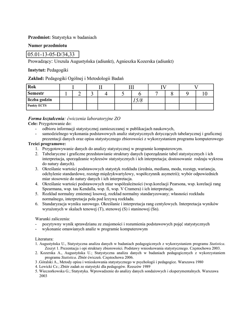 Przedmiot: Statystyka w badaniach Numer przedmiotu 05.01-13-05-D/34,33 Prowadzący: Urszula Augustyńska (adiunkt), Agnieszka Kozerska (adiunkt) Instytut: Pedagogiki Zakład: Pedagogiki Ogólnej i Metodologii Badań Rok Semestr I 1 II 2 3 III 4 liczba godzin 5 6 15/8 IV 7 V 8 9 10 Punkty ECTS Forma kształcenia: ćwiczenia laboratoryjne ZO Cele: Przygotowanie do: - odbioru informacji statystycznej zamieszczanej w publikacjach naukowych, - samodzielnego wykonania podstawowych analiz statystycznych dotyczących tabelarycznej i graficznej prezentacji danych oraz opisu statystycznego zbiorowości z wykorzystaniem programu komputerowego Treści programowe: 1. Przygotowywanie danych do analizy statystycznej w programie komputerowym. 2. Tabelaryczne i graficzne przedstawianie struktury danych (sporządzanie tabel statystycznych i ich interpretacja, sporządzanie wykresów statystycznych i ich interpretacja; dostosowanie rodzaju wykresu do natury danych). 3. Określanie wartości podstawowych statystyk rozkładu (średnia, mediana, moda, rozstęp, wariancja, odchylenie standardowe, rozstęp międzykwartylowy, współczynnik asymetrii); wybór odpowiednich miar stosownie do natury danych i ich interpretacja. 4. Określanie wartości podstawowych miar współzależności (wsp.korelacji Pearsona, wsp. korelacji rang Spearmana, wsp. tau Kendalla, wsp. fi, wsp. V Cramera) i ich interpretacja. 5. Rozkład normalny zmiennej losowej, rozkład normalny standaryzowany; własności rozkładu normalnego, interpretacja pola pod krzywą rozkładu. 6. Standaryzacja wyniku surowego. Określanie i interpretacja rang centylowych. Interpretacja wyników wyrażonych w skalach tenowej (T), stenowej (S) i staninowej (Sn). Warunki zaliczenia: - pozytywny wynik sprawdzianu ze znajomości i rozumienia podstawowych pojęć statystycznych - wykonanie omawianych analiz w programie komputerowym Literatura: 1. Augustyńska U., Statystyczna analiza danych w badaniach pedagogicznych z wykorzystaniem programu Statistica. Zeszyt 1. Prezentacja i opi struktury zbiorowości. Podstawy wnioskowania statystycznego. Częstochowa 2003. 2. Kozerska A., Augustyńska U.; Statystyczna analiza danych w badaniach pedagogicznych z wykorzystaniem programu Statistica. Zbiór ćwiczeń. Częstochowa 2006. 3 .Góralski A., Metody opisu i wnioskowania statystycznego w psychologii i pedagogice. Warszawa 1980 4. Lewicki Cz.; Zbiór zadań ze statystyki dla pedagogów. Rzeszów 1989 5. Wieczorkowska G.; Statystyka. Wprowadzenie do analizy danych sondażowych i eksperymentalnych. Warszawa 2003