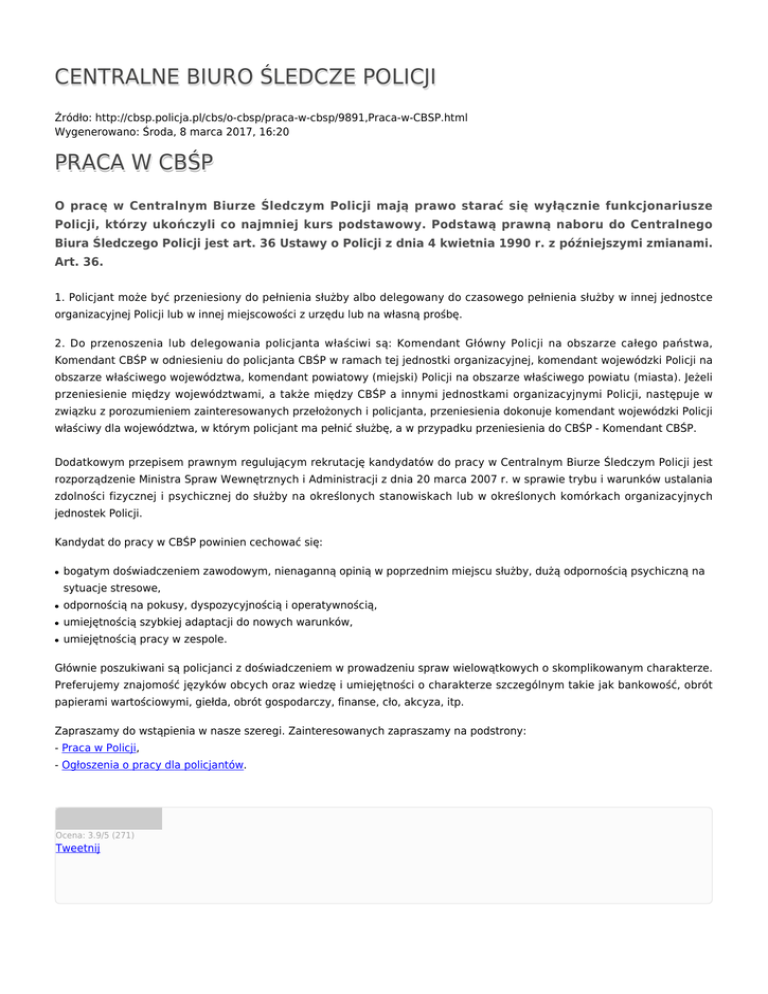 CENTRALNE BIURO ŚLEDCZE POLICJI Źródło: http://cbsp.policja.pl/cbs/o-cbsp/praca-w-cbsp/9891,Praca-w-CBSP.html Wygenerowano: Środa, 8 marca 2017, 16:20 PRACA W CBŚP O pracę w Centralnym Biurze Śledczym Policji mają prawo starać się wyłącznie funkcjonariusze Policji, którzy ukończyli co najmniej kurs podstawowy. Podstawą prawną naboru do Centralnego Biura Śledczego Policji jest art. 36 Ustawy o Policji z dnia 4 kwietnia 1990 r. z późniejszymi zmianami. Art. 36. 1. Policjant może być przeniesiony do pełnienia służby albo delegowany do czasowego pełnienia służby w innej jednostce organizacyjnej Policji lub w innej miejscowości z urzędu lub na własną prośbę. 2. Do przenoszenia lub delegowania policjanta właściwi są: Komendant Główny Policji na obszarze całego państwa, Komendant CBŚP w odniesieniu do policjanta CBŚP w ramach tej jednostki organizacyjnej, komendant wojewódzki Policji na obszarze właściwego województwa, komendant powiatowy (miejski) Policji na obszarze właściwego powiatu (miasta). Jeżeli przeniesienie między województwami, a także między CBŚP a innymi jednostkami organizacyjnymi Policji, następuje w związku z porozumieniem zainteresowanych przełożonych i policjanta, przeniesienia dokonuje komendant wojewódzki Policji właściwy dla województwa, w którym policjant ma pełnić służbę, a w przypadku przeniesienia do CBŚP - Komendant CBŚP. Dodatkowym przepisem prawnym regulującym rekrutację kandydatów do pracy w Centralnym Biurze Śledczym Policji jest rozporządzenie Ministra Spraw Wewnętrznych i Administracji z dnia 20 marca 2007 r. w sprawie trybu i warunków ustalania zdolności fizycznej i psychicznej do służby na określonych stanowiskach lub w określonych komórkach organizacyjnych jednostek Policji. Kandydat do pracy w CBŚP powinien cechować się: ● bogatym doświadczeniem zawodowym, nienaganną opinią w poprzednim miejscu służby, dużą odpornością psychiczną na sytuacje stresowe, ● odpornością na pokusy, dyspozycyjnością i operatywnością, ● umiejętnością szybkiej adaptacji do nowych warunków, ● umiejętnością pracy w zespole. Głównie poszukiwani są policjanci z doświadczeniem w prowadzeniu spraw wielowątkowych o skomplikowanym charakterze. Preferujemy znajomość języków obcych oraz wiedzę i umiejętności o charakterze szczególnym takie jak bankowość, obrót papierami wartościowymi, giełda, obrót gospodarczy, finanse, cło, akcyza, itp. Zapraszamy do wstąpienia w nasze szeregi. Zainteresowanych zapraszamy na podstrony: - Praca w Policji, - Ogłoszenia o pracy dla policjantów. Ocena: 3.9/5 (271) Tweetnij