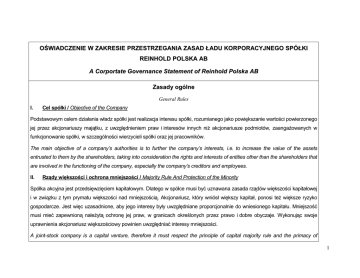 O WIADCZENIE W ZAKRESIE PRZESTRZEGANIA ZASAD ADU KORPORACYJNEGO SPÓ KI REINHOLD POLSKA AB A Corportate Governance Statement of Reinhold Polska AB Za s a d y o gó l ne General Rules I. Objective of the Company The main objective of a company’s authorities is to further the company’s interests, i.e. to increase the value of the assets entrusted to them by the shareholders, taking into consideration the rights and interests of entities other than the shareholders that are involved in the functioning of the company, especially the company’s creditors and employees. II. / Majority Rule And Protection of the Minority dobre obyczaje. A joint-stock company is a capital venture, therefore it must respect the principle of capital majority rule and the primacy of 1 majority over minority. A shareholder who contributes more capital also bears a greater economic risk. It is, therefore, justified that his interests be considered in proportion to the capital he contributes. The minority must have a guarantee that their rights will be properly protected within the limits set by the law and commercial integrity. When exercising his rights, a majority shareholder should take into account the interests of the minority. III. / Honest Intentions And No-Abuse of Rights The exercising of the rights and reliance on legal institutions should be based on honest intentions (good faith) and cannot go beyond the purpose and economic reasons for which these institutions are established. No actions should be taken which, by exceeding the limits set, constitute an abuse of the law. The minority should be protected against any abuse of ownership rights by the minority and the interests of the minority should be protected against any abuse by the minority of its rights, thus ensuring the best possible protection of the equitable interests of the shareholders and other market participants. IV. / Court Control The company’s authorities and persons chairing the general meeting cannot decide on issues which should be resolved be a court judgment. This does not apply to activities which the company’s authorities and persons chairing general meetings are 2 authorized or obliged to undertake by force of law. V. / Independent Opinions Ordered by the Company When choosing an entity to provide export services, particularly an auditor, financial And tax advisors or legal advisors, the company should examine whether there are any circumstances that would limit the entity’s independence when performing the tasks entrusted. Lp. ZASADA Rule TAK/NIE KOMENTARZ Comment Yes/No Best Practices of General Meetings 1 S wojewódzkim. akcjonariuszy uczestnictwo w zgromadzeniu. Tak zgromadzenia z A general meeting should take place in a location and at the time that allows the participation of as many shareholders as possible. 2 3 Tak zgromadzenia i akcjonariuszy umieszczen przez akcjonariusza lub ez uzasadnienia, to, walnego zgromadzenia, uzasadnienie. nimi i dokonanie ich oceny. A request made by parties entitled to do so for a general meeting to be convened and for certain issues to put on its agenda should be justified. Draft resolutions proposed for adoption by the general meeting and other key documents should be presented to the shareholders together with justification and a supervisory board opinion before the general meeting to allow them time to review and evaluate the same. dni przed 3 przeszkody rozstrzygn jego obrady. – wtedy w Tak inny termin. A general meeting convened on the shareholders` request should be held on the date given in the requested and, if this date cannot be kept, on the nearest date that would allow the general meeting to settle the issues on its agenda. 4 obrad na wniosek uprawnionych podmiotów umieszczono wniosek, inny Tak iania wszystkich zainteresowanych. 4 najmniejsze ujemne pierwotnie planowanym terminem. Zmiana terminu obrad nie A general meeting whose agenda includes certain issues at the request of authorized entities or which has been convened on such a request can only be cancelled with the consent of the requesting parties. In all other instances, a general meeting can be cancelled of its holding is hindered (force majeure) or is obviously groundless. A meeting is called off in the same way as it is convened, limiting negative consequences for the company and its shareholders as far as possible and no later than three weeks before the original meeting date. A change in the date of the general meeting is made in the same way as a cancellation, even if the proposed agenda does not change. 5 Do uczestnictwa Uczestnictwo przedstawiciela akcjonariusza w walnym zgromadzeniu wymaga udokumentowania prawa do entowania akcjonariusza na walnym zgromadzeniu, jest zgodny z prawem i nie wymaga prima facie Tak w walnym zgromadzeniu i wymagane jest jedynie iwego rejestru, lub w przypadku osób fizycznych zgodnie z przepisami kodeksu cywilnego. dokumentów. walnego zgromadzenia. Before a shareholder’s representative can participate in a general meeting, his right to act on the shareholder’s behalf should be duly documented. It should be presumed that a written document confirming the right to represent a 5 shareholder at a general meeting conforms with the law and does not require any additional confirmations or acknowledgement unless the company’s management board or the chairman of the general meeting has doubts about its authenticity or validity prima facie (when drawing up the list of attendance). 6 Regulamin Zgromadzenia Regulamin ten zawiera m.in. Walnego postanowienia , w tym wyboru rady nadzorczej, grupami. Tak wszyscy akcjonariusze zarejestrowani do uczestnictwa w nim. internetowej Spó ki. The general meeting should hale regular by-laws setting out in detail the principles on which meetings are conducted and resolutions adopted. The by-laws should, in particular, contain provisions on elections, including elections to the supervisory board by voting in separate groups. The by-laws should