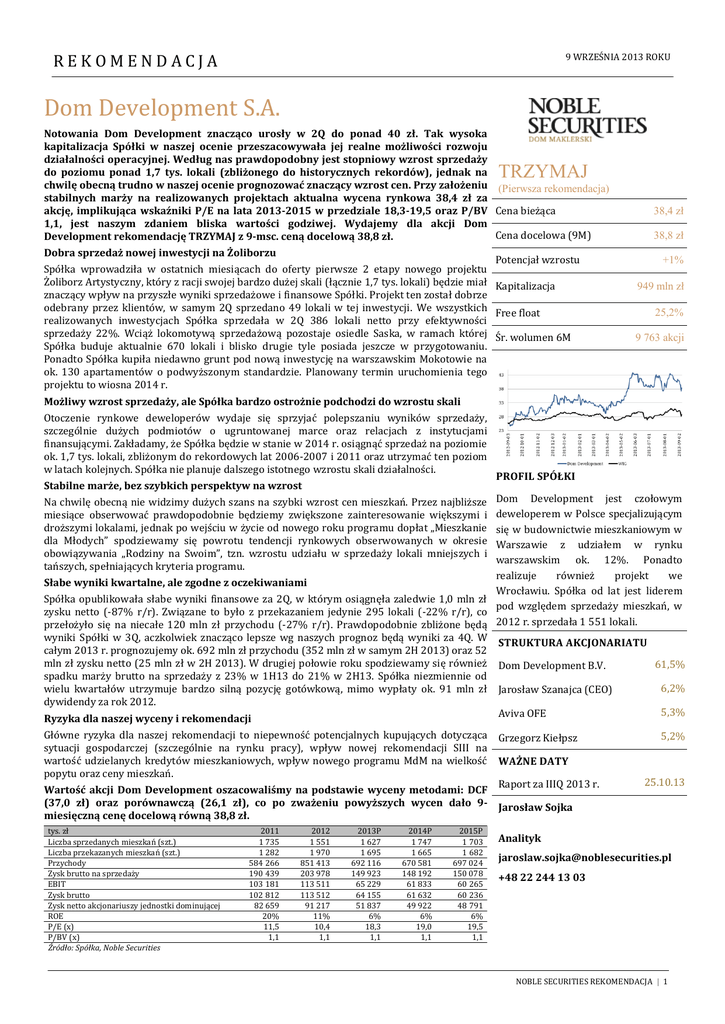 REKOMENDACJA 9 WRZEŚNIA 2013 ROKU Dom Development S.A. Notowania Dom Development znacząco urosły w 2Q do ponad 40 zł. Tak wysoka kapitalizacja Spółki w naszej ocenie przeszacowywała jej realne możliwości rozwoju działalności operacyjnej. Według nas prawdopodobny jest stopniowy wzrost sprzedaży do poziomu ponad 1,7 tys. lokali (zbliżonego do historycznych rekordów), jednak na chwilę obecną trudno w naszej ocenie prognozować znaczący wzrost cen. Przy założeniu (Pierwsza rekomendacja) stabilnych marży na realizowanych projektach aktualna wycena rynkowa 38,4 zł za akcję, implikująca wskaźniki P/E na lata 2013-2015 w przedziale 18,3-19,5 oraz P/BV Cena bieżąca 1,1, jest naszym zdaniem bliska wartości godziwej. Wydajemy dla akcji Dom Cena docelowa (9M) Development rekomendację TRZYMAJ z 9-msc. ceną docelową 38,8 zł. TRZYMAJ Dobra sprzedaż nowej inwestycji na Żoliborzu Potencjał wzrostu Spółka wprowadziła w ostatnich miesiącach do oferty pierwsze 2 etapy nowego projektu Żoliborz Artystyczny, który z racji swojej bardzo dużej skali (łącznie 1,7 tys. lokali) będzie miał Kapitalizacja znaczący wpływ na przyszłe wyniki sprzedażowe i finansowe Spółki. Projekt ten został dobrze odebrany przez klientów, w samym 2Q sprzedano 49 lokali w tej inwestycji. We wszystkich Free float realizowanych inwestycjach Spółka sprzedała w 2Q 386 lokali netto przy efektywności sprzedaży 22%. Wciąż lokomotywą sprzedażową pozostaje osiedle Saska, w ramach której Śr. wolumen 6M Spółka buduje aktualnie 670 lokali i blisko drugie tyle posiada jeszcze w przygotowaniu. Ponadto Spółka kupiła niedawno grunt pod nową inwestycję na warszawskim Mokotowie na ok. 130 apartamentów o podwyższonym standardzie. Planowany termin uruchomienia tego projektu to wiosna 2014 r. Możliwy wzrost sprzedaży, ale Spółka bardzo ostrożnie podchodzi do wzrostu skali Otoczenie rynkowe deweloperów wydaje się sprzyjać polepszaniu wyników sprzedaży, szczególnie dużych podmiotów o ugruntowanej marce oraz relacjach z instytucjami finansującymi. Zakładamy, że Spółka będzie w stanie w 2014 r. osiągnąć sprzedaż na poziomie ok. 1,7 tys. lokali, zbliżonym do rekordowych lat 2006-2007 i 2011 oraz utrzymać ten poziom w latach kolejnych. Spółka nie planuje dalszego istotnego wzrostu skali działalności. Stabilne marże, bez szybkich perspektyw na wzrost 38,4 zł 38,8 zł +1% 949 mln zł 25,2% 9 763 akcji PROFIL SPÓŁKI Dom Development jest czołowym deweloperem w Polsce specjalizującym się w budownictwie mieszkaniowym w Warszawie z udziałem w rynku warszawskim ok. 12%. Ponadto realizuje również projekt we Słabe wyniki kwartalne, ale zgodne z oczekiwaniami Wrocławiu. Spółka od lat jest liderem Spółka opublikowała słabe wyniki finansowe za 2Q, w którym osiągnęła zaledwie 1,0 mln zł pod względem sprzedaży mieszkań, w zysku netto (-87% r/r). Związane to było z przekazaniem jedynie 295 lokali (-22% r/r), co przełożyło się na niecałe 120 mln zł przychodu (-27% r/r). Prawdopodobnie zbliżone będą 2012 r. sprzedała 1 551 lokali. wyniki Spółki w 3Q, aczkolwiek znacząco lepsze wg naszych prognoz będą wyniki za 4Q. W STRUKTURA AKCJONARIATU całym 2013 r. prognozujemy ok. 692 mln zł przychodu (352 mln zł w samym 2H 2013) oraz 52 mln zł zysku netto (25 mln zł w 2H 2013). W drugiej połowie roku spodziewamy się również Dom Development B.V. 61,5% spadku marży brutto na sprzedaży z 23% w 1H13 do 21% w 2H13. Spółka niezmiennie od 6,2% wielu kwartałów utrzymuje bardzo silną pozycję gotówkową, mimo wypłaty ok. 91 mln zł Jarosław Szanajca (CEO) dywidendy za rok 2012. 5,3% Aviva OFE Ryzyka dla naszej wyceny i rekomendacji Na chwilę obecną nie widzimy dużych szans na szybki wzrost cen mieszkań. Przez najbliższe miesiące obserwować prawdopodobnie będziemy zwiększone zainteresowanie większymi i droższymi lokalami, jednak po wejściu w życie od nowego roku programu dopłat „Mieszkanie dla Młodych” spodziewamy się powrotu tendencji rynkowych obserwowanych w okresie obowiązywania „Rodziny na Swoim”, tzn. wzrostu udziału w sprzedaży lokali mniejszych i tańszych, spełniających kryteria programu. Główne ryzyka dla naszej rekomendacji to niepewność potencjalnych kupujących dotycząca sytuacji gospodarczej (szczególnie na rynku pracy), wpływ nowej rekomendacji SIII na wartość udzielanych kredytów mieszkaniowych, wpływ nowego programu MdM na wielkość popytu oraz ceny mieszkań. Wartość akcji Dom Development oszacowaliśmy na podstawie wyceny metodami: DCF (37,0 zł) oraz porównawczą (26,1 zł), co po zważeniu powyższych wycen dało 9miesięczną cenę docelową równą 38,8 zł. tys. zł Liczba sprzedanych mieszkań (szt.) Liczba przekazanych mieszkań (szt.) Przychody Zysk brutto na sprzedaży EBIT Zysk brutto Zysk netto akcjonariuszy jednostki dominującej ROE P/E (x) P/BV (x) Źródło: Spółka, Noble Securities 2011 1 735 1 282 584 266 190 439 103 181 102 812 82 659 20% 11,5 1,1 2012 1 551 1 970 851 413 203 978 113 511 113 512 91 217 11% 10,4 1,1 2013P 1 627 1 695 692 116 149 923 65 229 64 155 51 837 6% 18,3 1,1 2014P 1 747 1 665 670 581 148 192 61 833 61 632 49 922 6% 19,0 1,1 2015P 1 703 1 682 697 024 150 078 60 265 60 236 48 791 6% 19,5 1,1 Grzegorz Kiełpsz 5,2% WAŻNE DATY Raport za IIIQ 2013 r. 25.10.13 Jarosław Sojka Analityk [email protected] +48 22 244 13 03 NOBLE SECURITIES REKOMENDACJA | 1 REKOMENDACJA 9 WRZEŚNIA 2013 ROKU OBJAŚNIENIE TERMINOLOGII FACHOWEJ W TEGO TYPU RAPORTACH, OPRACOWANIACH I REKOMENDACJACH PRZEKAZYWANYCH PRZEZ NOBLE SECURITIES S.A. BV – wartość księgowa EV – wycena rynkowa spółki powiększona o wartość długu odsetkowego netto EBIT – zysk operacyjny NOPAT – zysk operacyjny pomniejszony o hipotetyczny podatek od tego zysku EBITDA – zysk operacyjny powiększony o amortyzację EBITDAA – EBITDA skorygowana o zmianę wartości godziwej portf