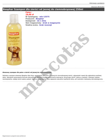 Informacje o produkcie Utworzono 08-03-2017 Beaphar Szampon dla sierści od jasnej do ciemnobrązowej 250ml Cena : 18,00 zł co ta s Nr katalogowy : mls-13575 Producent : Beaphar Dostępność : do 1 dnia Stan magazynowy : brak w magazynie Średnia ocena : brak recenzji m as Aloesowy szampon dla psów o sierści od jasnej do ciemnobrązowej Delikatny szampon aloesowy Beaphar Aloe Vera, opracowany dla psów od jasnej do ciemnobrązowej sierści, odpowiedni nawet dla najbardziej wrażliwej skóry. Specjalnie opracowana formuła intensyfikuje naturalną barwę umaszczenia zwierzęcia, utrzymując sierść i skórę w czystości. Szampon ułatwia rozczesywanie, nadaje sierści piękny połysk. Zawarty w szamponie aloes zapewnia naturalne nawilżenie skóry, pH neutralne, testowany dermatologicznie. Wygenerowano w programie www.oscGold.com