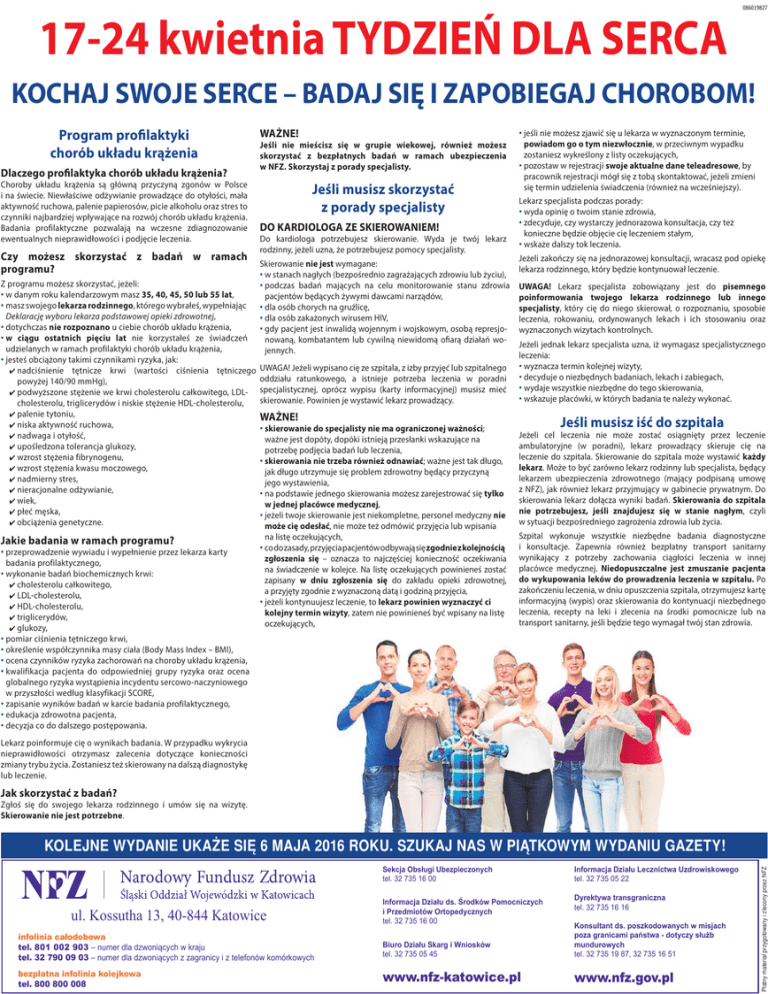 086019827 17-24 kwietnia TYDZIEŃ DLA SERCA KOCHAJ SWOJE SERCE – BADAJ SIĘ I ZAPOBIEGAJ CHOROBOM! Program profilaktyki chorób układu krążenia Dlaczego profilaktyka chorób układu krążenia? Choroby układu krążenia są główną przyczyną zgonów w Polsce i na świecie. Niewłaściwe odżywianie prowadzące do otyłości, mała aktywność ruchowa, palenie papierosów, picie alkoholu oraz stres to czynniki najbardziej wpływające na rozwój chorób układu krążenia. Badania profilaktyczne pozwalają na wczesne zdiagnozowanie ewentualnych nieprawidłowości i podjęcie leczenia. Czy możesz skorzystać z badań w ramach programu? Z programu możesz skorzystać, jeżeli: w danym roku kalendarzowym masz 35, 40, 45, 50 lub 55 lat, masz swojego lekarza rodzinnego, którego wybrałeś, wypełniając Deklarację wyboru lekarza podstawowej opieki zdrowotnej, dotychczas nie rozpoznano u ciebie chorób układu krążenia, w ciągu ostatnich pięciu lat nie korzystałeś ze świadczeń udzielanych w ramach profilaktyki chorób układu krążenia, jesteś obciążony takimi czynnikami ryzyka, jak: ✔ nadciśnienie tętnicze krwi (wartości ciśnienia tętniczego powyżej 140/90 mmHg), ✔ podwyższone stężenie we krwi cholesterolu całkowitego, LDLcholesterolu, triglicerydów i niskie stężenie HDL-cholesterolu, ✔ palenie tytoniu, ✔ niska aktywność ruchowa, ✔ nadwaga i otyłość, ✔ upośledzona tolerancja glukozy, ✔ wzrost stężenia fibrynogenu, ✔ wzrost stężenia kwasu moczowego, ✔ nadmierny stres, ✔ nieracjonalne odżywianie, ✔ wiek, ✔ płeć męska, ✔ obciążenia genetyczne. Jakie badania w ramach programu? przeprowadzenie wywiadu i wypełnienie przez lekarza karty badania profilaktycznego, w ykonanie badań biochemicznych krwi: ✔ cholesterolu całkowitego, ✔ LDL-cholesterolu, ✔ HDL-cholesterolu, ✔ triglicerydów, ✔ glukozy, pomiar ciśnienia tętniczego krwi, określenie współczynnika masy ciała (Body Mass Index – BMI), ocena czynników ryzyka zachorowań na choroby układu krążenia, k walifikacja pacjenta do odpowiedniej grupy ryzyka oraz ocena globalnego ryzyka wystąpienia incydentu sercowo-naczyniowego w przyszłości według klasyfikacji SCORE, zapisanie wyników badań w karcie badania profilaktycznego, edukacja zdrowotna pacjenta, decyzja co do dalszego postępowania. WAŻNE! Jeśli nie mieścisz się w grupie wiekowej, również możesz skorzystać z bezpłatnych badań w ramach ubezpieczenia w NFZ. Skorzystaj z porady specjalisty. Jeśli musisz skorzystać z porady specjalisty DO KARDIOLOGA ZE SKIEROWANIEM! Do kardiologa potrzebujesz skierowanie. Wyda je twój lekarz rodzinny, jeżeli uzna, że potrzebujesz pomocy specjalisty. Skierowanie nie jest wymagane: w stanach nagłych (bezpośrednio zagrażających zdrowiu lub życiu), podczas badań mających na celu monitorowanie stanu zdrowia pacjentów będących żywymi dawcami narządów, dla osób chorych na gruźlicę, dla osób zakażonych wirusem HIV, gdy pacjent jest inwalidą wojennym i wojskowym, osobą represjonowaną, kombatantem lub cywilną niewidomą ofiarą działań wojennych. UWAGA! Jeżeli wypisano cię ze szpitala, z izby przyjęć lub szpitalnego oddziału ratunkowego, a istnieje potrzeba leczenia w poradni specjalistycznej, oprócz wypisu (karty informacyjnej) musisz mieć skierowanie. Powinien je wystawić lekarz prowadzący. jeśli nie możesz zjawić się u lekarza w wyznaczonym terminie, powiadom go o tym niezwłocznie, w przeciwnym wypadku zostaniesz wykreślony z listy oczekujących, pozostaw w rejestracji swoje aktualne dane teleadresowe, by pracownik rejestracji mógł się z tobą skontaktować, jeżeli zmieni się termin udzielenia świadczenia (również na wcześniejszy). Lekarz specjalista podczas porady: wyda opinię o twoim stanie zdrowia, zdecyduje, czy wystarczy jednorazowa konsultacja, czy też konieczne będzie objęcie cię leczeniem stałym, wskaże dalszy tok leczenia. Jeżeli zakończy się na jednorazowej konsultacji, wracasz pod opiekę lekarza rodzinnego, który będzie kontynuował leczenie. UWAGA! Lekarz specjalista zobowiązany jest do pisemnego poinformowania twojego lekarza rodzinnego lub innego specjalisty, który cię do niego skierował, o rozpoznaniu, sposobie leczenia, rokowaniu, ordynowanych lekach i ich stosowaniu oraz wyznaczonych wizytach kontrolnych. Jeżeli jednak lekarz specjalista uzna, iż wymagasz specjalistycznego leczenia: wyznacza termin kolejnej wizyty, decyduje o niezbędnych badaniach, lekach i zabiegach, wydaje wszystkie niezbędne do tego skierowania, wskazuje placówki, w których badania te należy wykonać. WAŻNE! skierowanie do specjalisty nie ma ograniczonej ważności; ważne jest dopóty, dopóki istnieją przesłanki wskazujące na potrzebę podjęcia badań lub leczenia, skierowania nie trzeba również odnawiać; ważne jest tak długo, jak długo utrzymuje się problem zdrowotny będący przyczyną jego wystawienia, na podstawie jednego skierowania możesz zarejestrować się tylko w jednej placówce medycznej, jeżeli twoje skierowanie jest niekompletne, personel medyczny nie może cię odesłać, nie może też odmówić przyjęcia lub wpisania na listę oczekujących, co do zasady, przyjęcia pacjentów odbywają się zgodnie z kolejnością zgłoszenia się – oznacza to najczęściej konieczność oczekiwania na świadczenie w kolejce. Na listę oczekujących powinieneś zostać zapisany w dniu zgłoszenia się do zakładu opieki zdrowotnej, a przyjęty zgodnie z wyznaczoną datą i godziną przyjęcia, jeżeli kontynuujesz leczenie, to lekarz powinien wyznaczyć ci kolejny termin wizyty, zatem nie powinieneś być wpisany na listę oczekujących, Jeśli musisz iść do szpitala Jeżeli cel leczenia nie może zostać osiągnięty przez leczenie ambulatoryjne (w poradni), lekarz prowadzący skieruje cię na leczenie do szpitala. Skierowanie do szpitala może wystawić każdy lekarz. Może