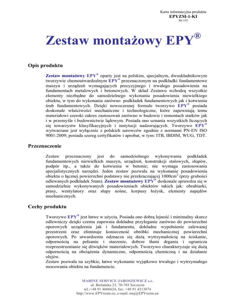 Karta informacyjna produktu EPYZM-1-KI Str.1#2 ® Zestaw montażowy EPY Opis produktu Zestaw montażowy EPY® oparty jest na polskim, specjalnym, dwuskładnikowym tworzywie chemoutwardzalnym EPY® przeznaczonym na podkładki fundamentowe maszyn i urządzeń wymagających precyzyjnego i trwałego posadowienia na fundamentach metalowych i betonowych. W skład Zestawu wchodzą wszystkie elementy niezbędne do samodzielnego wykonania posadowienia niewielkiego obiektu, w tym do wykonania zarówno podkładek fundamentowych jak i kotwienia śrub fundamentowych. Dzięki nowoczesnej formule tworzywo EPY® posiada doskonałe właściwości mechaniczne i technologiczne, które zapewniają temu materiałowi szeroki zakres zastosowań zarówno w budowie i remontach statków jak i w przemyśle i budownictwie lądowym. Posiada ono uznania wszystkich liczących się towarzystw klasyfikacyjnych i instytucji nadzorujących. Tworzywo EPY® wytwarzane jest wyłącznie z polskich surowców zgodnie z normami PN-EN ISO 9001:2009; posiada szereg certyfikatów i aprobat, w tym: ITB, IBDIM, WUG, TDT. Przeznaczenie Zestaw przeznaczony jest do samodzielnego wykonywania podkładek fundamentowych niewielkich maszyn, urządzeń, konstrukcji stalowych, słupów, podpór itp., a także do kotwienia w betonie; nie wymaga zastosowania specjalistycznych narzędzi. Jeden zestaw pozwala na wykonanie posadowienia obiektu o łącznej powierzchni podstawy nie przekraczającej 1000cm2 (przy grubości odlewanych podkładek 5mm). Zestaw montażowy EPY® doskonale sprawdza się w samodzielnie wykonywanych posadowieniach obiektów takich jak: obrabiarki, prasy, wentylatory oraz słupy nośne, korpusy łożysk, elementy napędów mechanicznych. Cechy produktu Tworzywo EPY® jest łatwe w użyciu. Posiada ono dobrą lejność i minimalny skurcz odlewniczy dzięki czemu zapewnia dokładne przyleganie zarówno do powierzchni oporowych urządzenia jak i fundamentu, dokładne wypełnienie zalewanej przestrzeni oraz eliminuje konieczność obróbki mechanicznej powierzchni oporowych. Po utwardzeniu odznacza się dużą wytrzymałością na ściskanie, odpornością na pełzanie i starzenie, dobrze tłumi drgania i ogranicza rozprzestrzenianie się dźwięków materiałowych. Tworzywo charakteryzuje się dużą odpornością na obciążenia dynamiczne, odpornością chemiczną i na działanie olejów. Zestaw pozwala na szybkie, łatwe wykonanie wyjątkowo trwałego i wytrzymałego mocowania obiektu na fundamencie. MARINE SERVICE JAROSZEWICZ s.c. ul. Bielańska 23, 70-703 Szczecin tel.:+48 91 4606624, fax: +48 91 4313074 http://www.EPYresin.eu, e-mail: [email protected] Karta informacyjna produktu EPYZM-1-KI Str.2#2 Właściwości fizyczne tworzywa EPY Liniowy wsp. rozszerzalności cieplnej Skórcz chemiczny utwardzania Wytrzymałość na ściskanie Moduł sprężystości przy ściskaniu Wytrzymałość na rozciąganie Udarność Charpy Twardość Barcola Współczynnik tarcia po stali Masa właściwa Czas życia mieszaniny (40-48) x 10-6 1/K 2 x 10-4 mm/mm 169 N/mm2 4915 N/mm2 45,9 N/mm2 6,4 kJ/m2 52 0Barcola 0,3-0,8 1,59 kg/dm3 30 min. @ 21 0C Czas utwardzania 72 godz. @ 10 0C 48 godz. @ 15 0C 24 godz. @ 20 0C Pełzanie w 70 0C 0,011 mm @ 3,4 N/mm2 0,012 mm @ 6,9 N/mm2 0,015 mm @ 13,8 N/mm2 0,058 mm @ 27,6 N/mm2 ASTM D-621 Wytrzymałość zmęczeniowa @ 10 Hz, 5 N/mm2 824 cykle @ 92 N/mm2 1805 cykli @ 80 N/mm2 3360 cykli @ 78 N/mm2 35 x 104 cykli @ 65 N/mm2 10 x 106 cykli @ 60 N/mm2 DIN 50100 Zawartość zestawu Tworzywo EPY z utwardzaczem Samoprzylepna pianka 10x10mm (inne rozmiary dostępne na zamówienie) Mieszadło Instrukcja stosowania 1,07 kg / 0,67 dm3 3 mb 1 szt. MARINE SERVICE JAROSZEWICZ s.c. ul. Bielańska 23, 70-703 Szczecin tel.:+48 91 4606624, fax: +48 91 4313074 http://www.EPYresin.eu, e-mail: [email protected] ASTM D-696 ASTM D-2566 ASTM D-695 ASTM D-695 ASTM D-638 ASTM D-256 ASTM D-2583