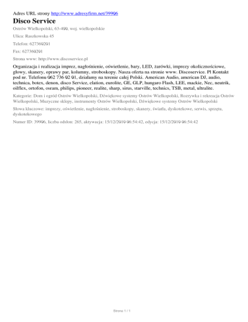 Adres URL strony http://www.adresyfirm.net/39906 Disco Service Ostrów Wielkopolski, 63-400, woj. wielkopolskie Ulica: Raszkowska 45 Telefon: 627360201 Fax: 627360201 Strona www: http://www.discoservice.pl Organizacja i realizacja imprez, nagłośnienie, oświetlenie, bary, LED, żarówki, imprezy okolicznościowe, głowy, skanery, oprawy par, kolumny, stroboskopy. Nasza oferta na stronie www. Discoservice. Pl Kontakt pod nr. Telefonu 062 736 02 01, działamy na terenie całej Polski. American Audio, american DJ, audio, technica, botex, denon, disco Service, elation, eurolite, GE, GLP, hungaro Flash, LEE, mackie, Nec, neutrik, oilflex, ortofon, osram, philips, pioneer, realite, sharp, sirus, starville, technics, TSB, metal, ultralite. Kategorie: Dom i ogród Ostrów Wielkopolski, Dźwiękowe systemy Ostrów Wielkopolski, Rozrywka i rekreacja Ostrów Wielkopolski, Muzyczne sklepy, instrumenty Ostrów Wielkopolski, Dźwiękowe systemy Ostrów Wielkopolski Słowa kluczowe: imprezy, oświetlenie, nagłośnienie, stroboskopy, skanery, światła, dyskotekowe, serwis, sprzętu, dyskotekowego Numer ID: 39906, liczba odsłon: 265, aktywacja: 15/12/2010 06:54:42, edycja: 15/12/2010 06:54:42 Strona 1 / 1