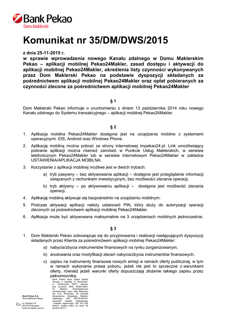 Komunikat nr 35/DM/DWS/2015 z dnia 25-11-2015 r. w sprawie wprowadzenia nowego Kanału zdalnego w Domu Maklerskim Pekao – aplikacji mobilnej Pekao24Makler, zasad dostępu i aktywacji do aplikacji mobilnej Pekao24Makler, określenia listy czynności wykonywanych przez Dom Maklerski Pekao na podstawie dyspozycji składanych za pośrednictwem aplikacji mobilnej Pekao24Makler oraz opłat pobieranych za czynności zlecone za pośrednictwem aplikacji mobilnej Pekao24Makler §1 Dom Maklerski Pekao informuje o uruchomieniu z dniem 13 października 2014 roku nowego Kanału zdalnego do Systemu transakcyjnego – aplikacji mobilnej Pekao24Makler. §2 1. Aplikacja mobilna Pekao24Makler dostępna jest na urządzenia mobilne z systemami operacyjnymi: iOS, Android oraz Windows Phone. 2. Aplikację mobilną można pobrać ze strony internetowej impekao24.pl. Link umożliwiający pobranie aplikacji można również zamówić w Punkcie Usług Maklerskich, w serwisie telefonicznym Pekao24Makler lub w serwisie internetowym Pekao24Makler w zakładce USTAWIENIA/APLIKACJA MOBILNA. 3. Korzystanie z aplikacji mobilnej możliwe jest w dwóch trybach: a) tryb pasywny – bez aktywowania aplikacji – dostępne jest przeglądanie informacji związanych z rachunkiem inwestycyjnym, bez możliwości zlecania operacji, b) tryb aktywny – po aktywowaniu aplikacji – operacji. dostępna jest możliwość zlecania 4. Aplikację mobilną aktywuje się bezpośrednio na urządzeniu mobilnym. 5. Podczas aktywacji aplikacji należy ustanowić PIN, który służy do autoryzacji operacji zleconych za pośrednictwem aplikacji mobilnej Pekao24Makler. 6. Aplikacja może być aktywowana maksymalnie na 3 urządzeniach mobilnych jednocześnie. §3 1. Dom Maklerski Pekao zobowiązuje się do przyjmowania i realizacji następujących dyspozycji składanych przez Klienta za pośrednictwem aplikacji mobilnej Pekao24Makler: a) nabycia/zbycia instrumentów finansowych na rynku zorganizowanym, b) anulowania oraz modyfikacji zleceń nabycia/zbycia instrumentów finansowych, c) zapisu na instrumenty finansowe nowych emisji w ramach oferty publicznej, w tym w ramach wykonania prawa poboru, jeżeli nie jest to sprzeczne z warunkami oferty, również jeżeli warunki oferty dopuszczają złożenie takiego zapisu przez pełnomocnika, Bank Pekao S.A. Dom Maklerski Pekao ul. Wołoska 18 02-675 Warszawa www.dm.pekao.com.pl Bank Polska Kasa Opieki Spółka Akcyjna z siedzibą w Warszawie, ul. Grzybowska 53/57, wpisany pod numerem KRS: 0000014843, do Rejestru Przedsiębiorców prowadzonego przez Sąd Rejonowy dla m.st. Warszawy, XII Wydział Gospodarczy Krajowego Rejestru Sądowego; NIP: 526-00-06-841; wysokość kapitału zakładowego i kapitału wpłaconego: 262 470 034 złotych, według stanu na dzień 28 grudnia 2012 r. d) przelewu środków pieniężnych z rachunku pieniężnego na wskazany rachunek bankowy lub inny rachunek pieniężny, którego Klient jest posiadaczem lub współposiadaczem, e) ustanowienia i anulowania przelewów cyklicznych z rachunku inwestycyjnego na uprzednio wskazany rachunek bankowy lub inny rachunek pieniężny, którego Klient jest posiadaczem lub współposiadaczem, f) definiowania i usuwania zdefiniowanych rachunków do przelewów, g) uruchomienia kredytu na nabycie instrumentów finansowych, jeżeli warunki kredytu przewidują jego uruchomienie na podstawie dyspozycji złożonej w Domu Maklerskim Pekao, h) spłaty kredytu na nabycie instrumentów finansowych, i) udostępniania informacji rynkowych, w tym notowań instrumentów finansowych, oraz narzędzi służących do ich przetwarzania w ramach zawartej z Klientem "Umowy świadczenia usługi abonamentowej przez Dom Maklerski Pekao” (Umowa abonamentowa) lub „Umowy abonenckiej" regulującej zasady udostępniania serwisów giełdowych czasu rzeczywistego, zgodnie z dostępnym zakresem danych do notowań dla aplikacji mobilnej (pakiet STANDARD, PLUS lub PRESTIGE). 2. Dom Maklerski Pekao nie realizuje dyspozycji, o których mowa w ust. 1 lit. c jeżeli tryb złożenia zapisu może mieć wpływ na jego realizację, a w szczególności w przypadku, gdy realizacja zapisów odbywa się według kolejności ich złożenia. 3. Warunkiem przyjęcia dyspozycji, o których mowa w ust. 1 jest posiadanie przez Klienta aktywnego statusu dostępu do serwisu aplikacji mobilnej. §4 1. Dom Maklerski przyjmuje dyspozycje internetowe dotyczące nabycia/zbycia instrumentów finansowych oraz dyspozycje anulowania lub modyfikacji zleceń, za pośrednictwem serwisu aplikacji mobilnej, całodobowo z wyłączeniem przerwy technicznej w godz. 23.45 – 00.15 w dni robocze. 2. Dyspozycja, na podstawie której ma zostać wykonany przelew może zostać złożona za pośrednictwem serwisu aplikacji mobilnej w godz. 07.00 – 20.00 w dni robocze. 3. Dom Maklerski Pekao zobowiązuje się przekazać do realizacji na rynek zorganizowany zlecenie brokerskie, wystawione na podstawie zlecenia Klienta złożonego nie później niż 5 minut przed zakończeniem tej fazy sesji giełdowej/dnia obrotu, na który ma być przekazane. 4. Dom Maklerski Pekao dołoży wszelkich starań w celu przekazania do realizacji zleceń złożonych po czasie określonym w ust. 3, jednak nie ponosi odpowiedzialności za ich nieprzekazanie do realizacji w ramach danej fazy sesji giełdowej/dnia obrotu. 5. Zlecenia brokerskie złożone po czasie określonym w ust. 3 i nie przekazane do realizacji w trybie ust. 4 zostaną przekazane do realizacji w kolejnej fazie sesji giełdowej/dnia obrotu, o ile nie jest to sprzeczne z regulaminami obowiązującymi na danym rynku regulowanym lub treścią zlecenia. Bank Pekao S.A. Dom Maklerski Pekao ul. Wołoska 18 02-675 Warszawa www.dm.pekao.com.pl Bank Polska Kasa Opieki Spółka Akcyjna z siedzibą w Warszawie, ul. Grzybowska 53/57, wpisany pod numerem KRS: 0000014843, do Rejestru Przedsiębiorców prowadzonego przez Sąd Rejonowy dla m.st. Warszawy, XII Wydział Gospodarczy Krajowe