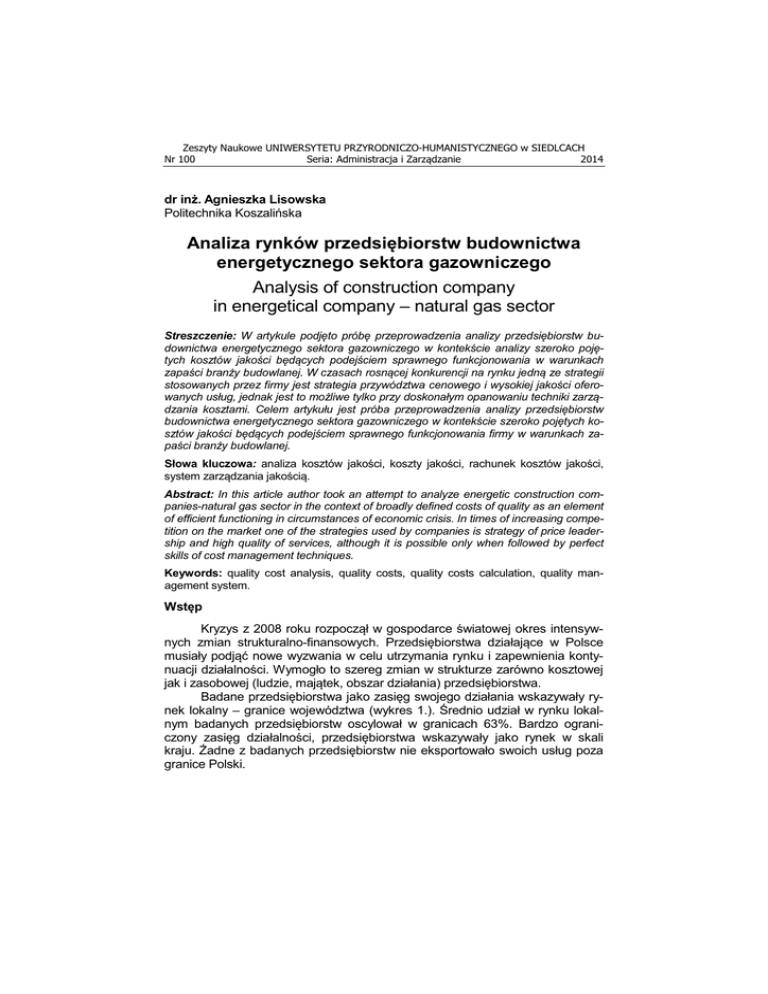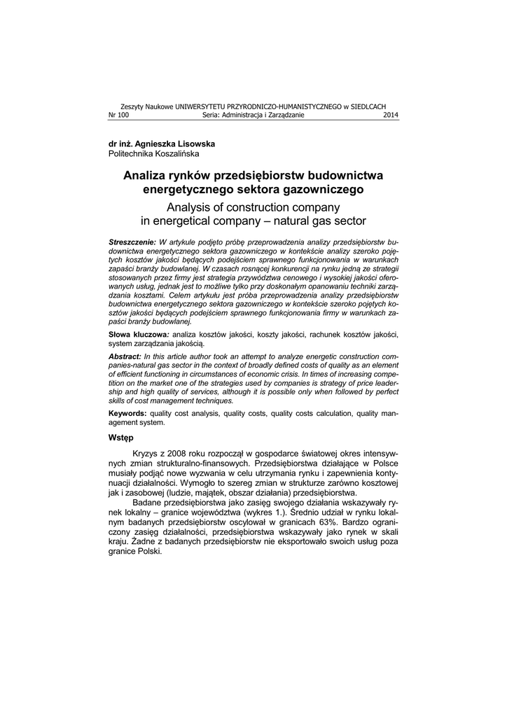 Abstract: In this article author took an attempt to analyze energetic construction companies-natural gas sector in the context of broadly defined costs of quality as an element
