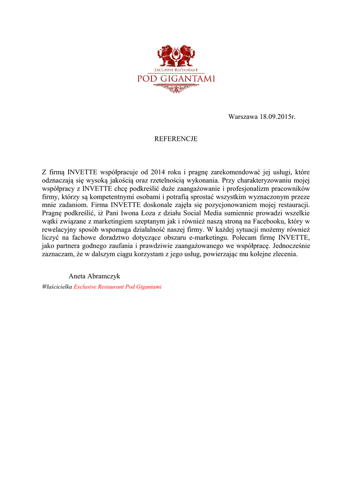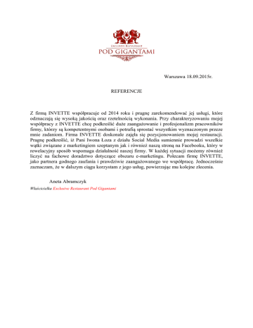 Warszawa 18.09.2015r. REFERENCJE Z firmą INVETTE współpracuje od 2014 roku i pragnę zarekomendować jej usługi, które odznaczają się wysoką jakością oraz rzetelnością wykonania. Przy charakteryzowaniu mojej współpracy z INVETTE chcę podkreślić duże zaangażowanie i profesjonalizm pracowników firmy, którzy są kompetentnymi osobami i potrafią sprostać wszystkim wyznaczonym przeze mnie zadaniom. Firma INVETTE doskonale zajęła się pozycjonowaniem mojej restauracji. Pragnę podkreślić, iż Pani Iwona Łoza z działu Social Media sumiennie prowadzi wszelkie wątki związane z marketingiem szeptanym jak i również naszą stroną na Facebooku, który w rewelacyjny sposób wspomaga działalność naszej firmy. W każdej sytuacji możemy również liczyć na fachowe doradztwo dotyczące obszaru e-marketingu. Polecam firmę INVETTE, jako partnera godnego zaufania i prawdziwie zaangażowanego we współpracę. Jednocześnie zaznaczam, że w dalszym ciągu korzystam z jego usług, powierzając mu kolejne zlecenia. Aneta Abramczyk Właścicielka Exclusive Restaurant Pod Gigantami