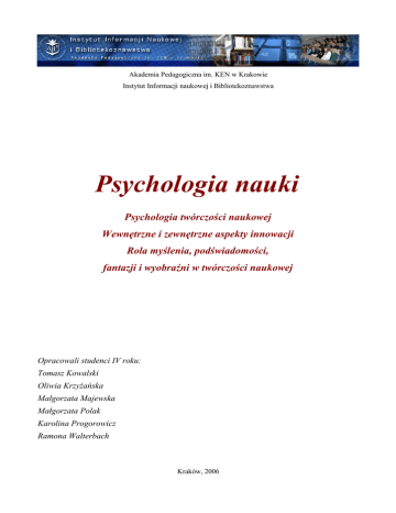 Akademia Pedagogiczna im. KEN w Krakowie Instytut Informacji naukowej i Bibliotekoznawstwa Psychologia nauki Psychologia twórczości naukowej Wewnętrzne i zewnętrzne aspekty innowacji Rola myślenia, podświadomości, fantazji i wyobraźni w twórczości naukowej Opracowali studenci IV roku: Tomasz Kowalski Oliwia Krzyżańska Malgorzata Majewska Małgorzata Polak Karolina Progorowicz Ramona Walterbach Kraków, 2006 Co to jest psychologia nauki i czym się zajmuje? Psychologia nauki to dziedzina mająca stare tradycje w psychologii. Koncentruje się ona na twórczości i odkryciu naukowym. Wykorzystuje osiągnięcia dziedzin pokrewnych: filozofii umysłu, filozofii nauki, psychologii poznawczej, metodologii psychologii, psychologii rozwoju dziecka. Wykorzystuje także osiągnięcia dziedzin bardziej odległych: psychologii sztuki i psychologii działań praktycznych. Pozostałe obszary psychologii nauki (np. ”psychologia psychologii” czy „psychologia matematyki”) stały się mniej ważne. Dlatego nasz referat dotyczący psychologii nauki będzie przede wszystkim dotyczył psychologii ogólnej nauki. Psychologia ogólna nauki zajmuje się myśleniem, rozwiązywaniem problemów, zdolnościami, osobowością, motywacją samych twórców. Pozostawia zasadniczo poza tym głównym nurtem rozważań takie obszary jak, na przykład, szczegółowa psychologia społeczna nauki. Tak rozumiana psychologia nauki jest więc dziedziną bliską psychologii twórczości, która bada tradycyjnie takie obszary jak: ✔ Proces twórczy i jego podmiotowe oraz sytuacyjne uwarunkowania ✔ Osobę twórcy ✔ Psychologiczne problemy funkcjonowania instytucjonalnego ✔ Kryteria rozwiązań twórczych ✔ Metody stymulowania twórczości ✔ Uwarunkowania społeczne twórczości Inne podejście prezentuje Jarosław Rudniański, twierdzi, że: psychologia nauki, bez względu na sposób jej pojmowania i uprawiania, zajmuje się przede wszystkim psychologią twórczości naukowej. Wielu badaczy uznaje konieczność łączenia jej z logiką nauki i historią nauki. Psychologia nauki jest dziedzina tak rozległą i tak ogólną, że powiązań możemy doszukiwać się również w innych dziedzinach nauki. Psychologia nauki, bez względu na sposób jej pojmowania i uprawiania, zajmuje się przede wszystkim psychologią twórczości naukowej. Wielu badaczy uznaje konieczność łączenia jej z logiką nauki i historią nauki.. Psychologia nauki jest dziedzina tak rozległą i tak ogólną, że powiązań możemy doszukiwać się również w innych dziedzinach nauki. W zależności od punktu widzenia można również udowodnić, że psychologia nauki stanowi część historii czy cybernetyki. Aby najlepiej zrozumieć czym tak naprawdę jest psychologia nauki należy określić jej pola badawcze. Nie jest to zadaniem prostym. Po pierwsze, nie zawsze wiadomo, gdzie tak naprawdę kończy się pole badawcze jednej nauki a zaczyna drugiej, a po drugie często do jednego pola badawczego roszczą sobie prawa badacze różnych nauk. Rozważając pola badawcze w psychologii nauki należy zadać pytanie dlaczego są one uprawiane i czemu lub komu mają służyć? Niestety dla władzy pozbawionej sympatii dla ludzi czyli dla władzy bezwzględnej i egoistycznej korzystne jest traktowanie człowieka w sposób instrumentalny. W odpowiedzi na postawione pytanie naukę możemy podzielić na: ✔ naukę podporządkowaną jest to nauka, która sterowana jest przez ośrodki władzy i przez nie finansowana. Ośrodkom tym kontrola nad nauka jest niezbędna ze względu na role jaką odgrywa w społeczeństwie ✔ naukę niepodporządkowaną – zachowana – jak pisze to Rudniański – zachowała się tu i ówdzie. Nawiązuje on do słów Joel'a de Romary, który nową myśl przeciwstawia wszelkim formom nadużycia władzy. Również w sferze nauki. Stosując taki podział należałoby zadać sobie teraz pytanie: wobec kogo być lojalnym? Lojalność wobec nauki podporządkowanej, czyli de facto władzy naraża na utratę godności własnej i życie w niezgodzie z sumieniem. Natomiast lojalność wobec nauki niepodporządkowanej niesie za sobą problemy natury bardziej praktycznej, na ogół, brak możliwości prowadzenia badań empirycznych. Dzieląc naukę na naukę podporządkowaną i naukę niepodporządkowaną wymienić można podstawowe współczesne problemy badawcze psychologii i socjologii nauki: 1. problem prawdy w nauce oraz warunków, w których dążenie do prawdy można realizować. Problem ten należy do socjologii nauki (w szerokim znaczeniu), natomiast do psychologii należy tylko odpowiedź na pytanie: dlaczego uczony w określonych warunkach mówi lub pisze nieprawdę? Jakie są cechy osobowości uczonego, wskutek których poddaje się on presji zewnętrznej? 2. problem kariery uczonego oraz decydujących o rodzaju kariery kryteriach wartości moralnych – wydaje się być normalnym, że uczony stara się o tzw. pierwszeństwo odkrycia, prestiż, sławę czy możliwie wysoki stopień dobrobytu. Wskutek tego ośrodki władzy posiadają ułatwione zadanie w przypadku manipulacji uczonym, stosując do tego niezbyt wyrafinowane metody potęgowania potrzeb nieelementarnych czy też potrzeb ekspansji. Dlatego do psychologii należy głównie zbadanie faktu jakie naczelne normy moralne są realizowane w życiu uczonego i co wpływa na to, że właśnie takie a inne normy są realizowane. Reasumując: u źródła tego znajdują się, często zawarte tylko implicite w różnych wypowiedziach, określone kryteria wartości moralnych. 3. problem wartościowania podświadomego i świadomego, jakiego dokonuje uczony, wybierając problemy i metody badawcze, poddając jakościowej lub ilościowej obróbce dane surowe i wreszcie relacjonując swoje twierdzenia w określony sposób. Wartościowanie świadome jak i częściowo świadome, odgrywa dużą rolę w pracy badawczej. Jednakże rola ta staje się negatywna, gdy uczony